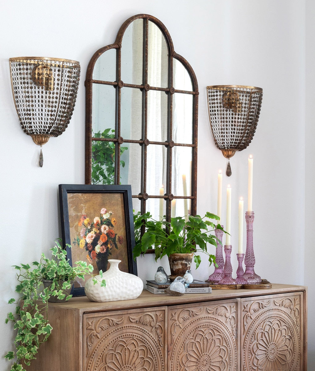 The Palermo Iron Mirror is an oversized stunner with magnificent details. From its scalloped top to the iron crisscross pattern, this antiqued mirror is a brilliant piece that will add reflection and grandeur to any space. The formal shape allows this piece to blend seamlessly into elaborate décor, while its iron material pairs well with masculine urban furnishings or modern homestead decorations. The Palermo Iron Mirror is as versatile in its placement as it is in its design styling. Lean this large piece against the wall for an elevated floor length option or hang it on the wall above an entry table or console for a dazzling display.