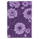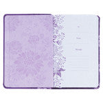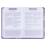 Large heat-debossed flowers accented with lilac fill the back cover of the purple faux leather devotional for girls and wrap around the spine to meet the title on the front cover. The title is gold-foiled and presented in a multi-font design.