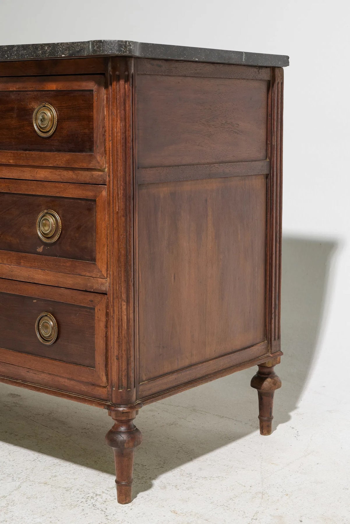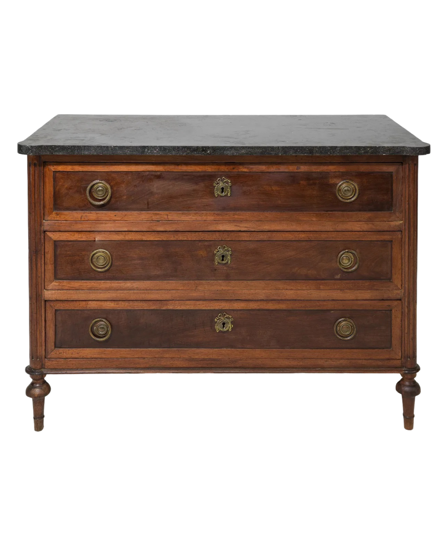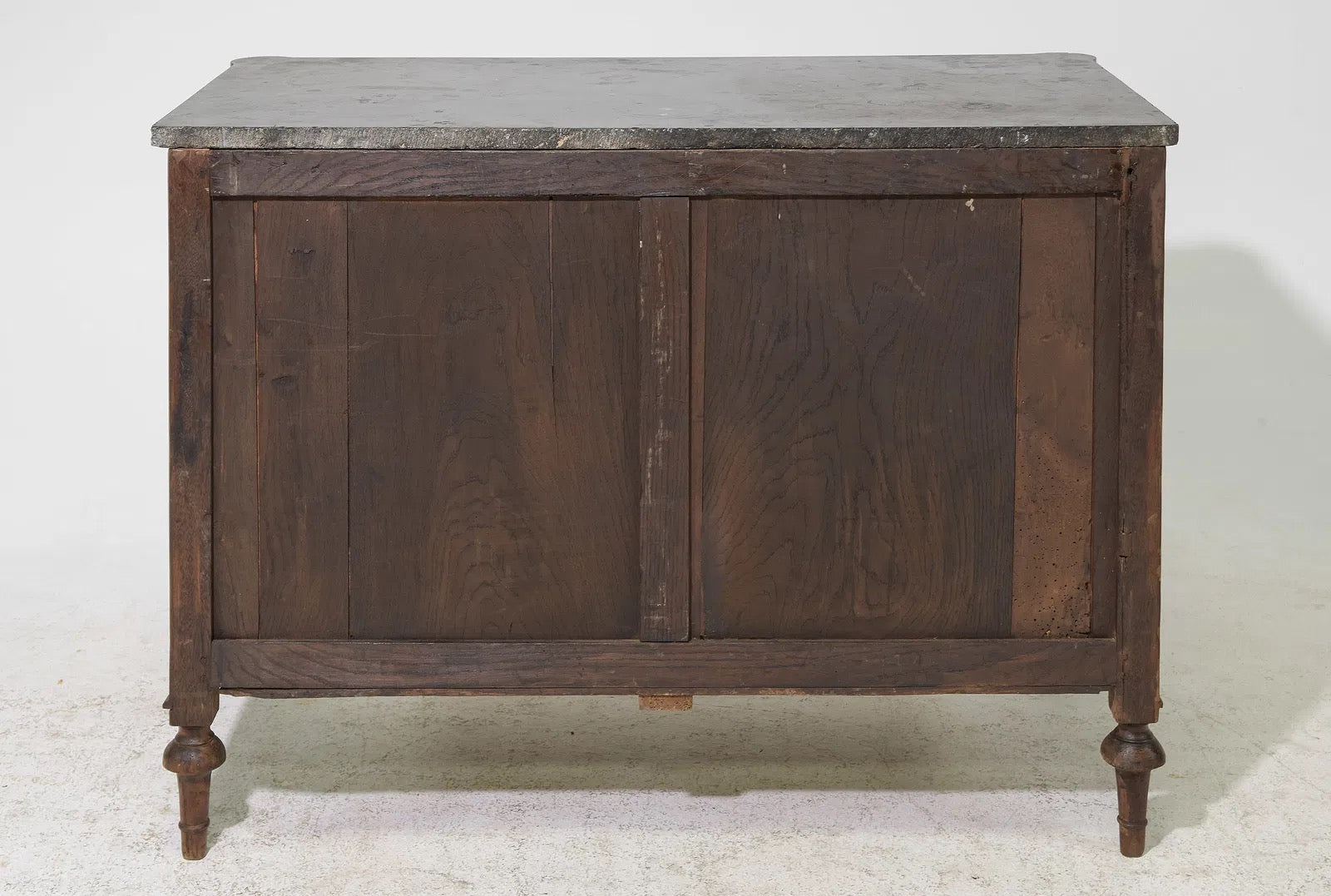 Elevate your living space with this Antique French Louis XVI Style Chest from the early 1900's, featuring a sophisticated grey marble top that adds timeless elegance. Its three spacious drawers offer practical storage while showcasing exquisite craftsmanship inspired by classic French design. Perfect for adding a touch of refined charm and functionality to any room. Measures: 33.5 in tall x 45 x 22.5.