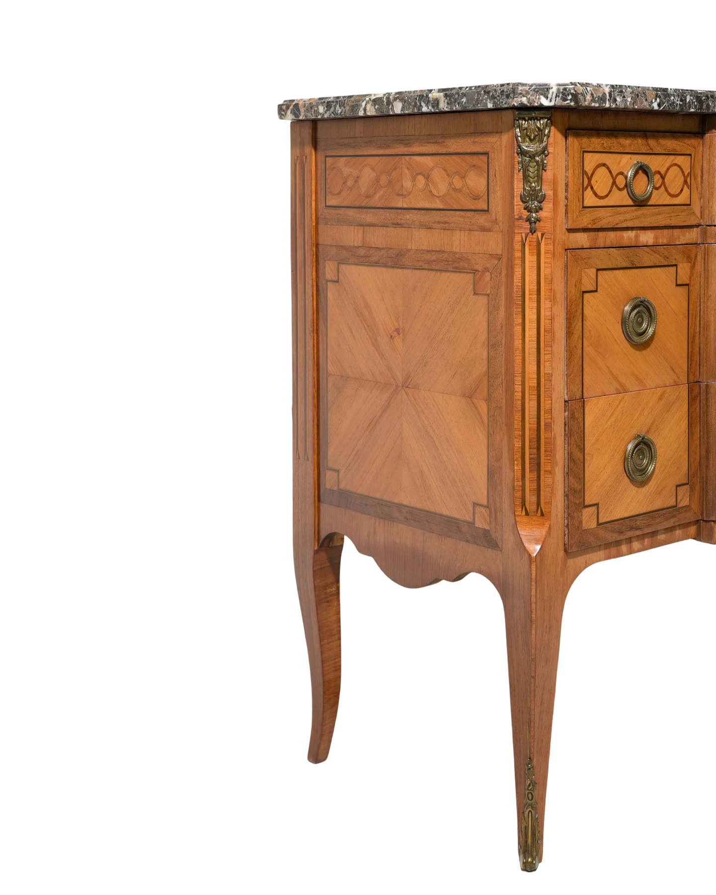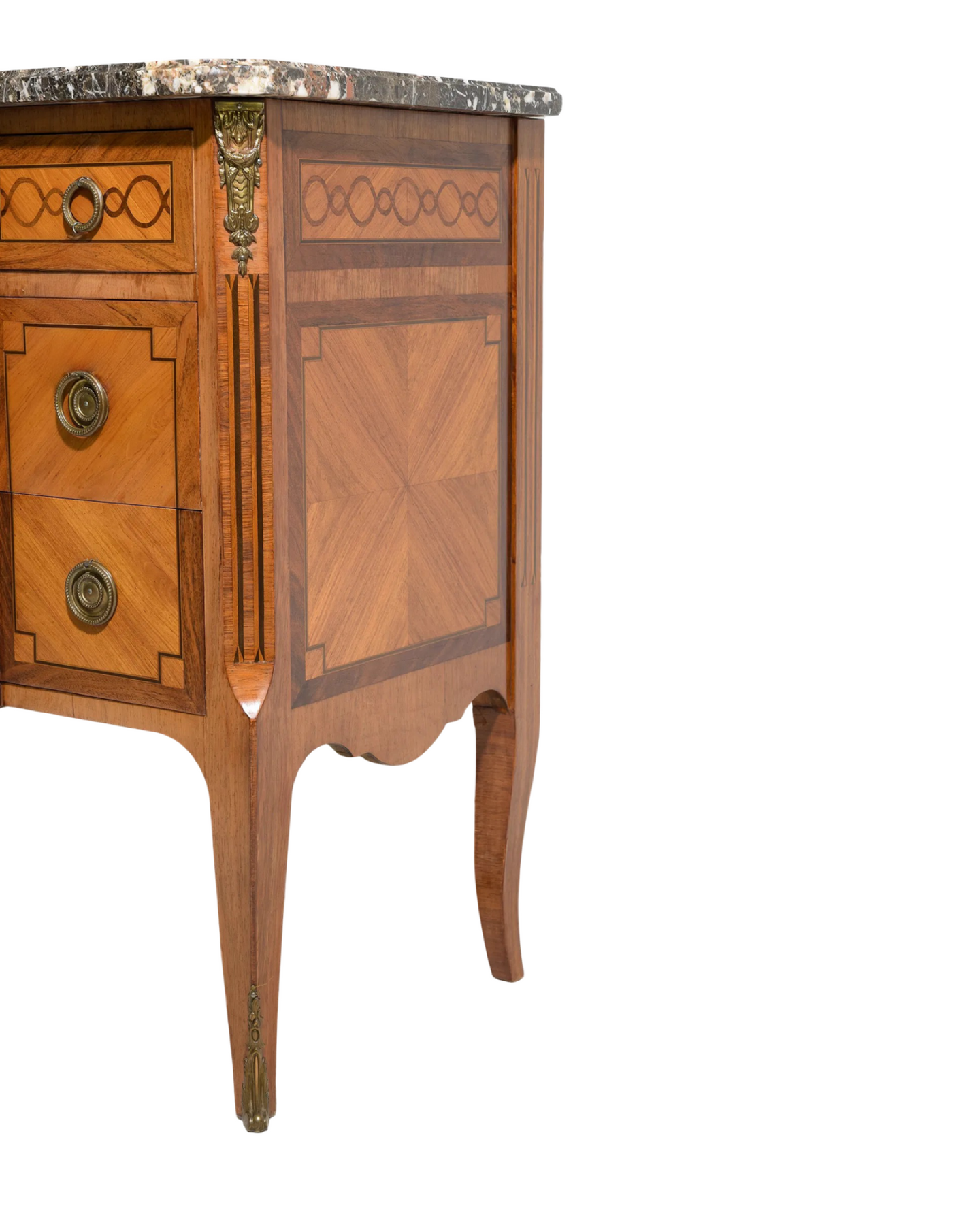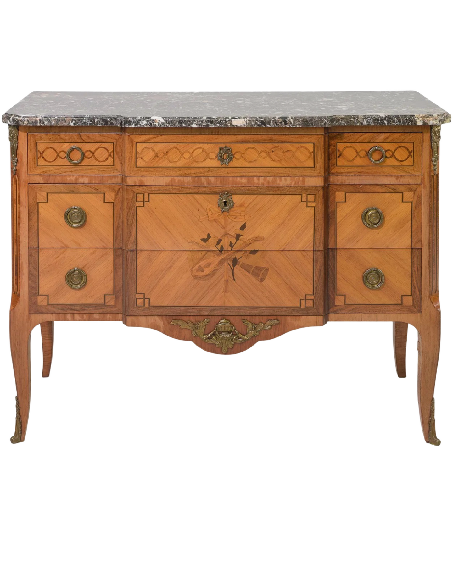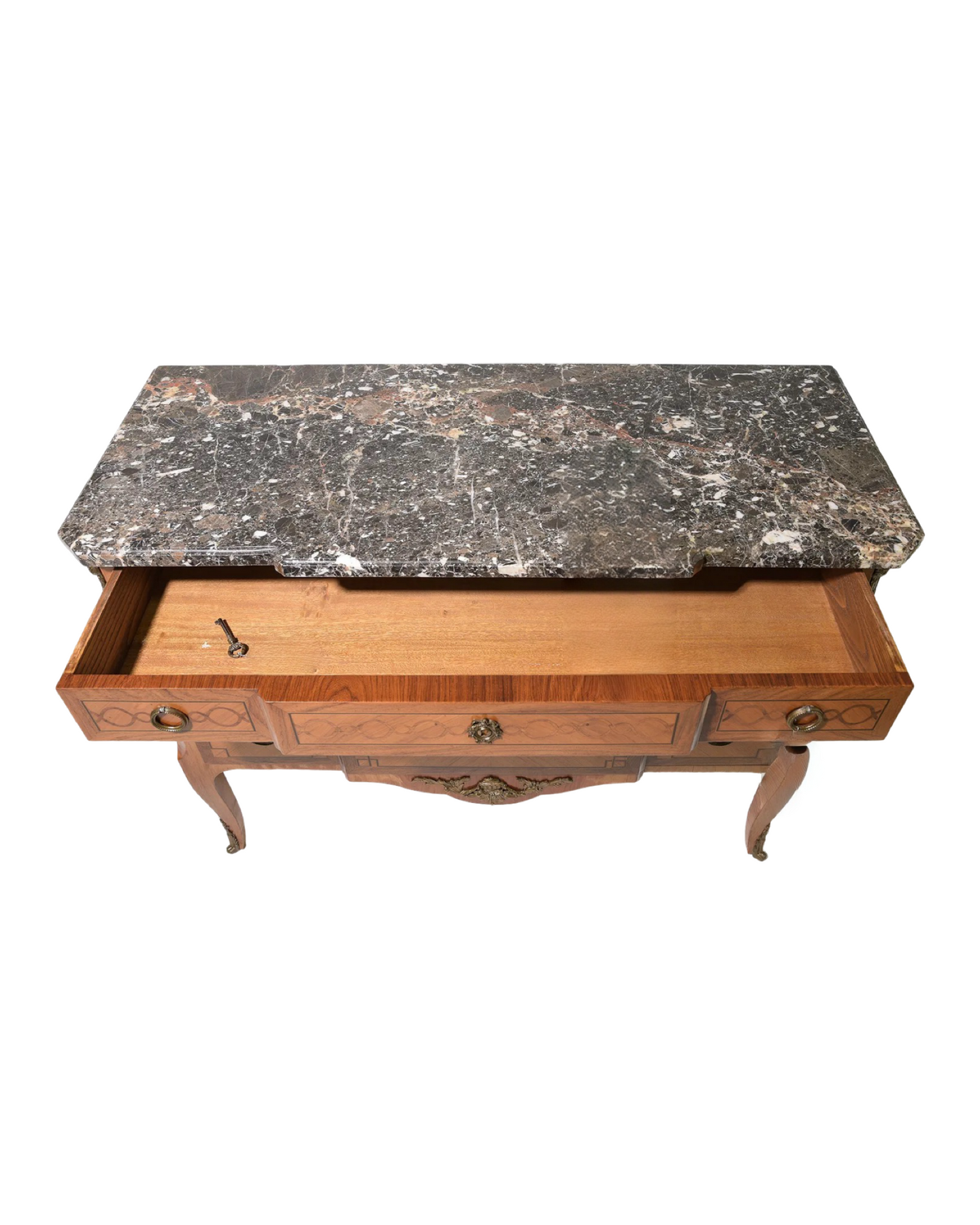 Elevate your interior with this exquisite Antique Louis XV Style Marble Top Chest from circa 1920. Featuring intricate marquetry and refined ormolu accents, this elegant piece exemplifies timeless craftsmanship and sophisticated design. Its graceful curves and polished marble surface offer both luxurious storage and a distinguished statement worthy of any refined space. Measures: 34.5" x 45.5" x 19.5".