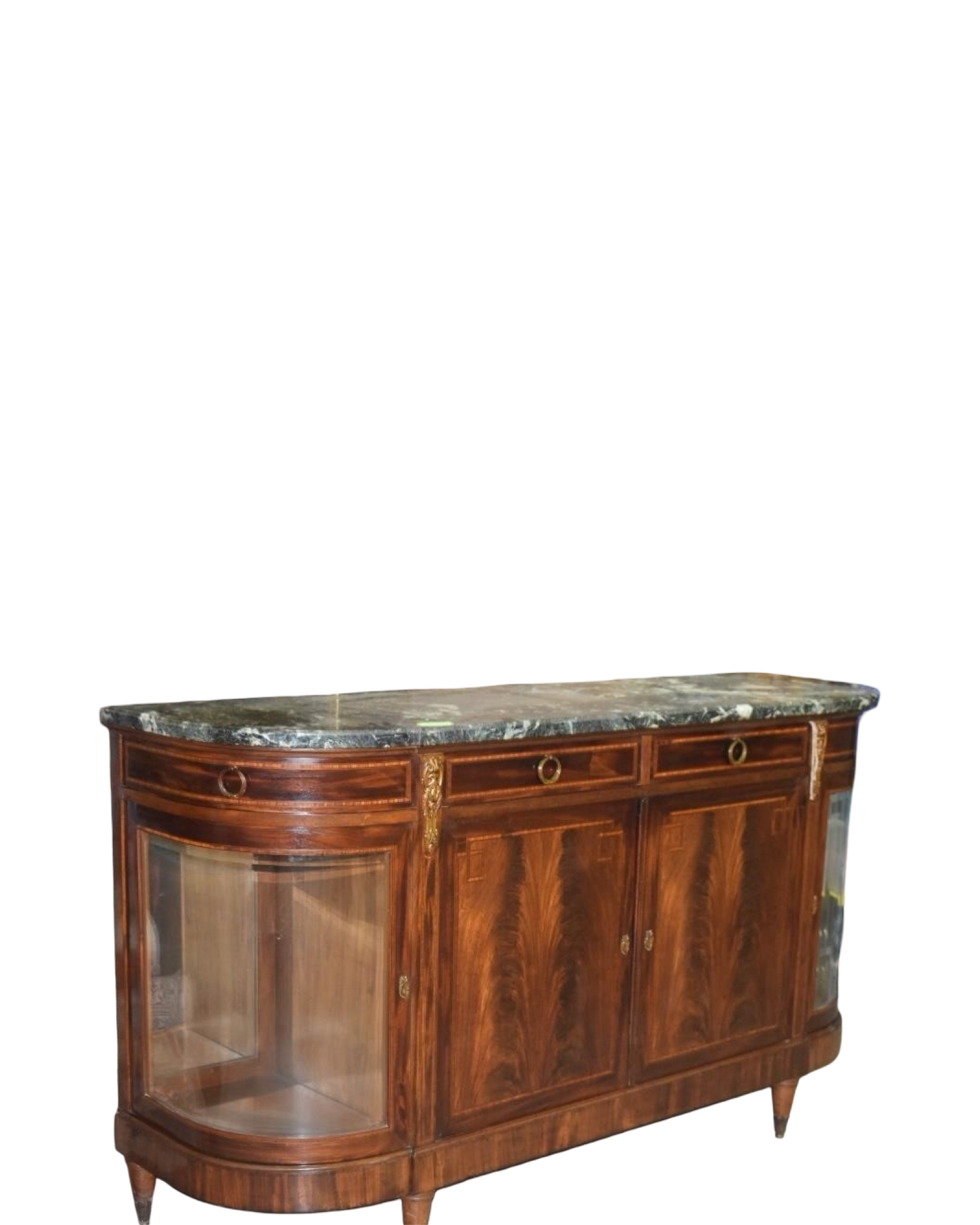 This exquisite Louis XVI buffet showcases the elegance of 18th-century French design. Crafted from flame mahogany with a luxurious marble top, it features curved bevel glass doors that beautifully display your finest china and collectibles. The refined proportions and detailed craftsmanship make it a stunning focal point for dining rooms or living spaces. Perfect for those who appreciate authentic antique furniture and timeless European style. Measures 41" high x 73" wide x 22" deep, c. 1910.