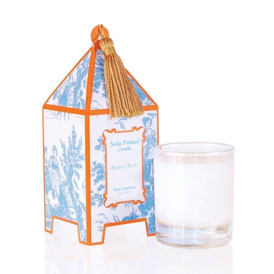 Bring a touch of Parisian charm to any room with this delightful mini pagoda box candle. Adorned with classic French tulip toile patterns, it's a petite treasure that packs a fragrant punch. Perfect for gifting, displaying on a shelf, or tucking into a cozy corner, this whimsical candle combines timeless French elegance with a playful twist. Light it up and let the enchanting aroma transport you straight to a charming countryside cottage. Burn time: 15-20 hours.