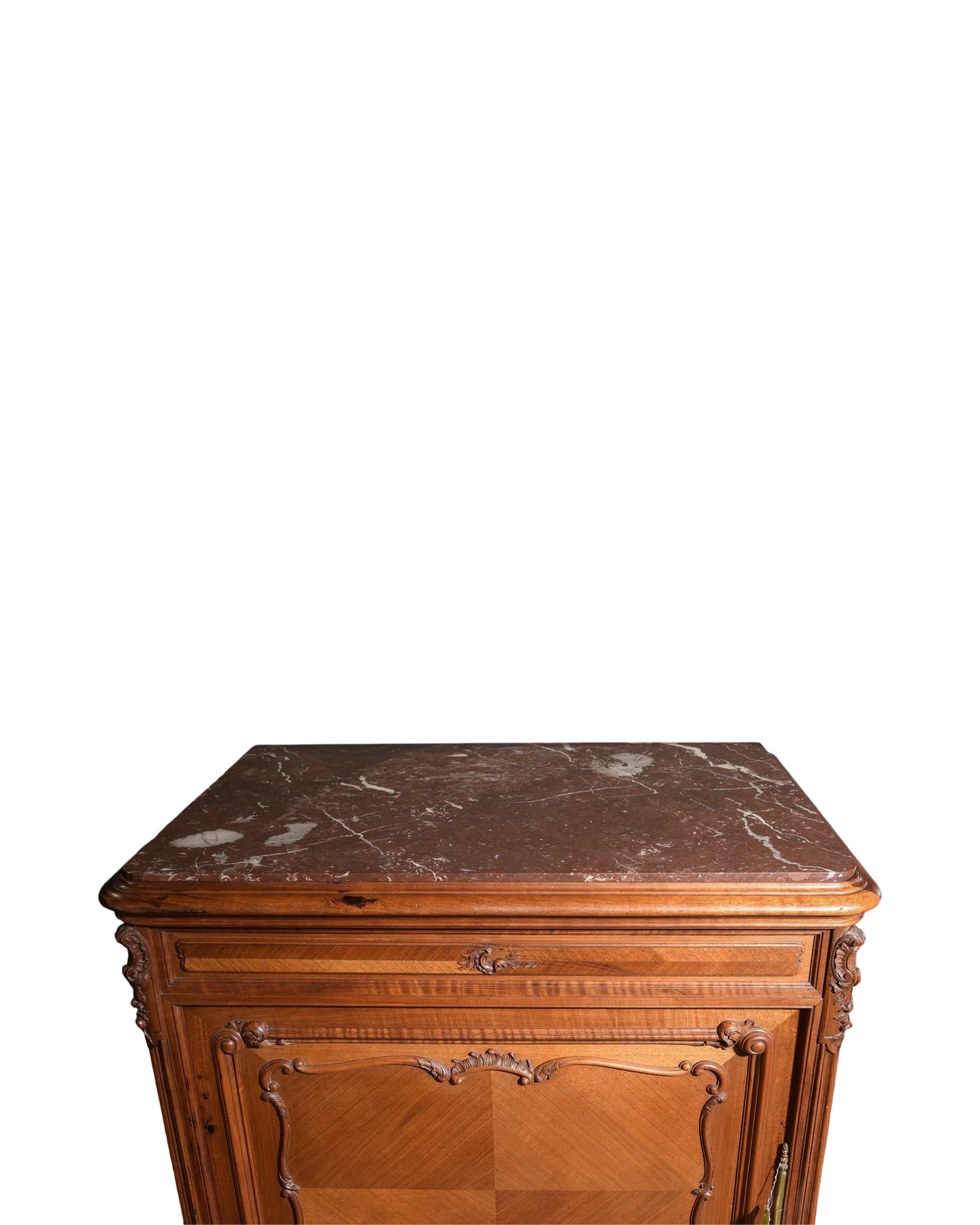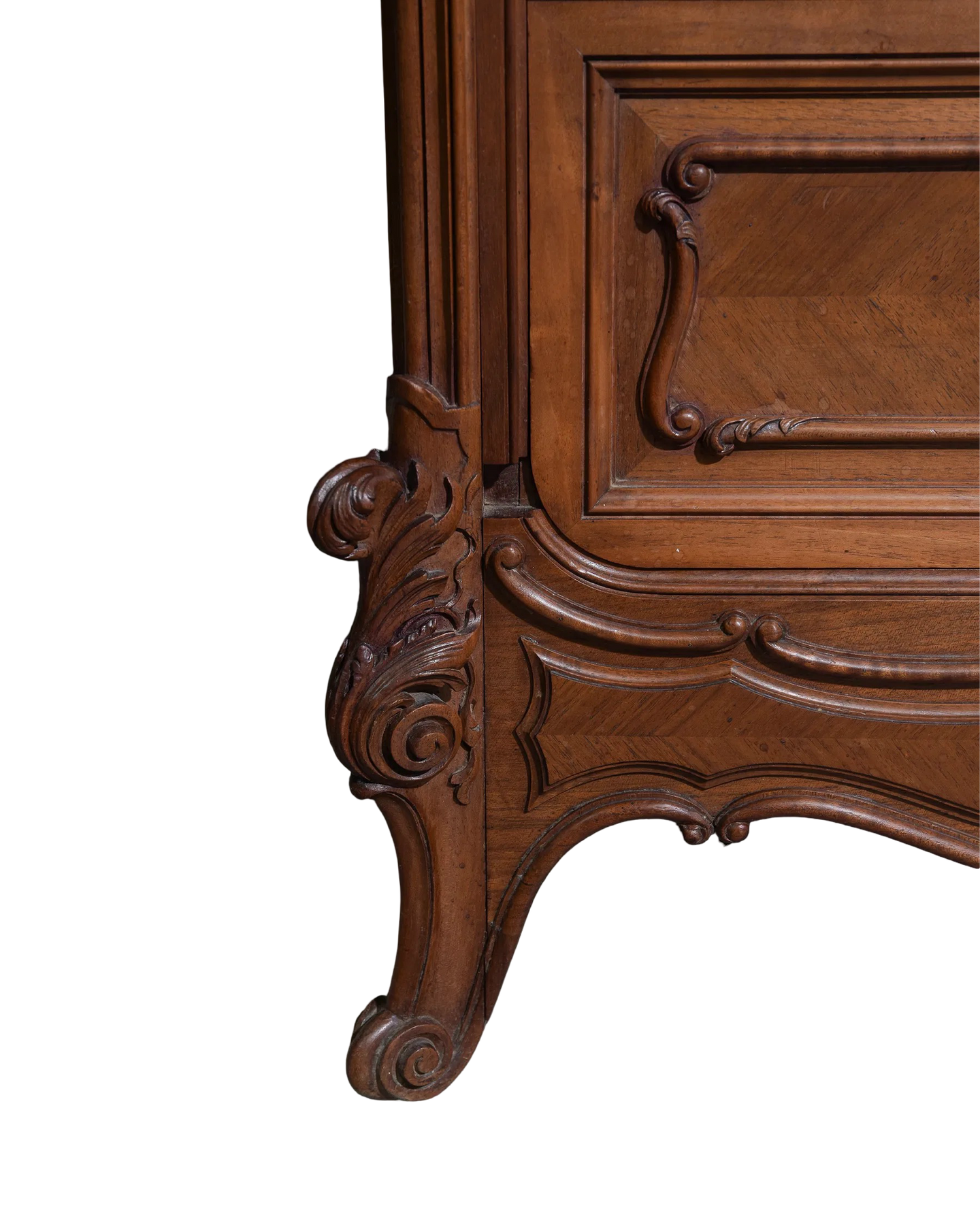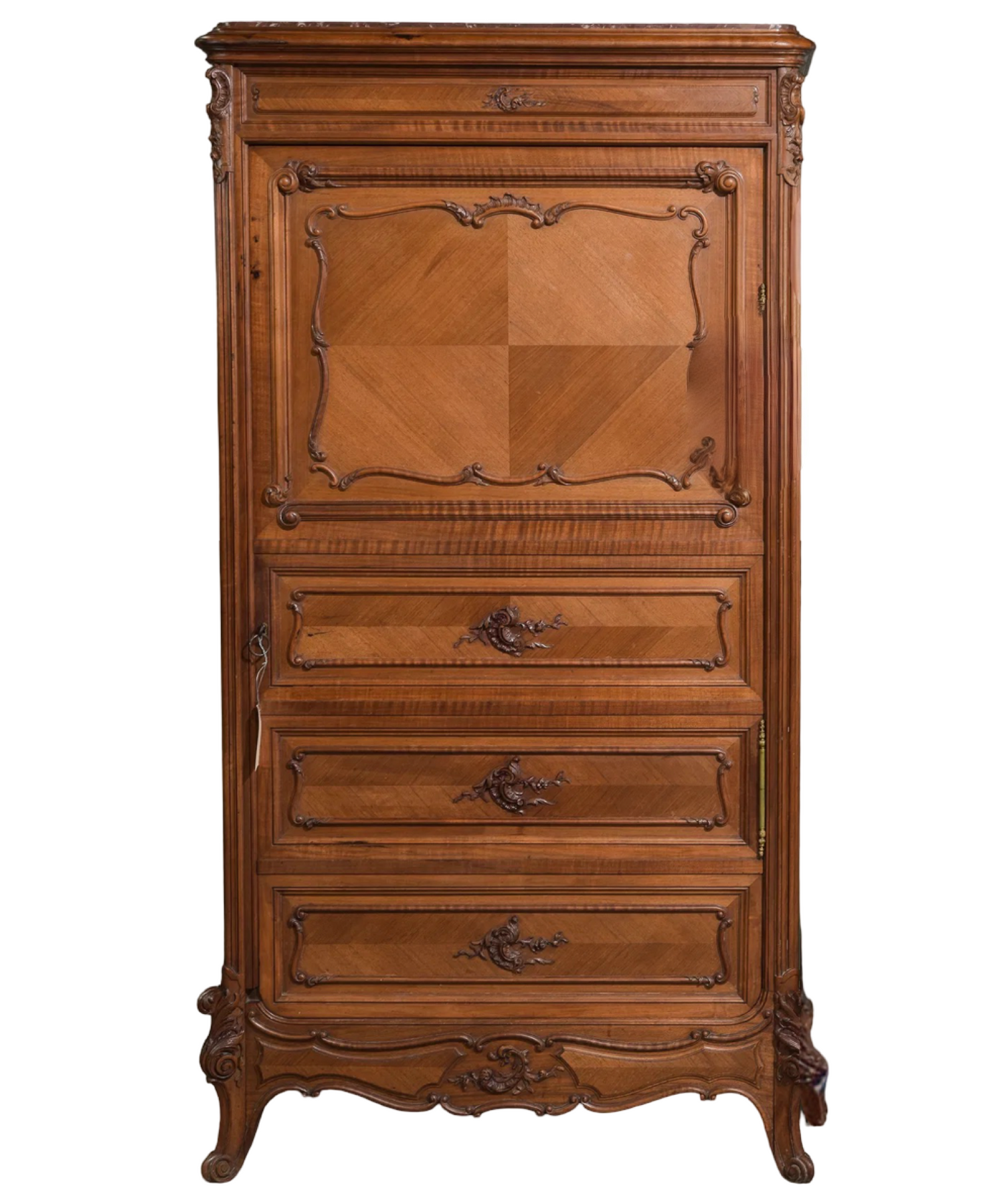 This exquisite Antique Louis XV Style Faux Secretary Abattant Cabinet, dating back to circa 1890, brings timeless elegance to any space. This tall, narrow cabinet is referred to in French as a half-armoire or, in French, as an homme-debout. Its classic design features delicate curves and intricate detailing that capture the charm of the Louis XV era. Perfect for adding a sophisticated touch to your home, this cabinet offers both style and functionality with its fold-down writing surface and ample storage. Elevate your décor with a piece that blends historical beauty and practical use seamlessly. Measures: 59 in tall x 31 x 21".