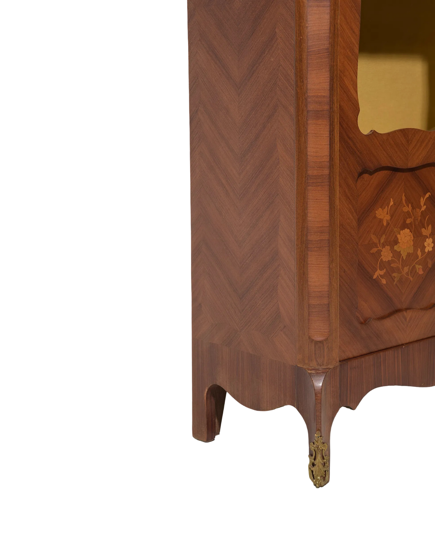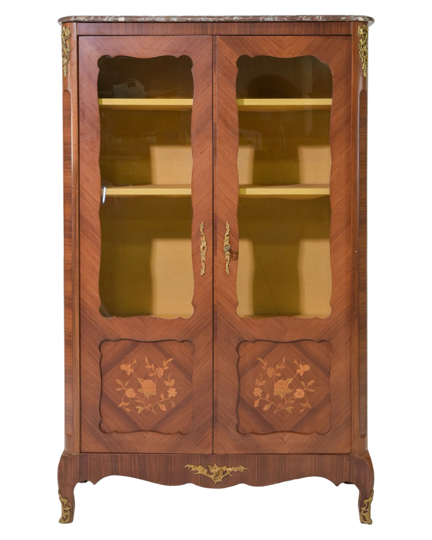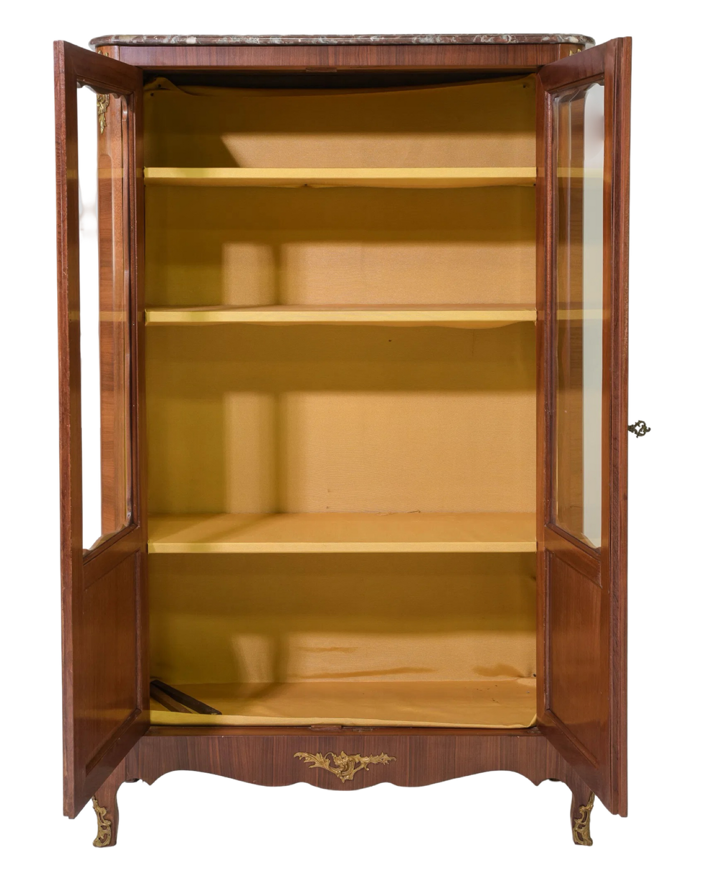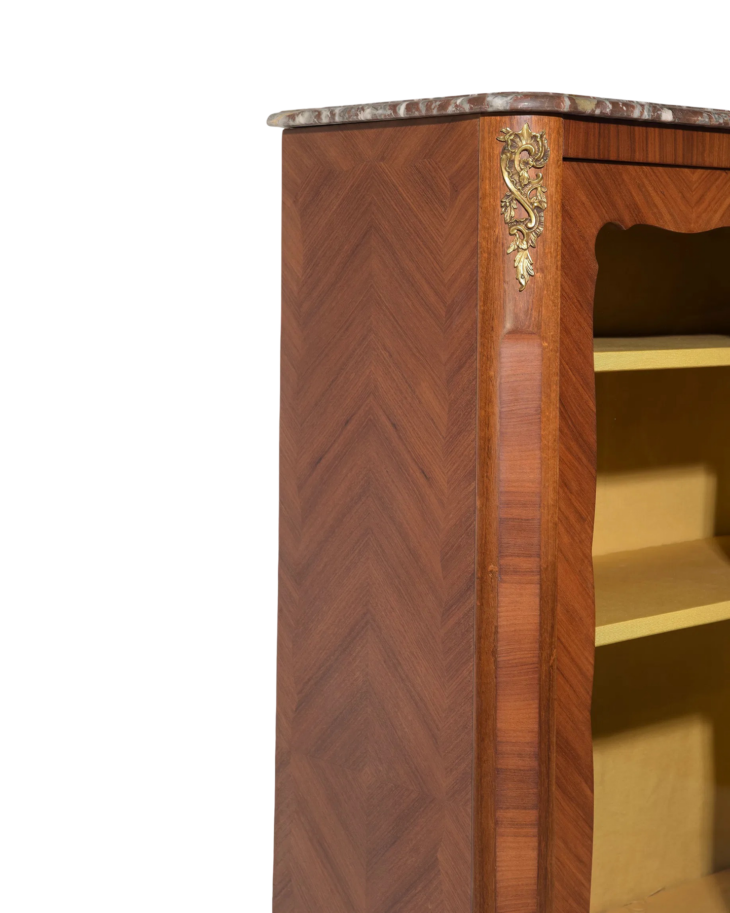 Bring a touch of timeless charm to your space with this Antique Louis XV Style Bookcase. Featuring a smooth marble top and ornate ormolu accents, it’s as sturdy as it is stunning—a perfect home for your favorite reads or treasured collectibles. Let your books lounge in style! Measures: 63 in tall x 39 x 15.