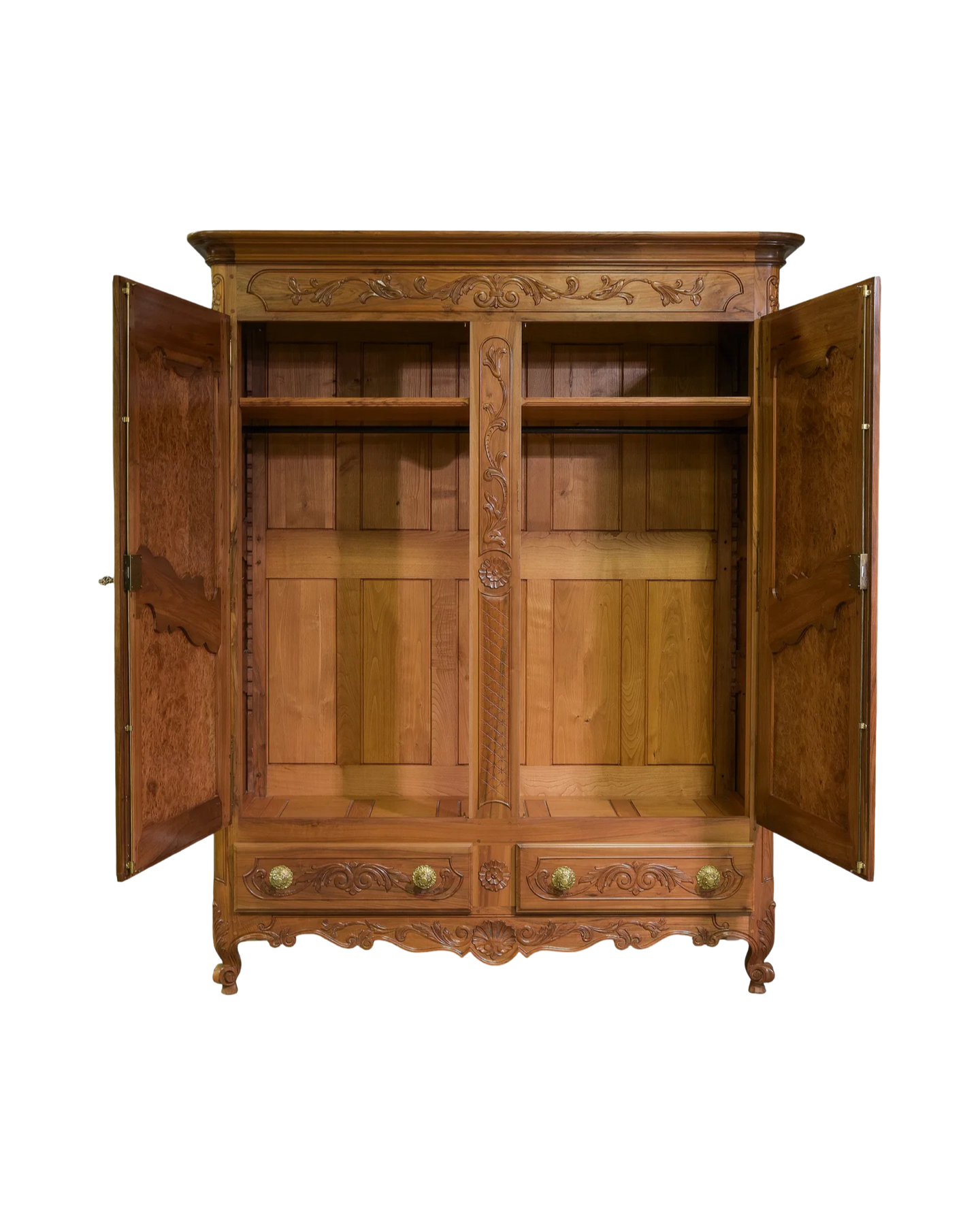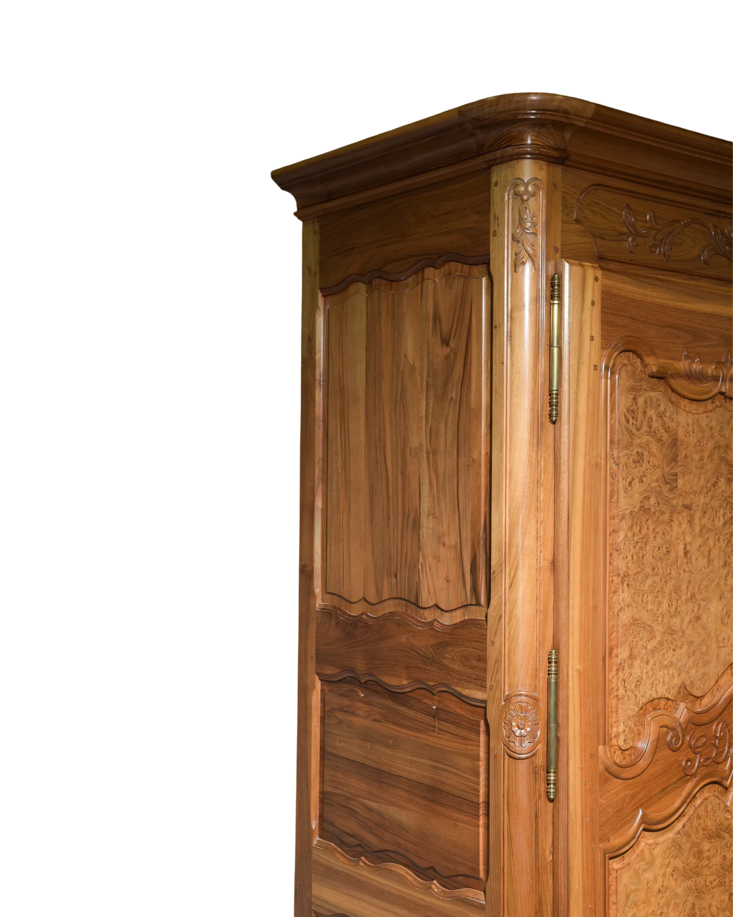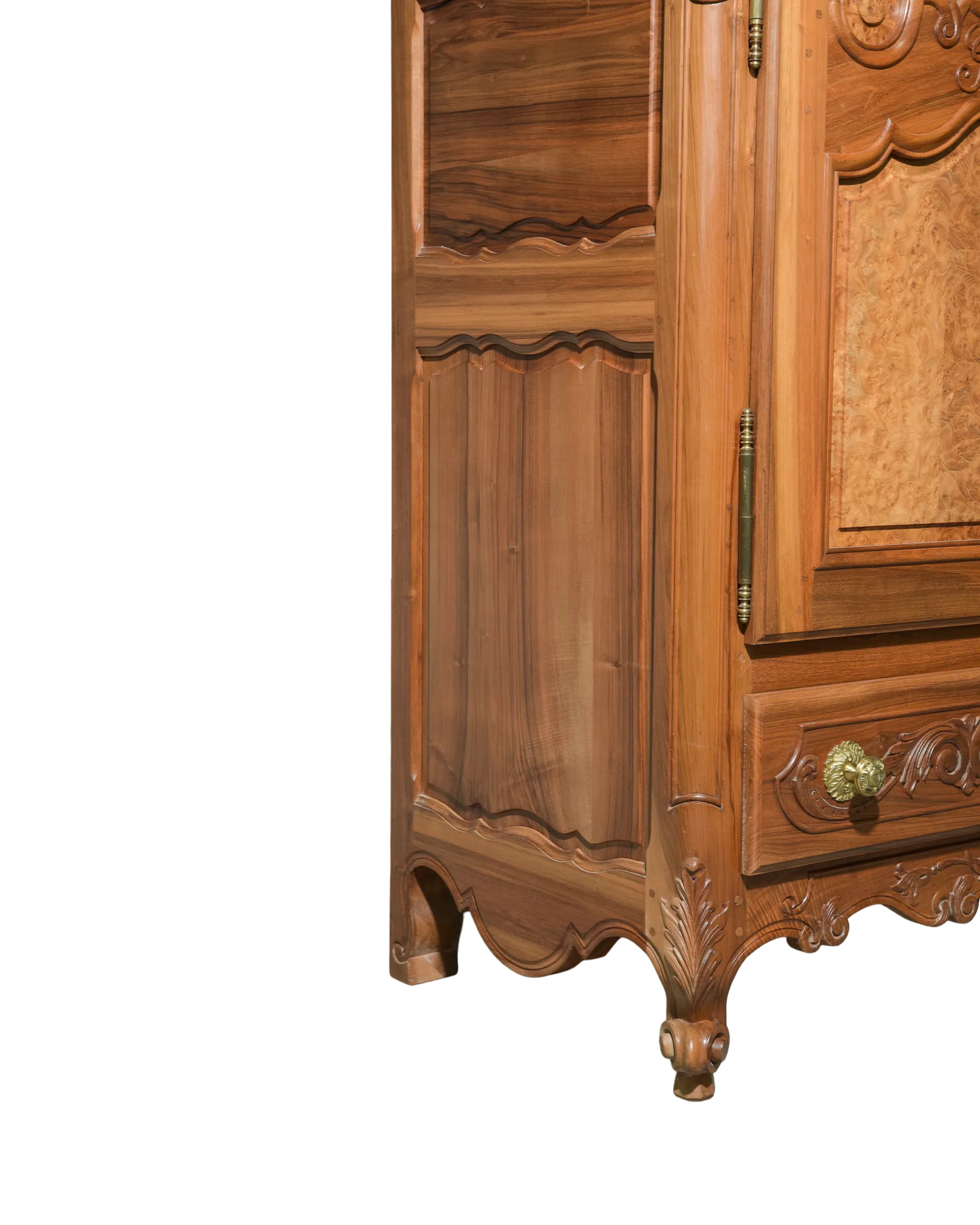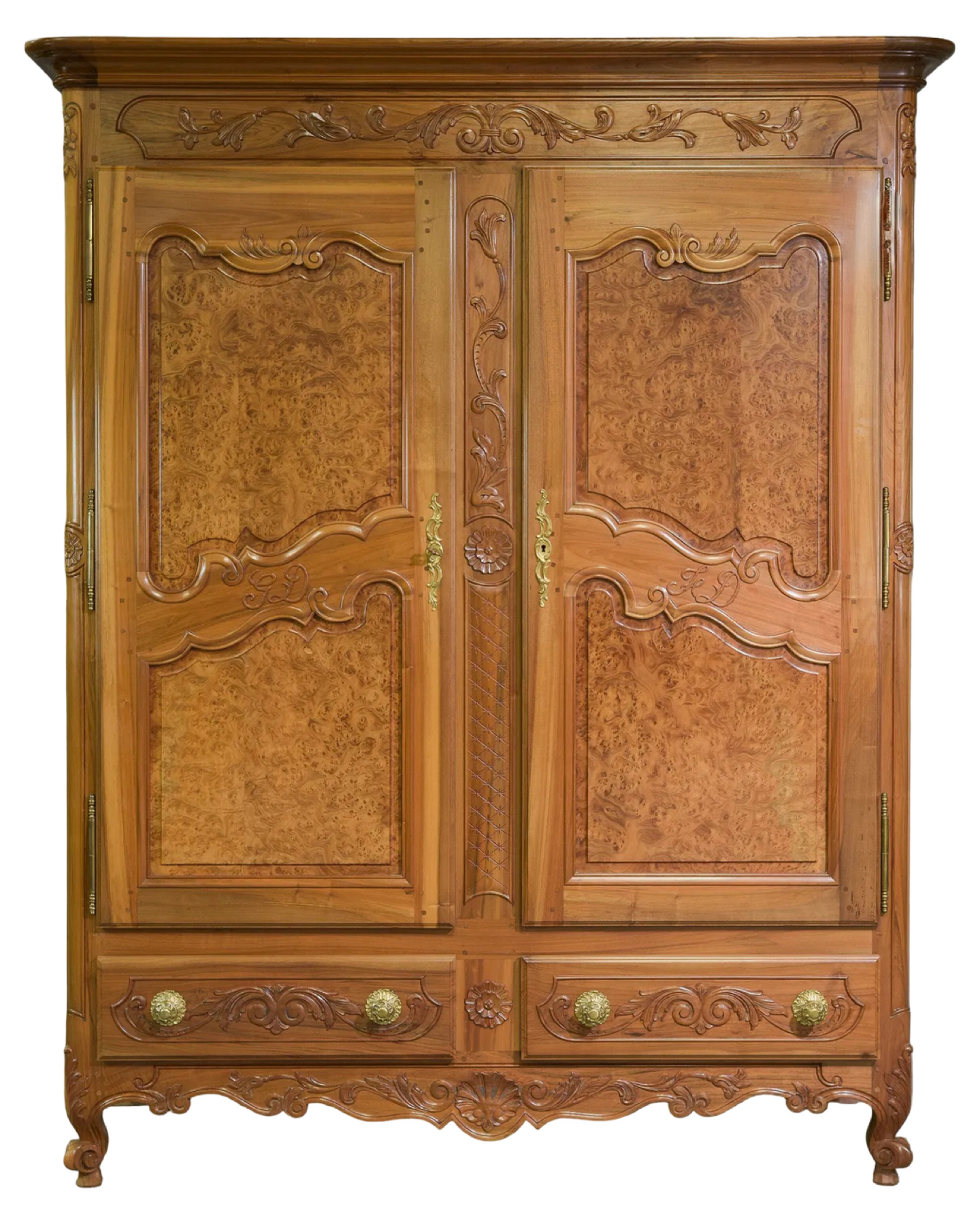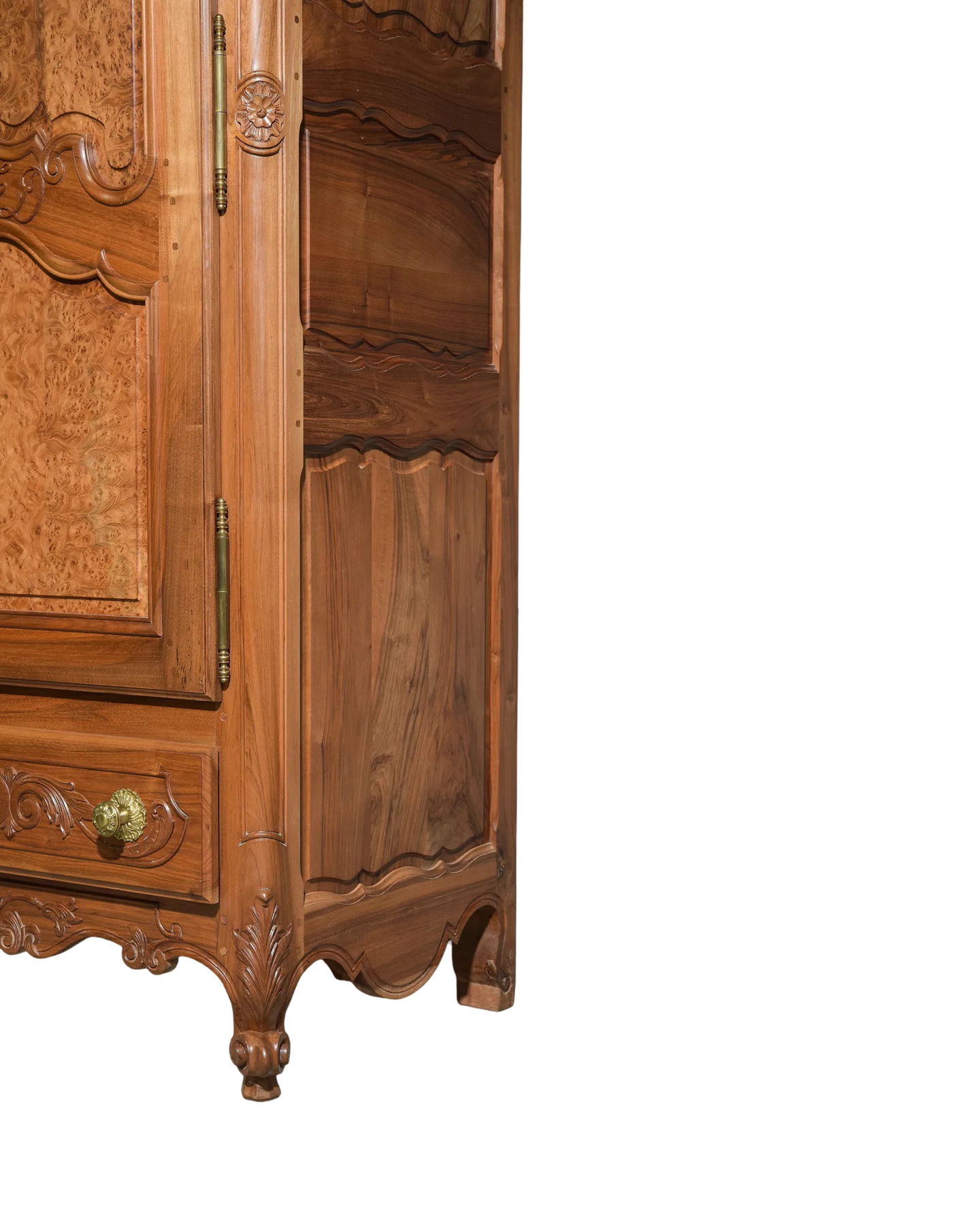 Elevate your space with this exquisite Antique Louis XV Walnut Armoire, featuring beautifully crafted burl walnut doors. This timeless piece combines elegant French design with rich walnut wood, offering both stunning aesthetics and practical storage. Perfect for adding a touch of classic sophistication to any room, its spacious interior discreetly organizes your belongings while enhancing your decor with authentic vintage charm. Measures: 82 in tall x 67.5 x 26.
