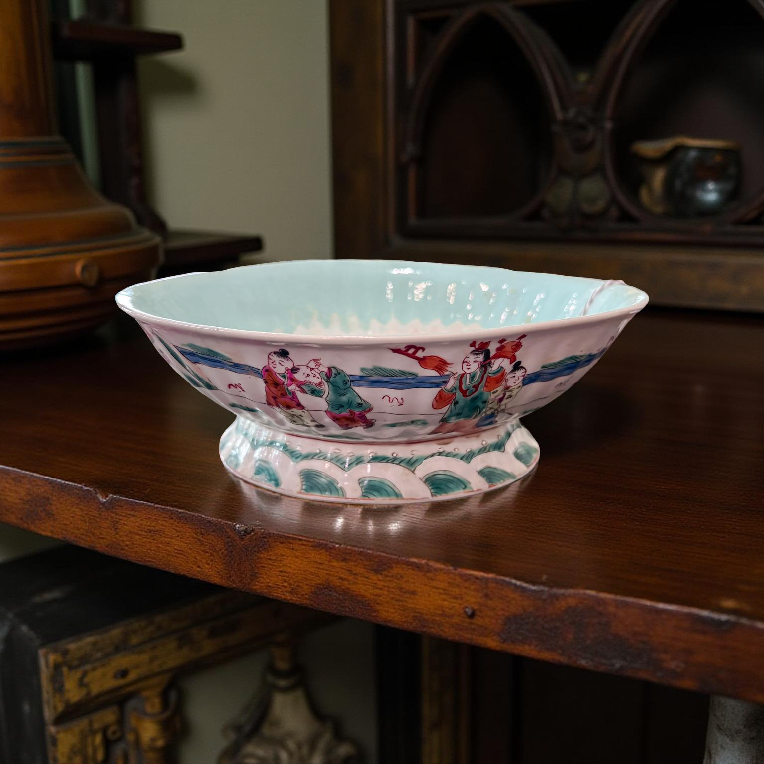 This exquisite footed chinoiserie porcelain bowl, hand-painted with vibrant colors, depicts the Eight Immortals from an ancient Chinese legend. Measuring 9 inches long, 7 inches wide, and 3 inches tall, it is traditionally used for offerings to Chinese gods. Its detailed artistry and cultural significance make it an exceptional piece for both decorative display and serious collectors of fine Asian art.