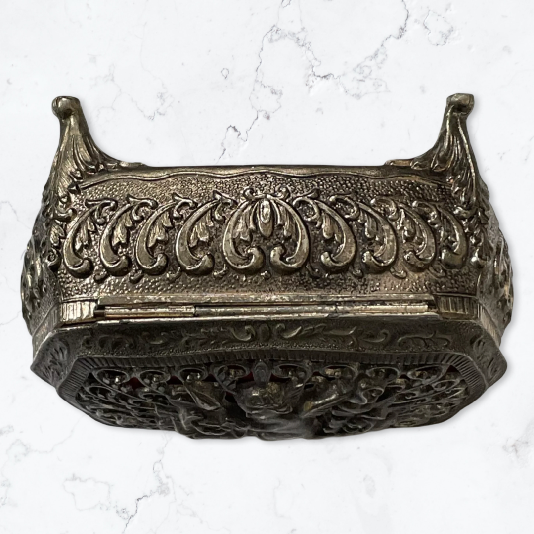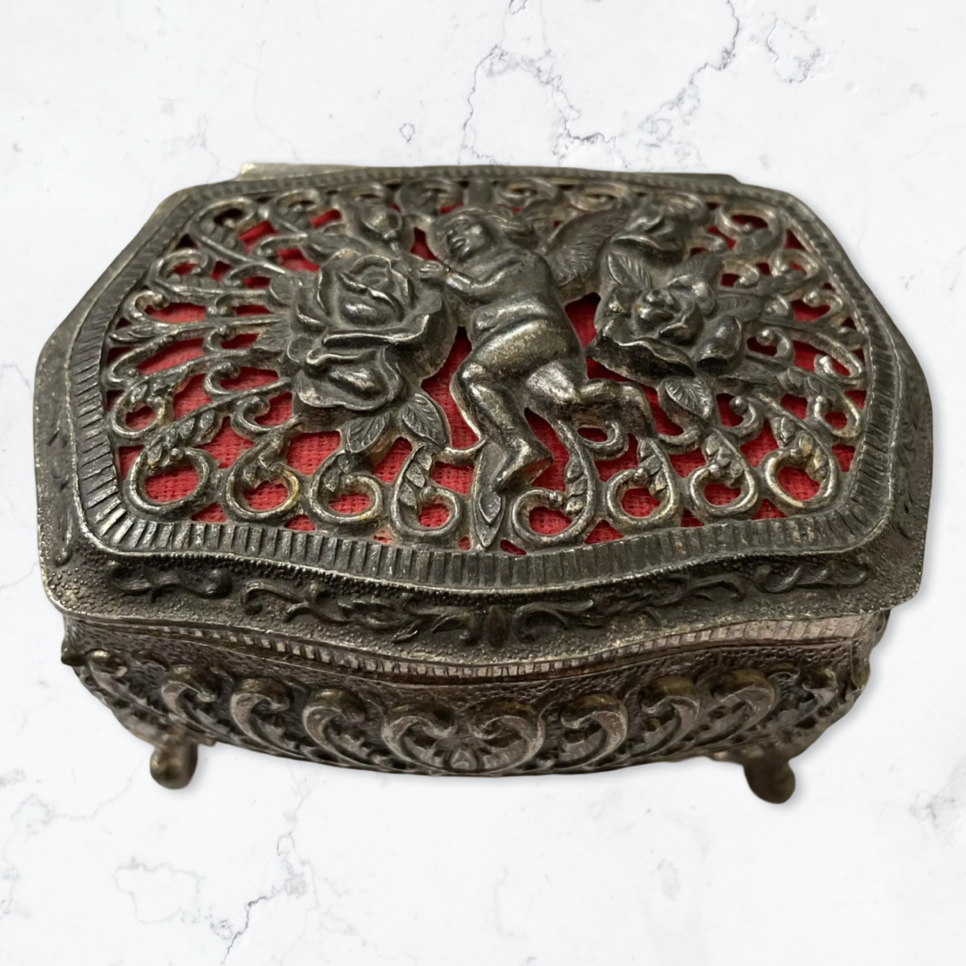 This vintage jewelry box features a delicate design of a cherub angel with roses in pierced metal. The antique silver finish and red felt lining add a touch of elegance to any setting. Keep your special rings safe and add a charming touch to your dresser or vanity.