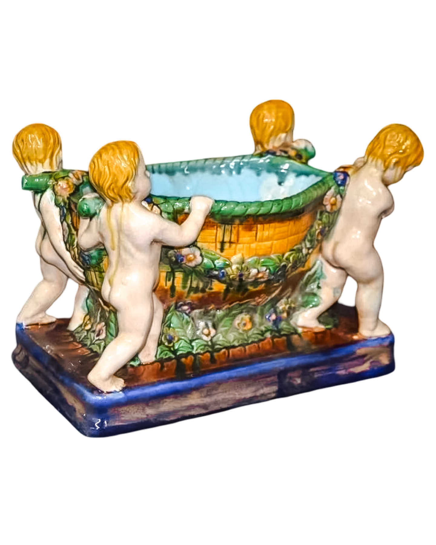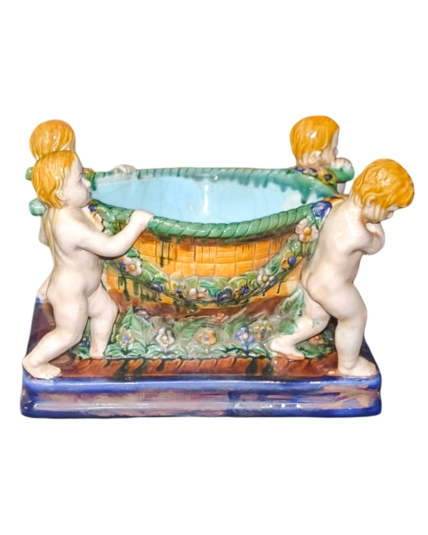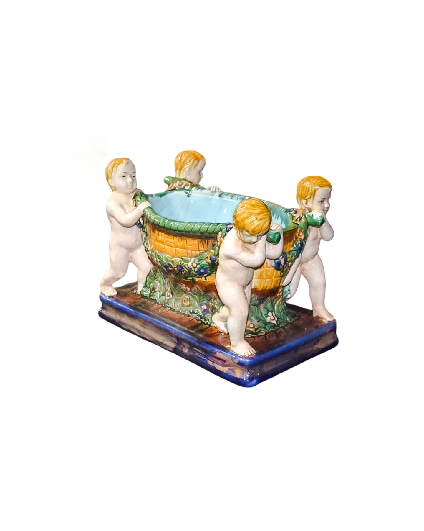 Elevate your collection with this exquisite Antique Minton Majolica Bowl, a masterpiece of Victorian craftsmanship. Hand-painted cherub motifs dance across the glazed surface, showcasing the distinctive artistry Minton is renowned for. The rich, dimensional majolica finish captures light beautifully, making it a striking focal point on any shelf or table. Perfect for collectors of fine ceramics and vintage home décor enthusiasts, this timeless piece brings authentic European elegance and historical charm to your space. A treasured addition that speaks to refined taste and appreciation for quality artisanal work. Measures 9” high x x 12” wide x 7” deep.
