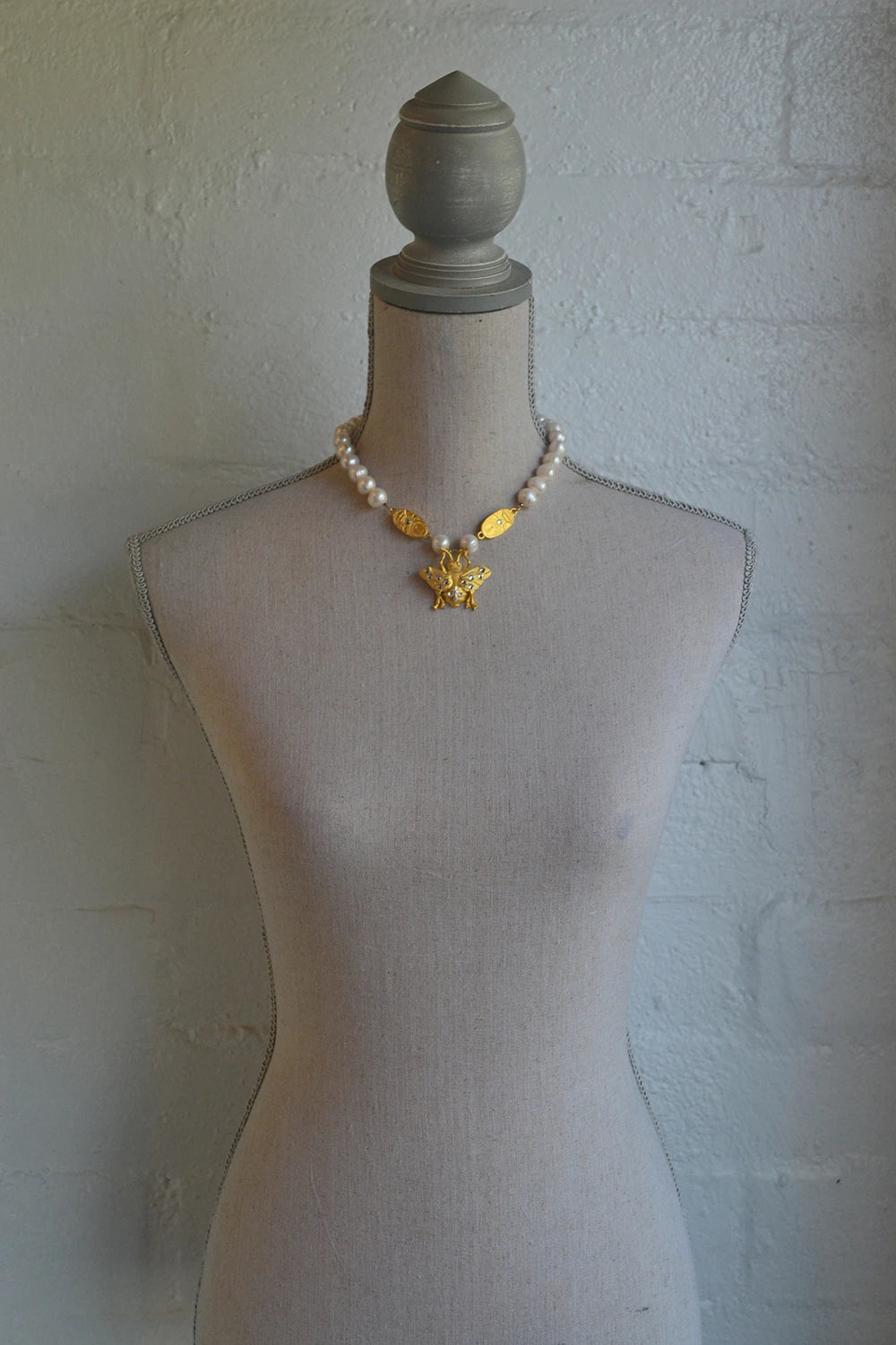 Introducing the Catherine Necklace—a delightful celebration of elegance and whimsy! Crafted with lustrous white Freshwater Pearls, sparkling Swarovski Crystal accents, and charming bee pendants, this 17" beauty shines on its own or pairs perfectly with our midi and long necklaces for a chic layered look. Each handcrafted piece features a 10mm stone set in 24k gold plating, lovingly created by our talented Californian artisans right here in Los Angeles. Pure joy around your neck.