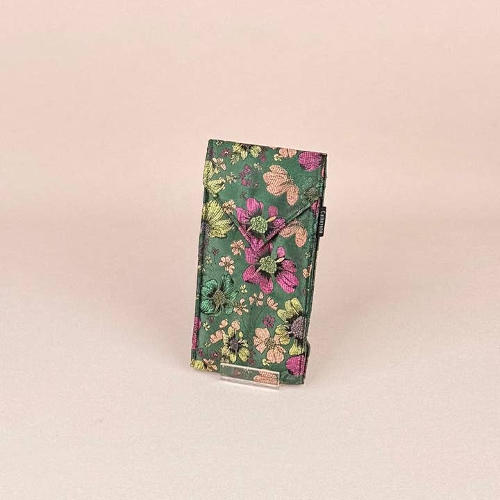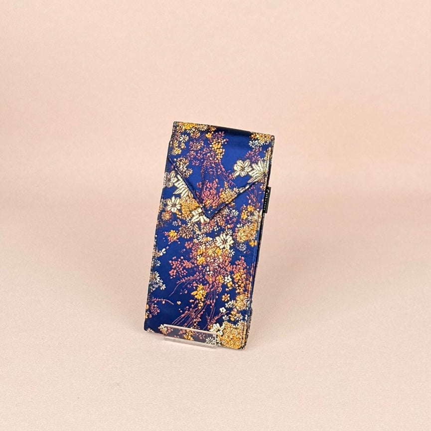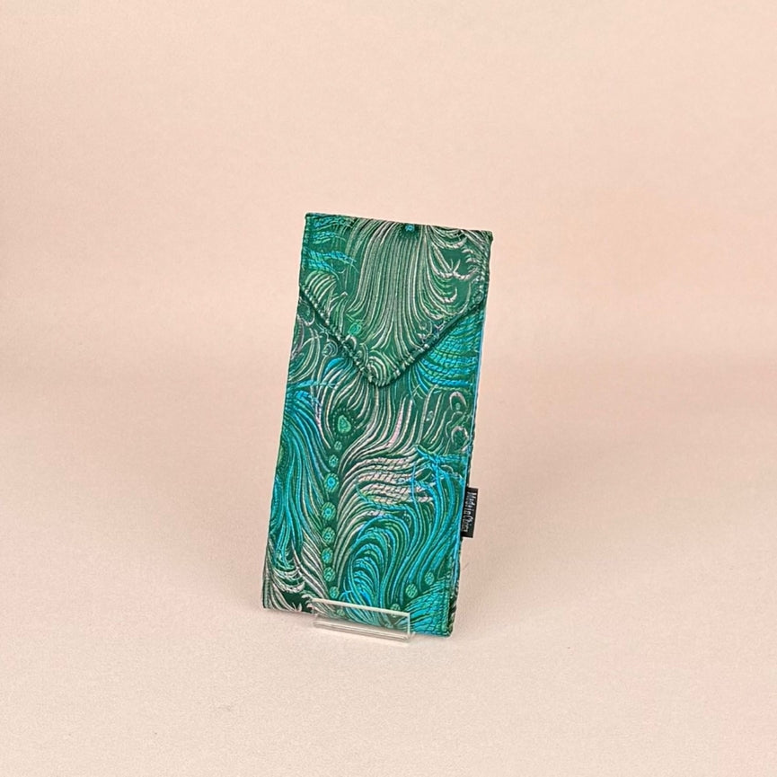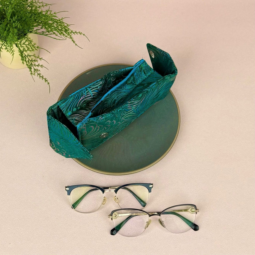 This holder is made for 2 pairs of reading glasses. It's covered in fancy brocade fabric. Measures 8" x 4" x 1 ".