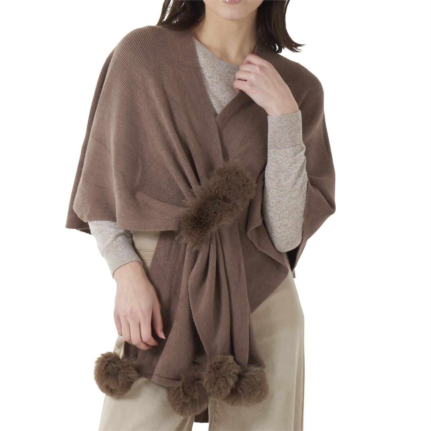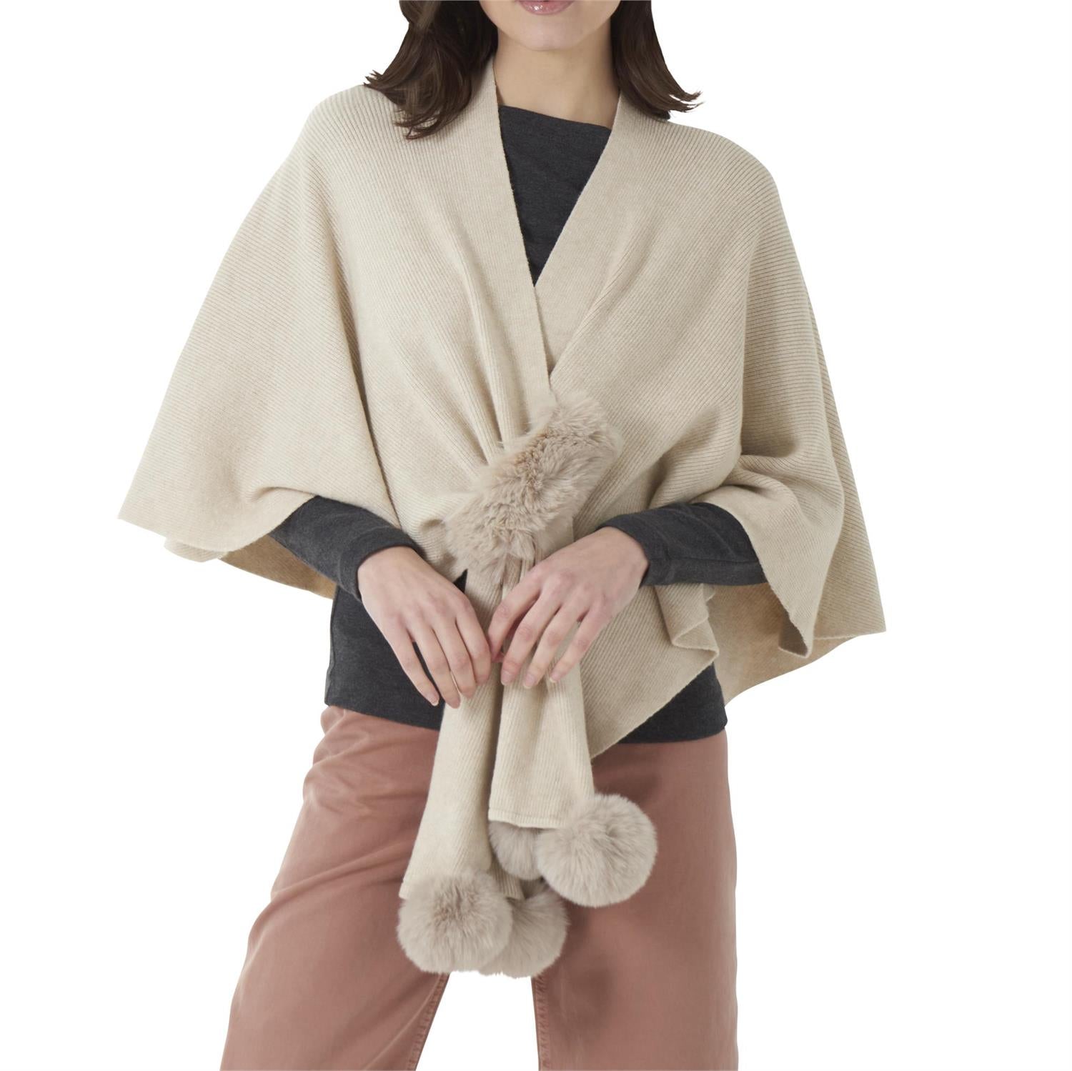Elevate your outerwear with this exquisite Pom Pom Cape, designed to blend timeless elegance with cozy comfort. Crafted with refined attention to detail, its delicate pom pom accents add a subtle yet striking charm. This versatile cape effortlessly enhances any ensemble, providing lightweight warmth while maintaining a sophisticated silhouette. Ideal for layering during cooler months, it transforms everyday outfits into statements of understated luxury. 52% Viscose 28% Polyester 20% Polyamide FUR: 100% polyester. Choose from two colors: Mocha or Ivory.