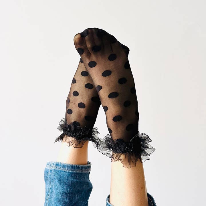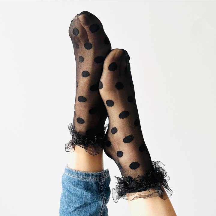 Discover our Serena socks with transparent polka dots with ruffles on the top, perfect for adding a touch of elegance and fantasy to your outfit!