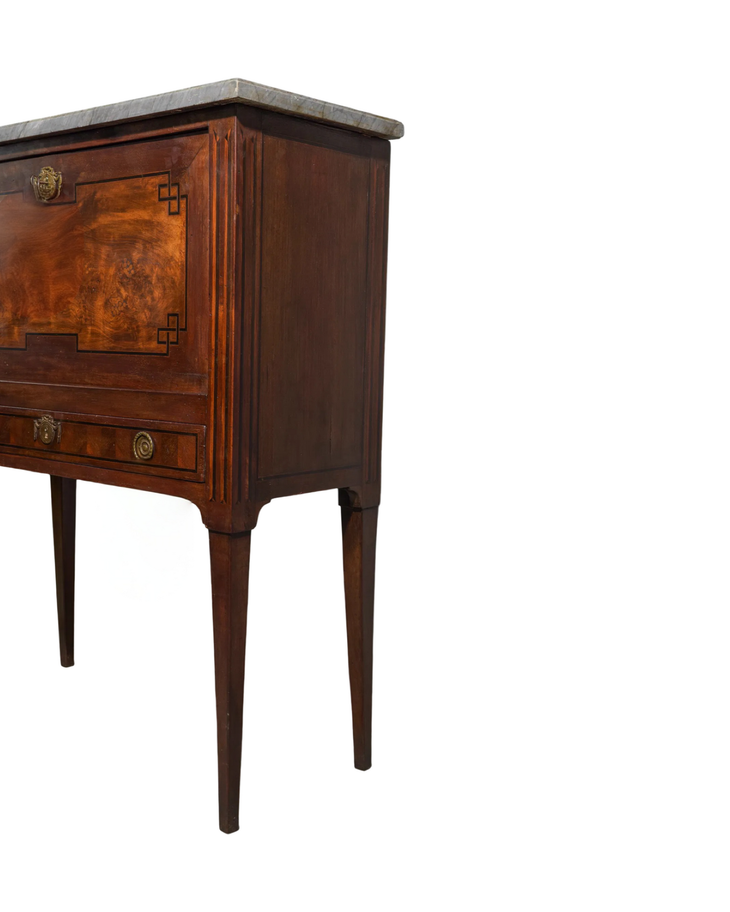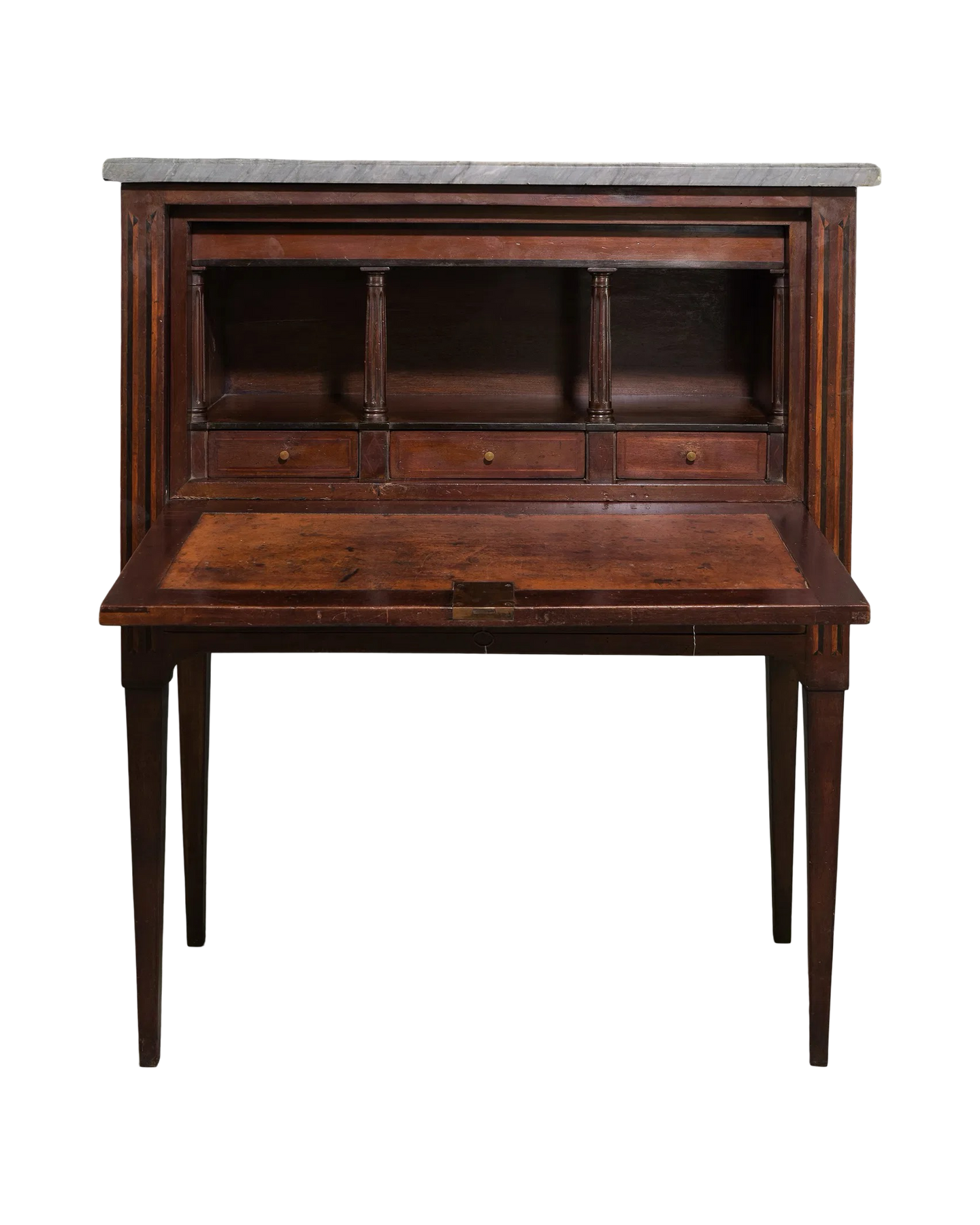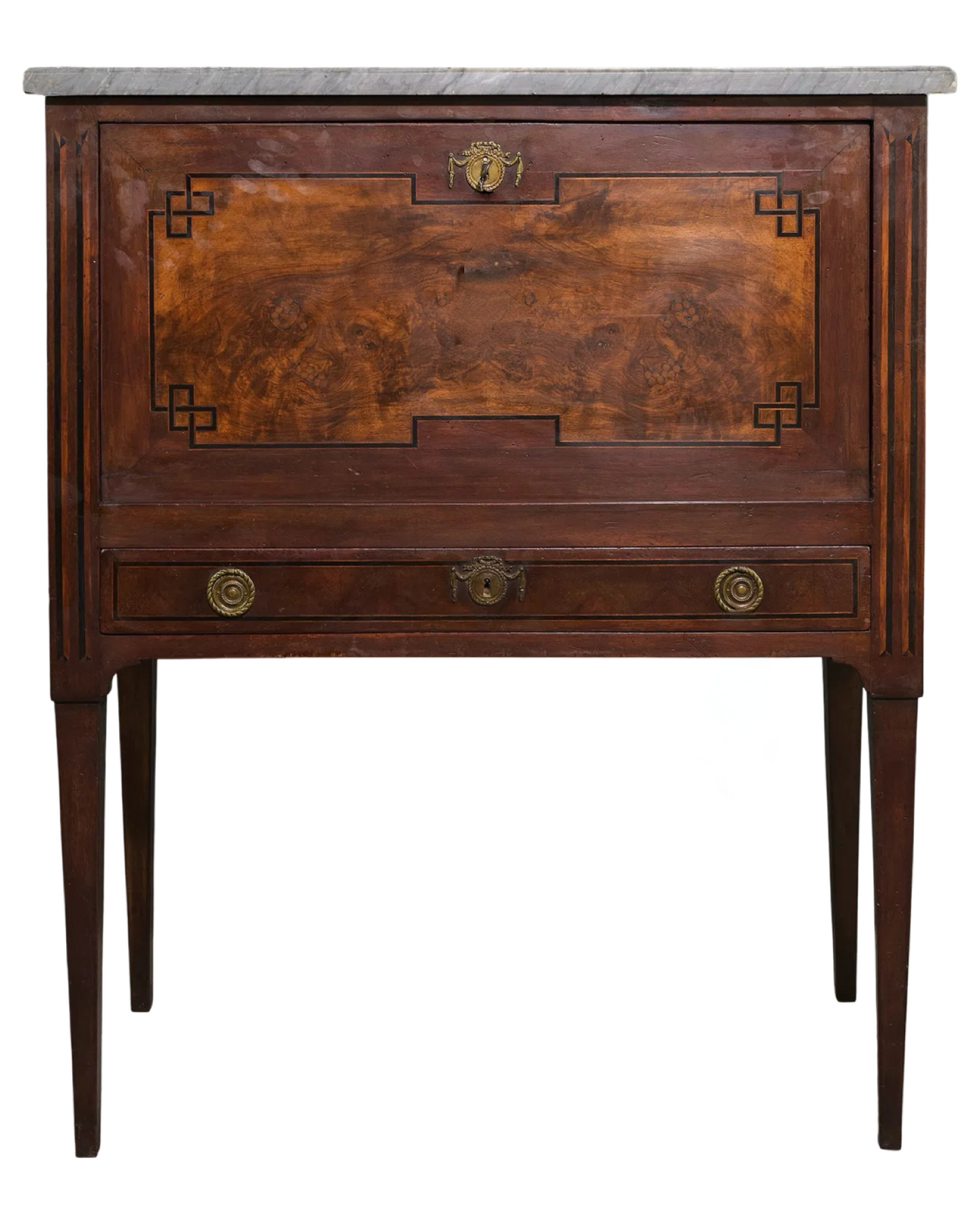 Elevate your space with this Antique French Chinoiserie Drop Front Secretary from the late 1800's, featuring a stunning gray marble top. Its elegant design combines timeless craftsmanship with practical functionality, offering a refined workspace and ample storage. The exquisite chinoiserie detailing adds a touch of sophistication, making it a captivating centerpiece for any room. Perfect for those who appreciate classic beauty and versatile furniture. Measures: 47.5 in tall x 39 x 17.