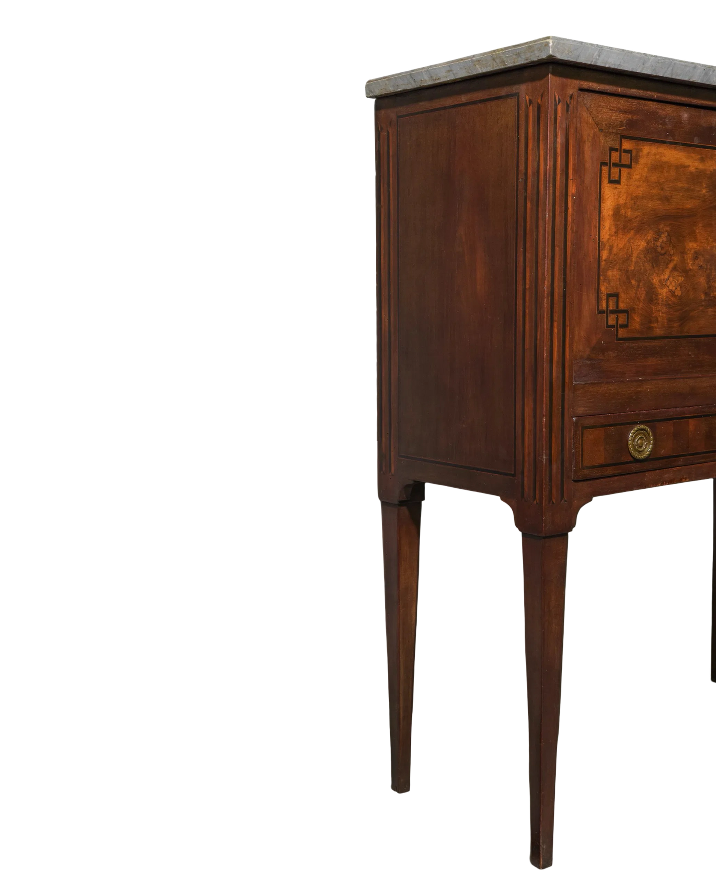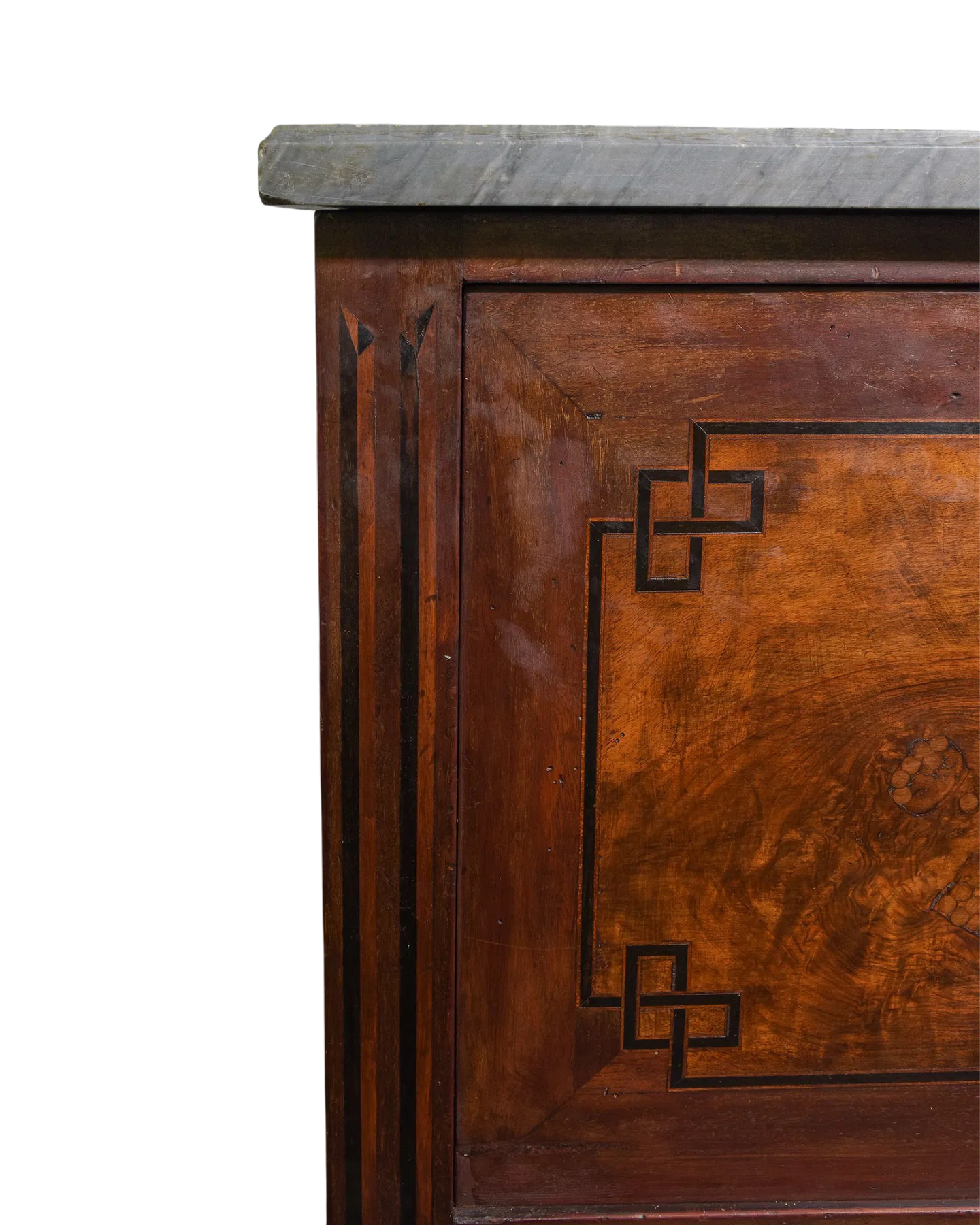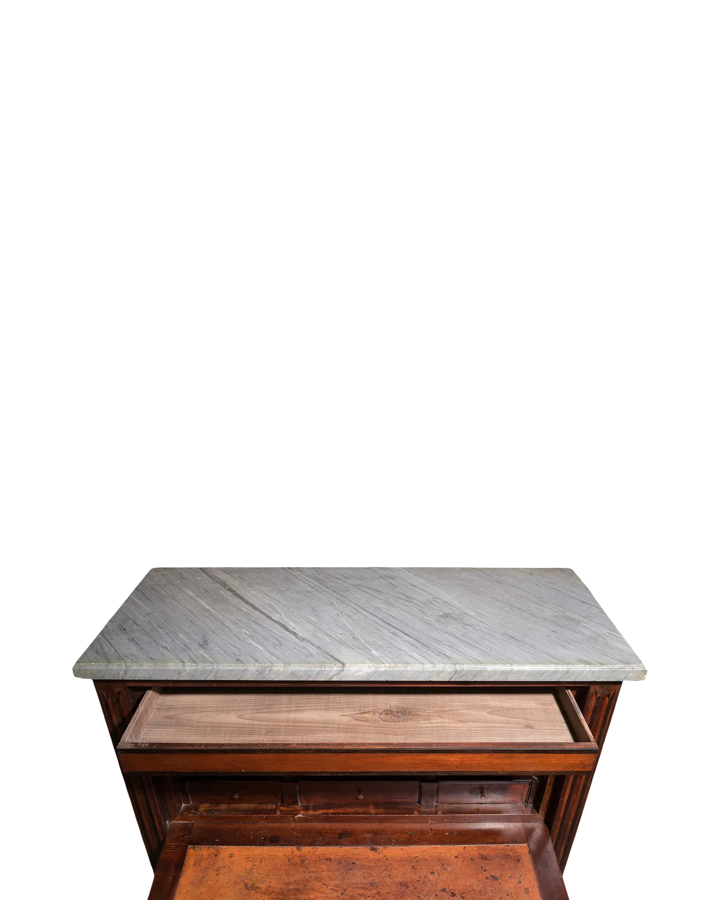 Elevate your space with this Antique French Chinoiserie Drop Front Secretary from the late 1800's, featuring a stunning gray marble top. Its elegant design combines timeless craftsmanship with practical functionality, offering a refined workspace and ample storage. The exquisite chinoiserie detailing adds a touch of sophistication, making it a captivating centerpiece for any room. Perfect for those who appreciate classic beauty and versatile furniture. Measures: 47.5 in tall x 39 x 17.
