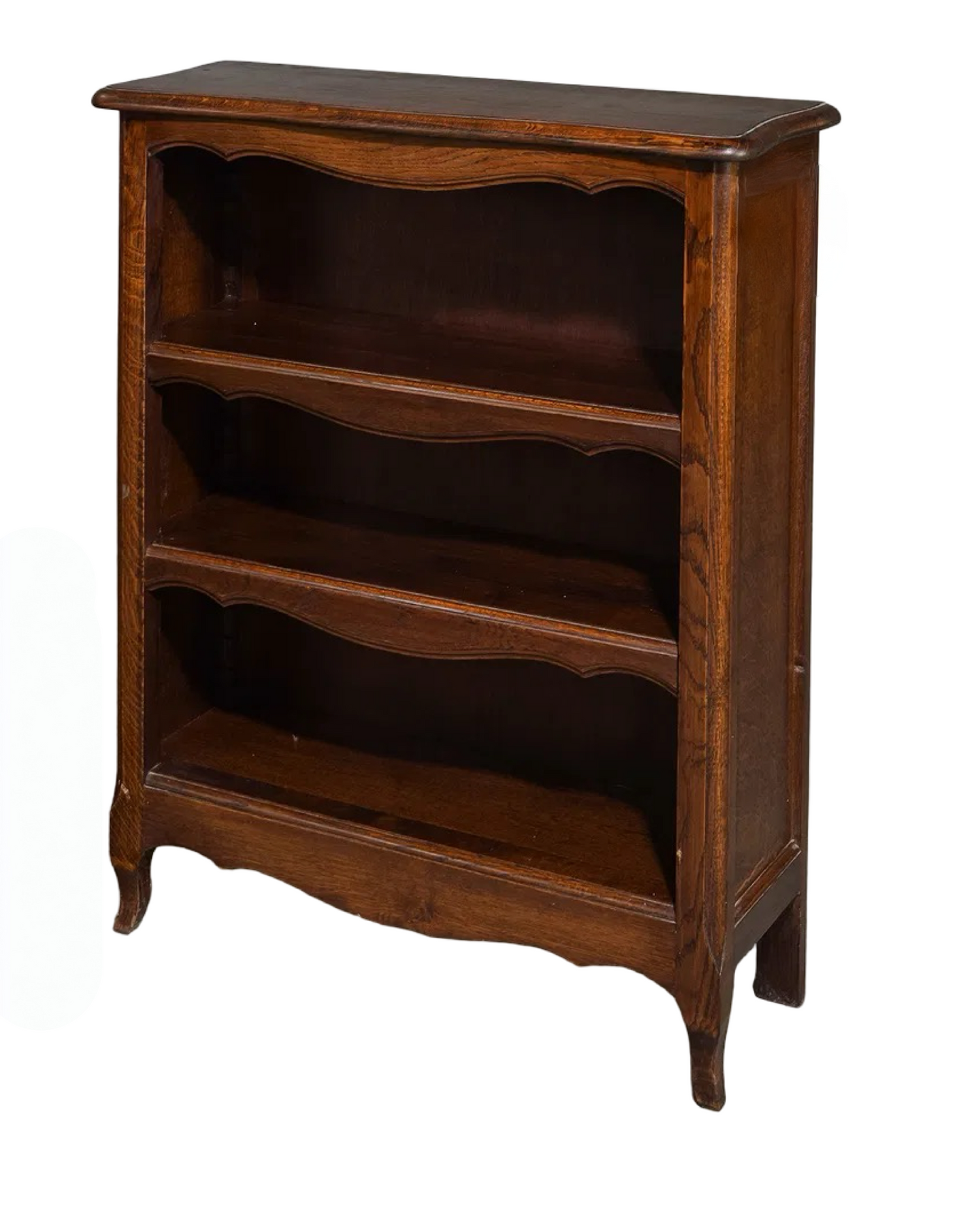 French oak hand carved three shelf open bookcase in Louis XV style. France, circa 1890. Measures 36 in tall x 28 x 10.5.