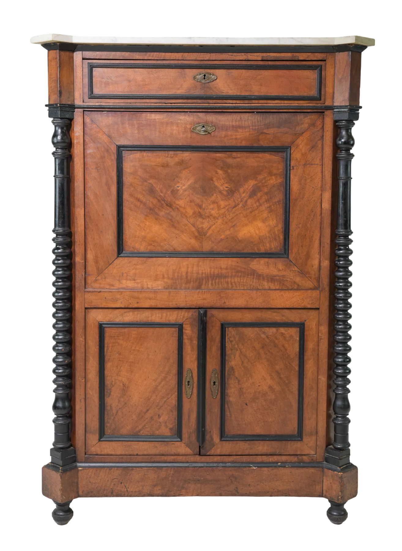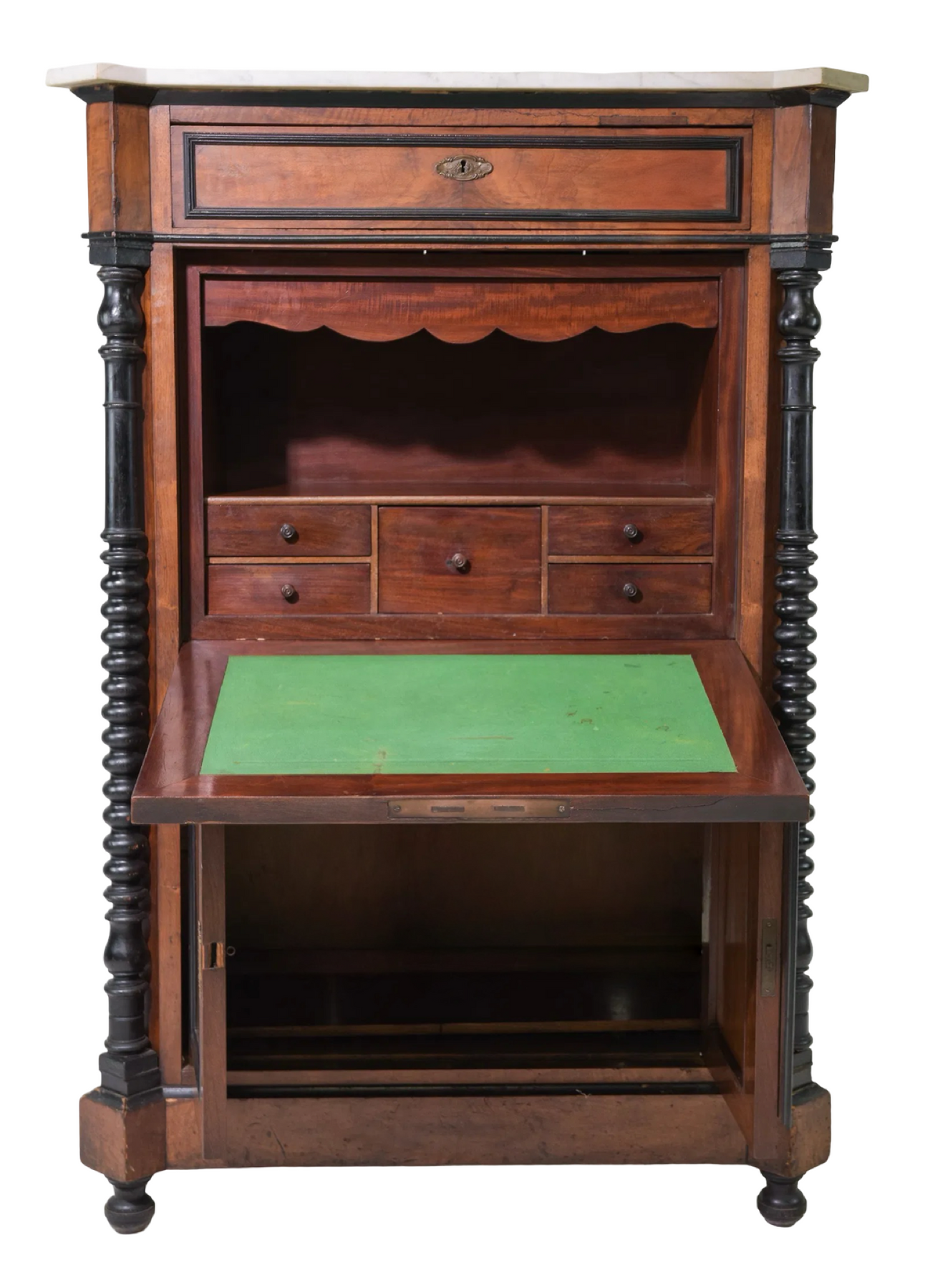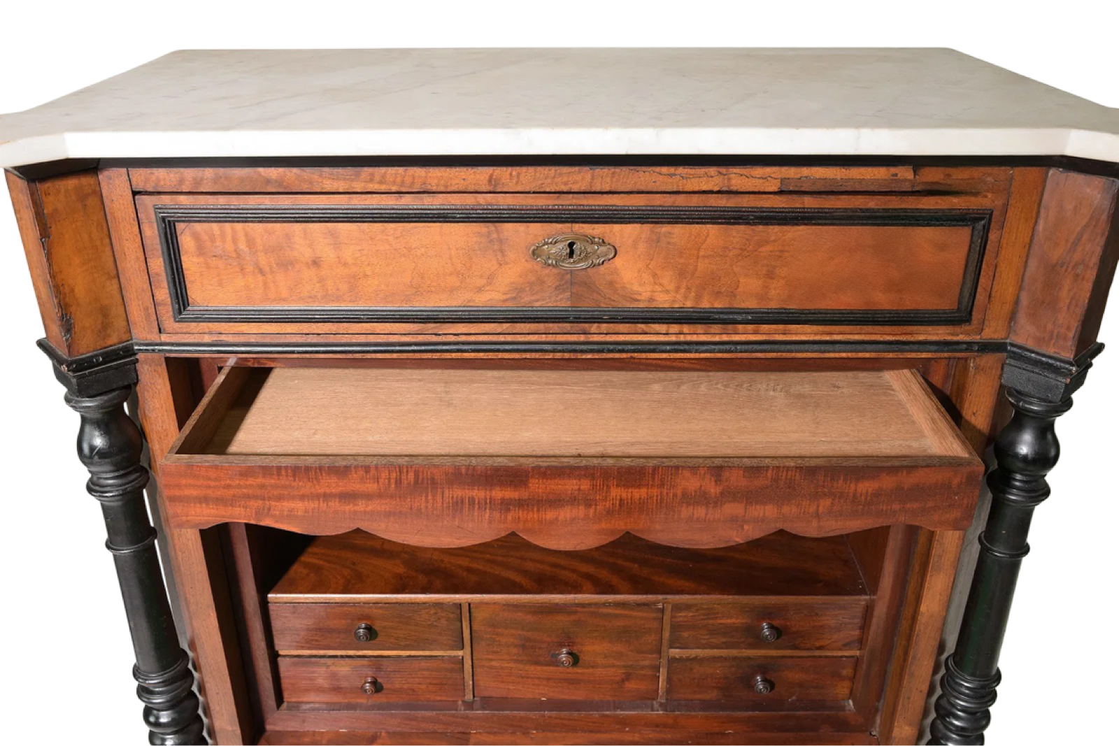 This exquisite Antique French Secretary Abattant from circa 1920 features a stunning white marble top that adds timeless elegance to any space. Crafted with classic French design, it offers a practical fold-down writing surface and ample storage, blending beauty with functionality. Perfect for those who appreciate vintage charm and refined craftsmanship, this piece transforms your home office or living area into a sophisticated retreat. Elevate your décor with this rare and elegant antique treasure. Measures 62.5 in tall x 42.5 x 21.5".