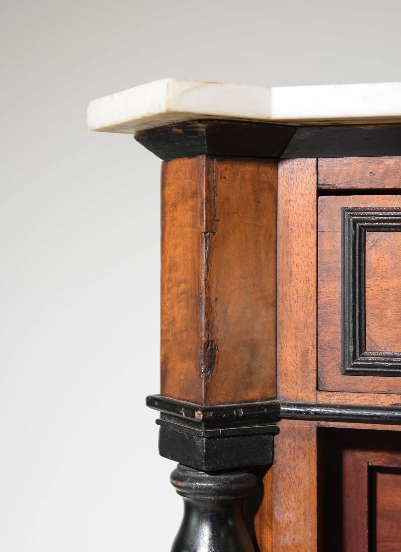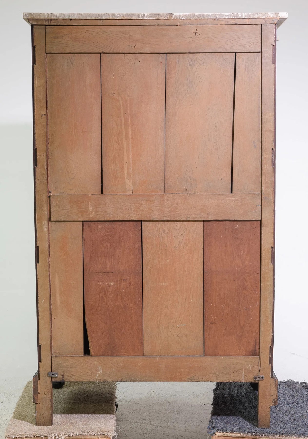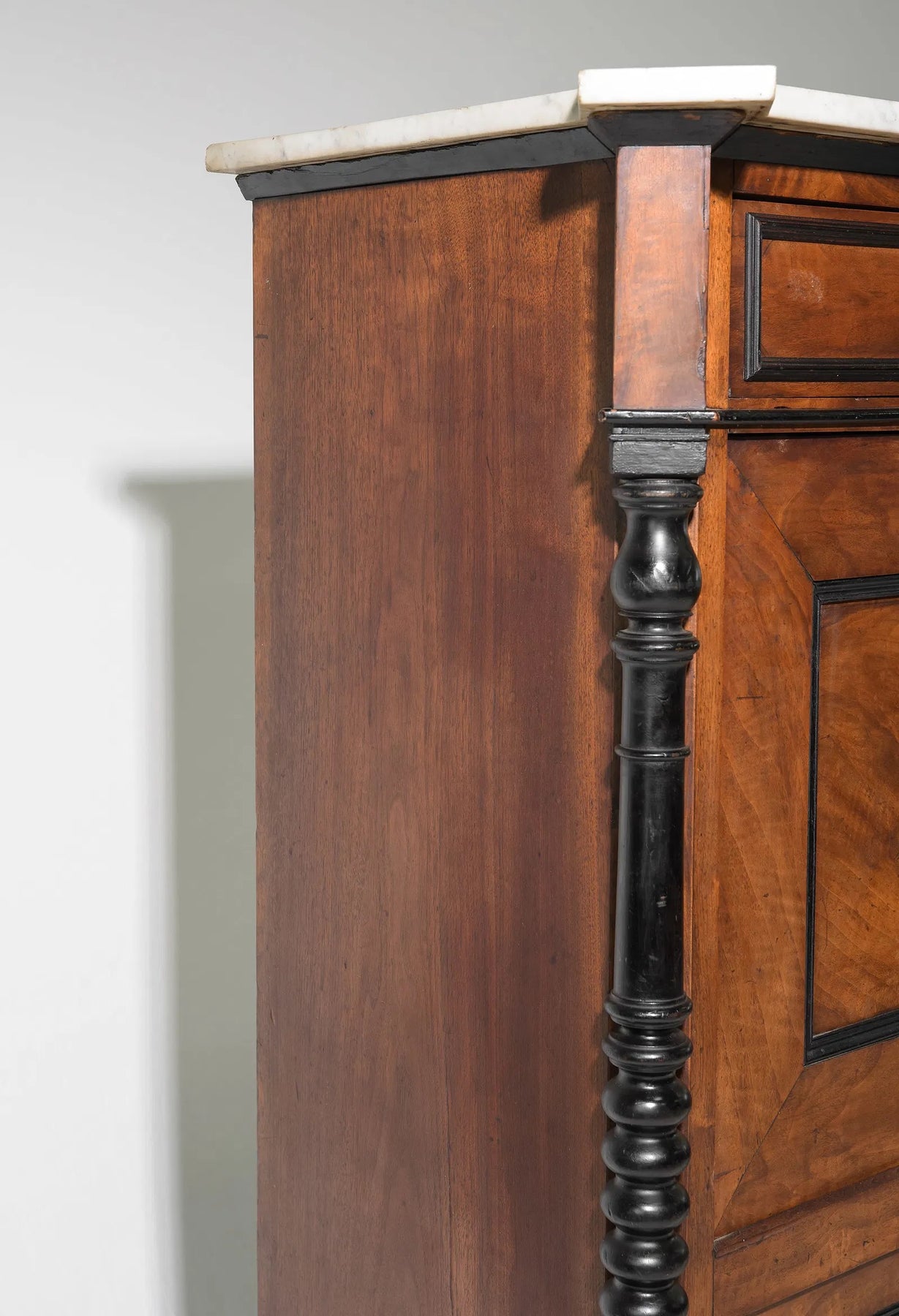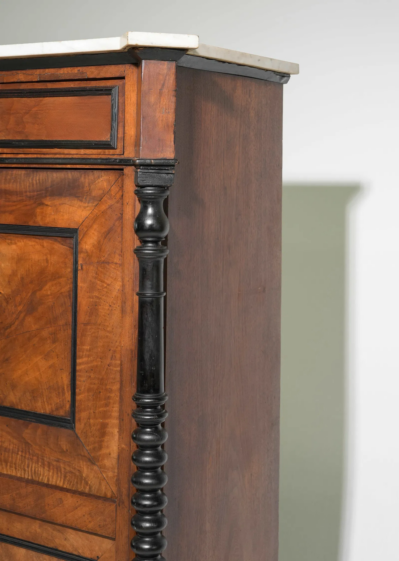 This exquisite Antique French Secretary Abattant from circa 1920 features a stunning white marble top that adds timeless elegance to any space. Crafted with classic French design, it offers a practical fold-down writing surface and ample storage, blending beauty with functionality. Perfect for those who appreciate vintage charm and refined craftsmanship, this piece transforms your home office or living area into a sophisticated retreat. Elevate your décor with this rare and elegant antique treasure. Measures 62.5 in tall x 42.5 x 21.5".
