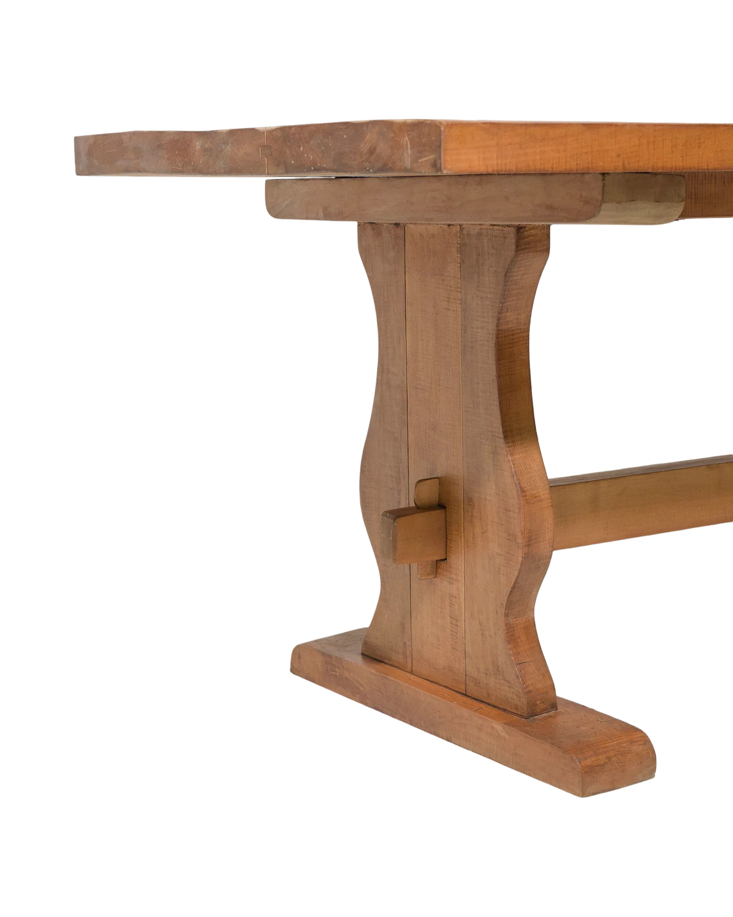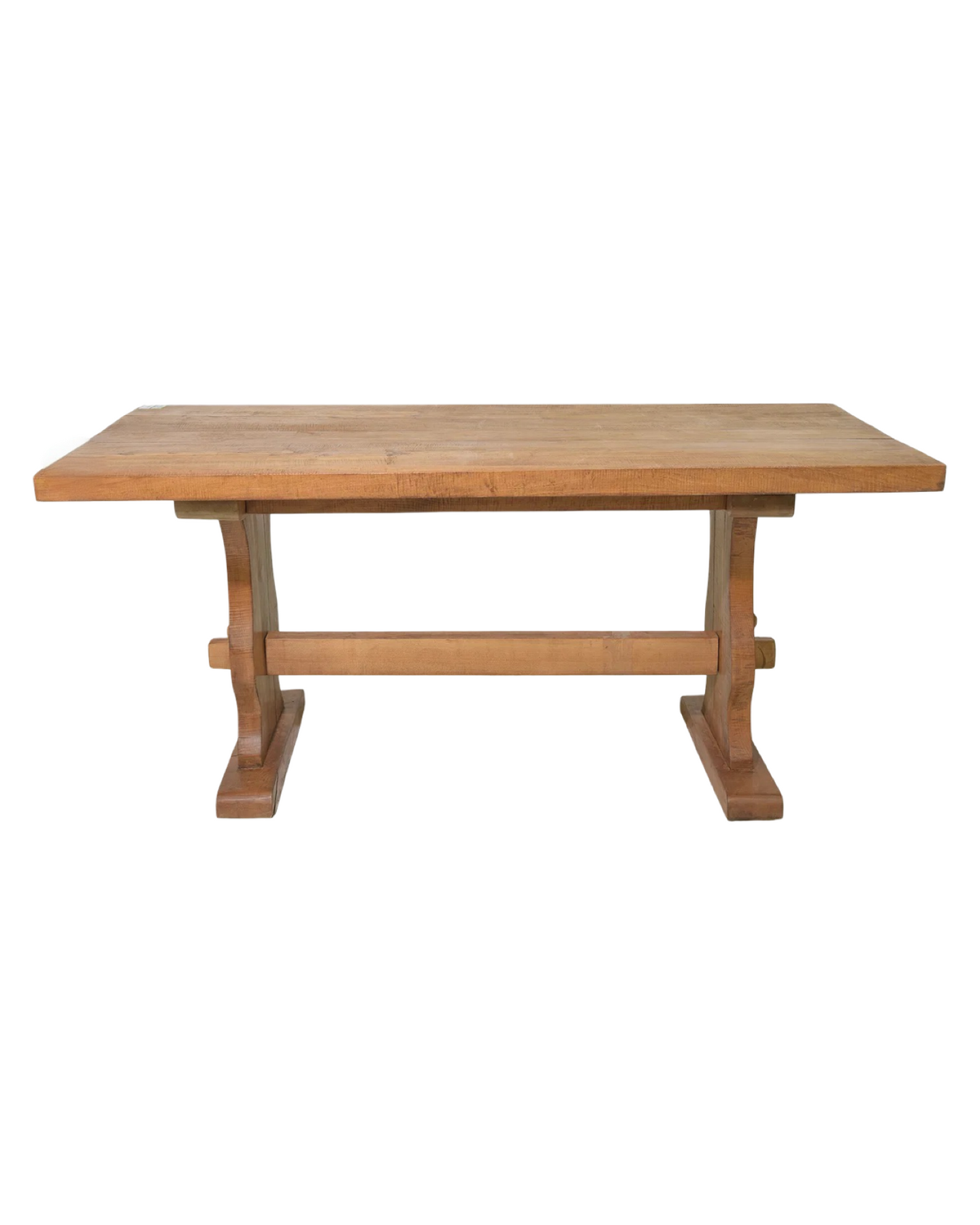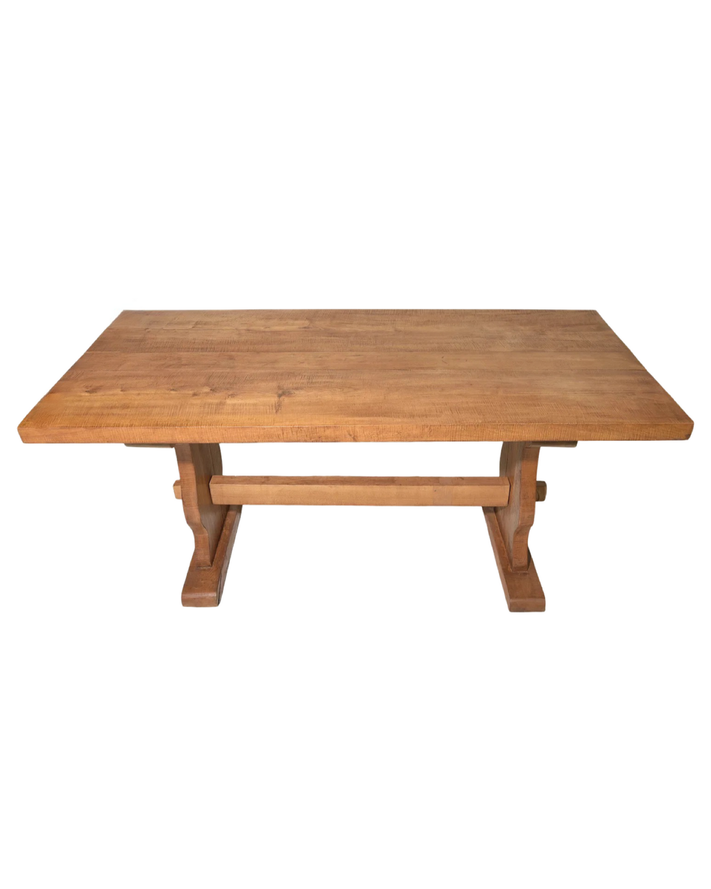 Experience timeless charm with this French Rustic Trestle Base Monastery Farmhouse Table, circa 1900. Crafted with sturdy trestle construction, it offers both durability and classic farmhouse elegance. Its rustic finish and authentic vintage character make it a captivating centerpiece for any dining space, inviting warm gatherings and lasting memories. Perfect for those who appreciate heritage and craftsmanship in their home. Table measures 30 in tall x 67 x 31.5, Floor to under is 28 inches and the space between the legs is 38 inches.