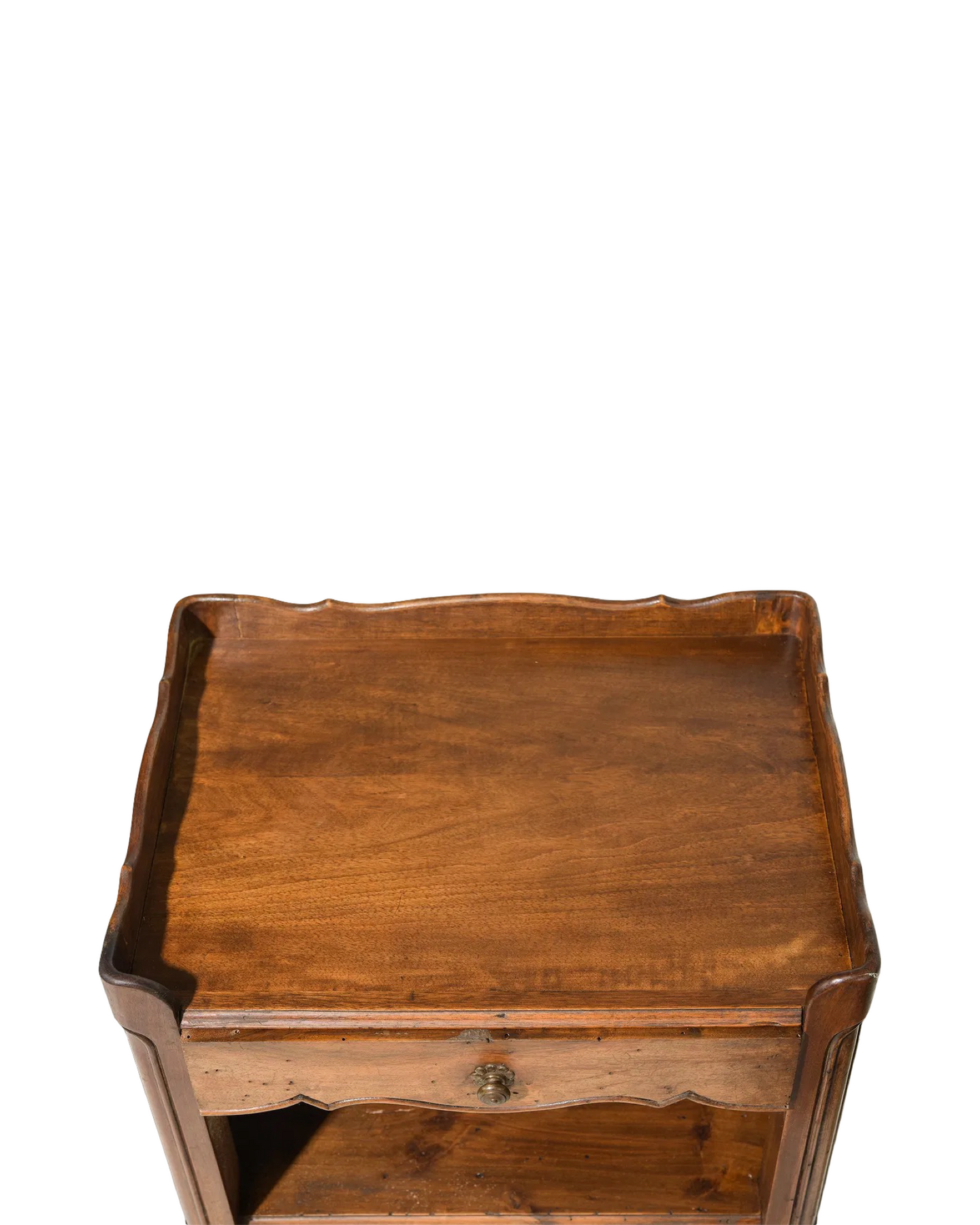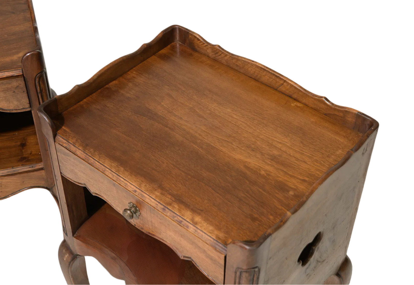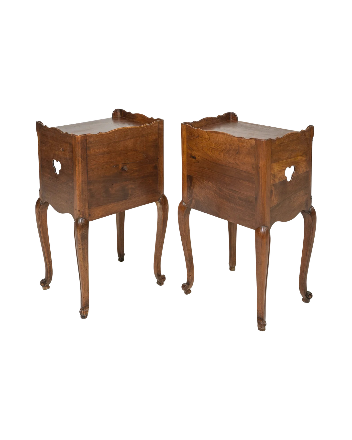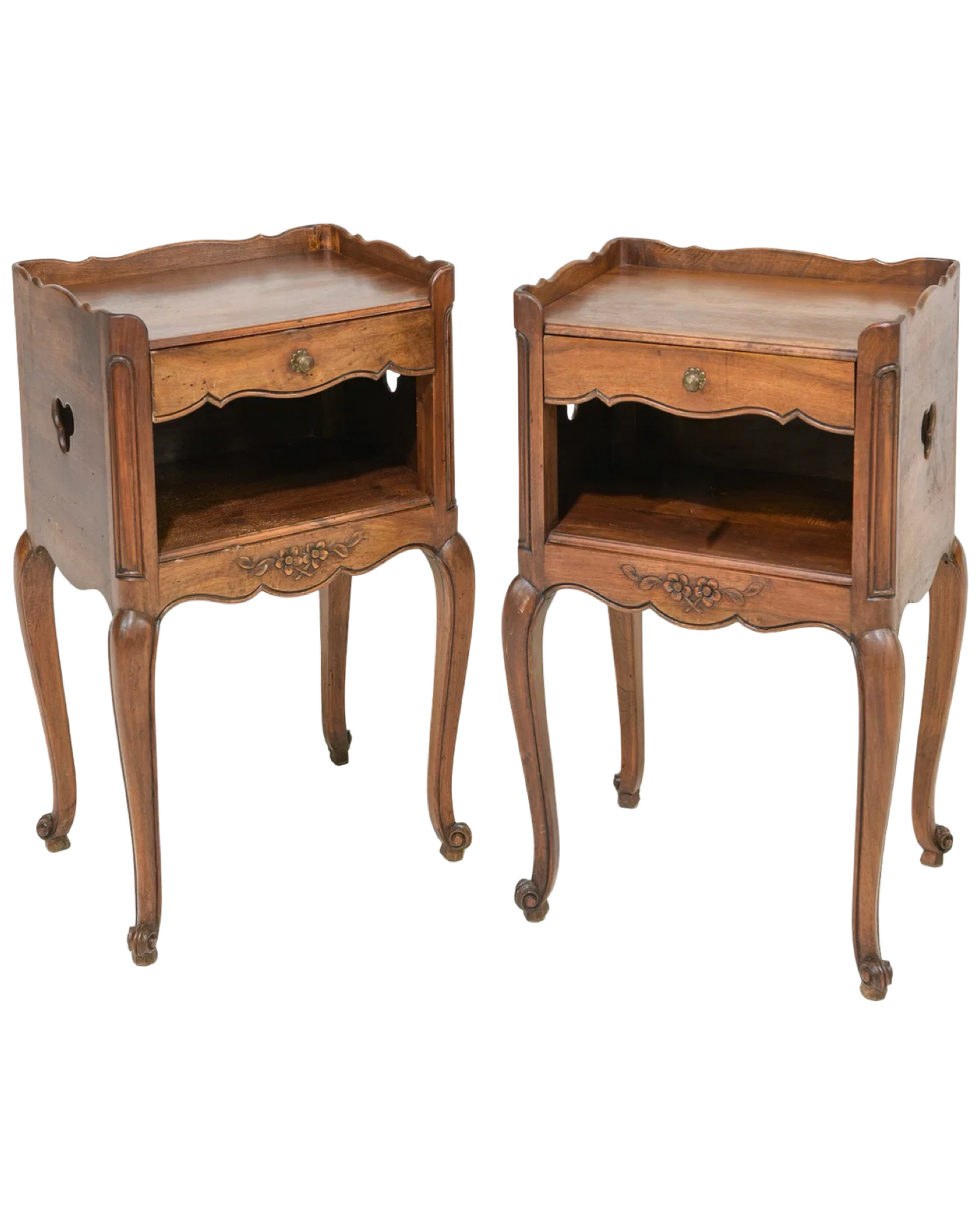 Elevate your living space with this exquisite pair of Antique Louis XV Occasional Tables. Featuring a charming cloverleaf design on the sides and a convenient drawer for storage, these tables blend timeless elegance with practical functionality. Their graceful curves and intricate craftsmanship make them perfect accents for any room, adding both style and subtle sophistication. Ideal for displaying treasured items or keeping essentials close at hand, these tables bring a touch of classic French luxury to your home. Measures 29.5 in tall x 17" x 14.5". Sold individually.