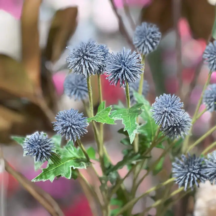 The 25-inch Blue Echinops Spray is a stunning addition for those looking to incorporate unique color and texture into their arrangements. This faux stem features clusters of spherical, spiky blooms in a cool blue hue, beautifully complemented by natural-looking green foliage. Perfect for adding a touch of rustic charm or a modern edge, it brings an eye-catching element to both minimalist and mixed floral displays. With its intriguing form and vibrant color, this echinops spray is an effortless way to elevate any decor with lasting botanical interest.
