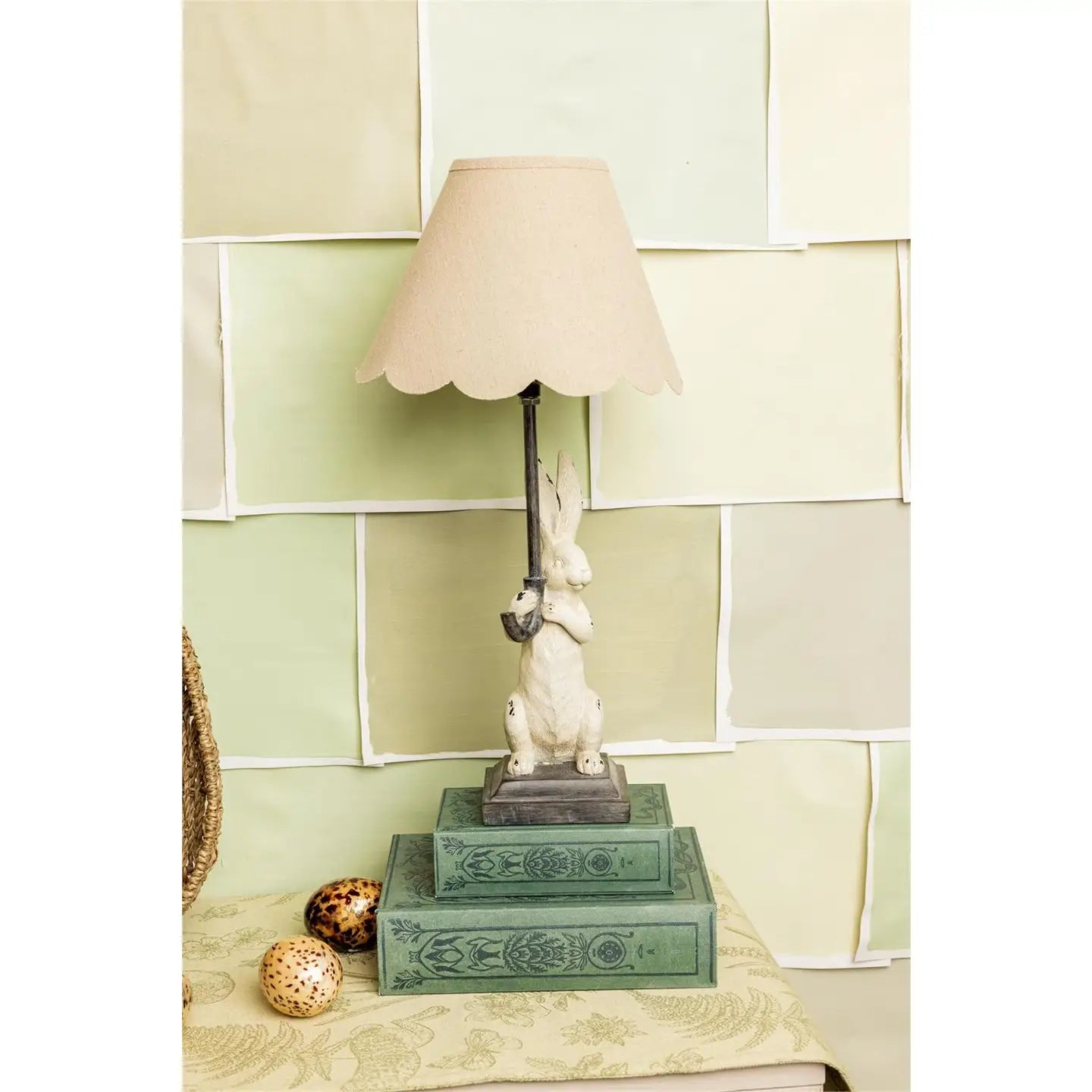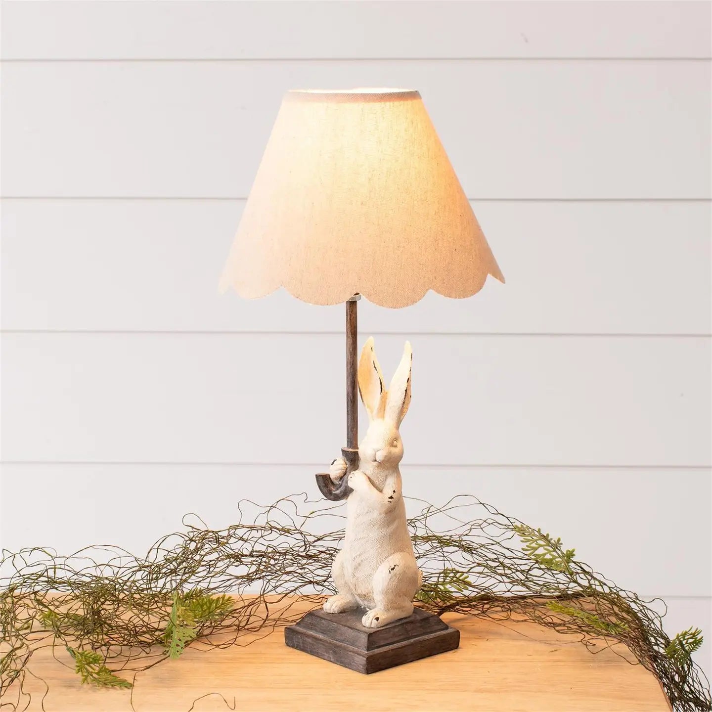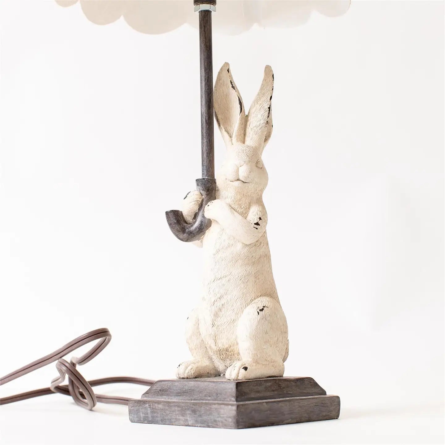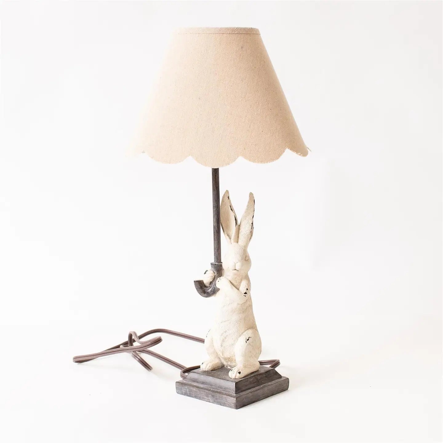 Hop into a world of whimsy with our Lamp - Rabbit with Umbrella Shade. This quirky lamp features a playful rabbit holding up an umbrella as its shade, adding a touch of unexpected charm to any room. Light up your space with this unique and fun conversation starter! Stone powder, Resin | Requires E-26 Bulb | 60 Inch Cord | Lampshade Included 18" H x 9" Dia (Includes Shade) Cord 60" L.