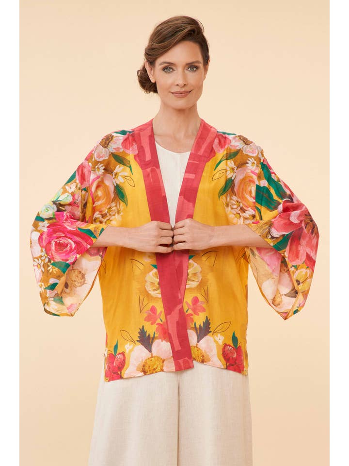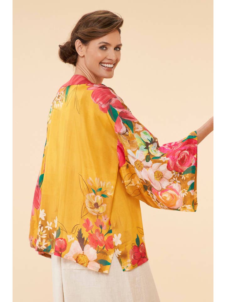 What’s better than gifting flowers? Gifting this wonderfully ornate Impressionist Floral Kimono Jacket in mustard! This oil on canvas inspired design features a fabulously poised color palette which will have every creative feeling their most feminine no matter the plans! Wear with jeans and a top for a stunning look.