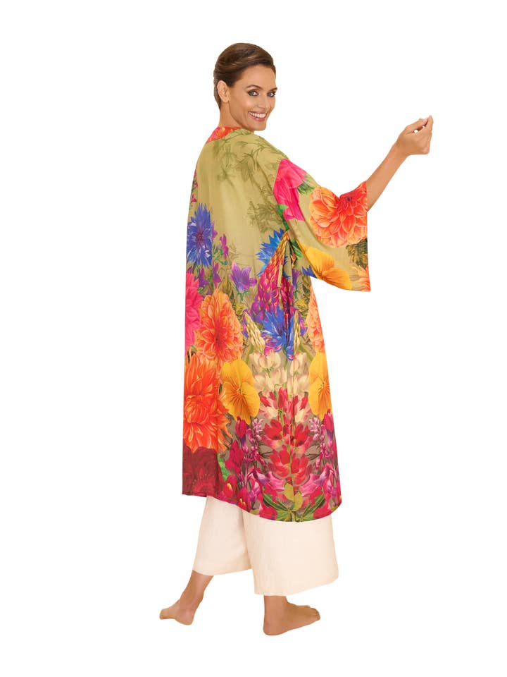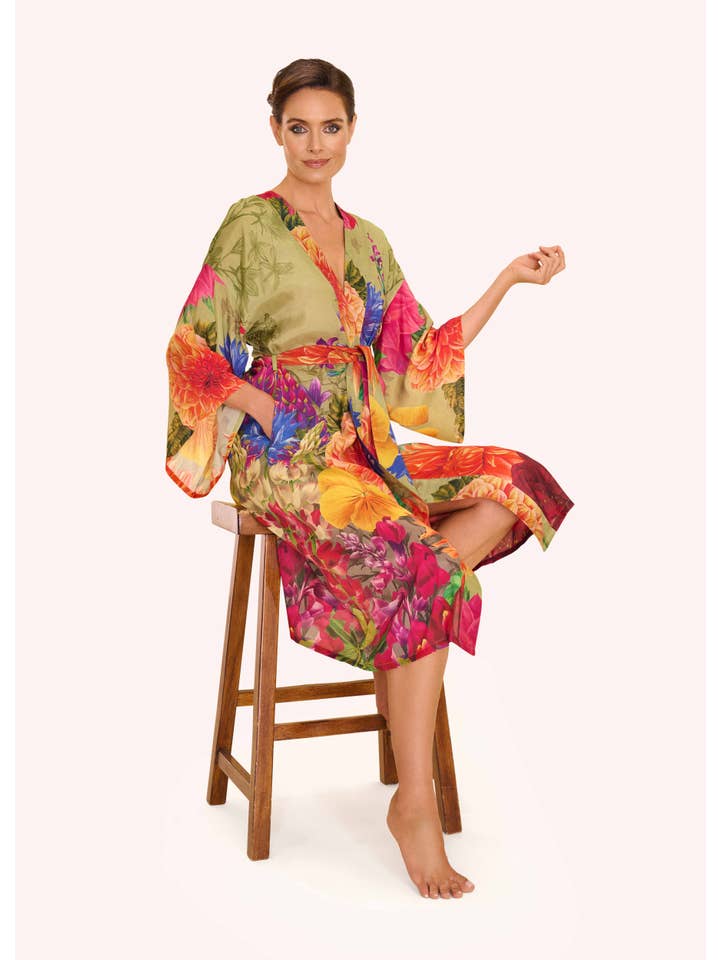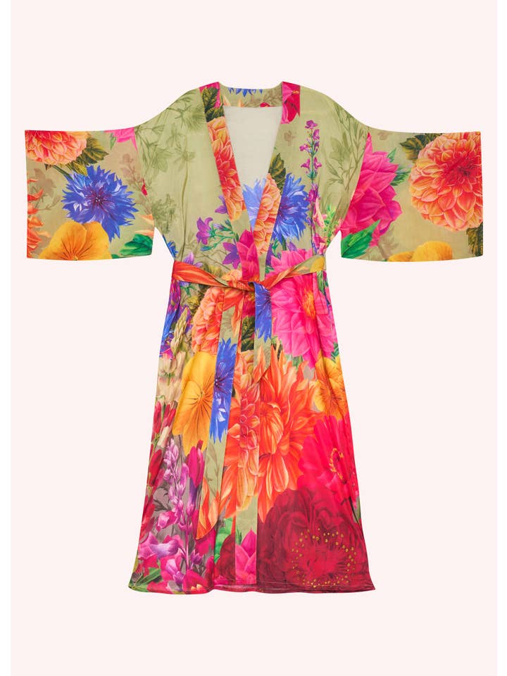 Not just a look, a vibe! Channel your boho-chic self in our bountiful blooms' kimono gown this summer. This bright colorful bold print can wrap around your sleepwear or elevate your dinner party look; you will never want to take it off! Cool hand wash only. One size: please see attached imagery for dimensions.