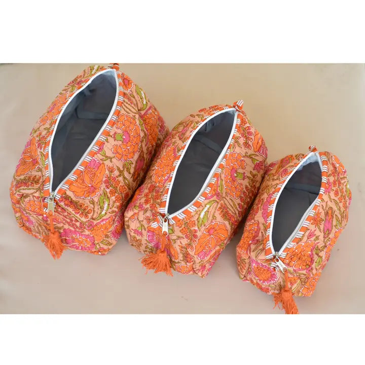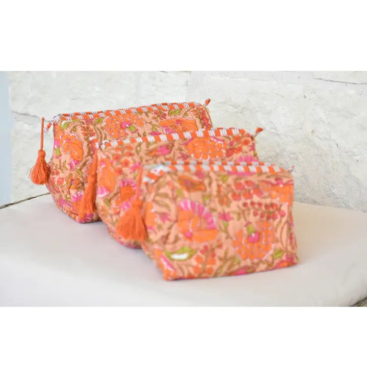 Stay organized in style with our Red Safari Block Print pouch set — three quilted cotton zip pouches, handcrafted and block-printed in Jaipur. Use them for cosmetics, toiletries, chargers, or gift sets. The inside is lined with plastic for easy clean-up, with two handy pockets. A pretty tassel is attached to the zipper. Product Features: • Lightweight cotton with structured shape and zip closure • Ideal for travel, gifting, and as stocking stuffers • Fully lined interior for easy cleaning • Sizes: – Large: 9in x 5in x 5in – Medium: 7in x 4in x 4in – Small: 6in x 4in x 4in
