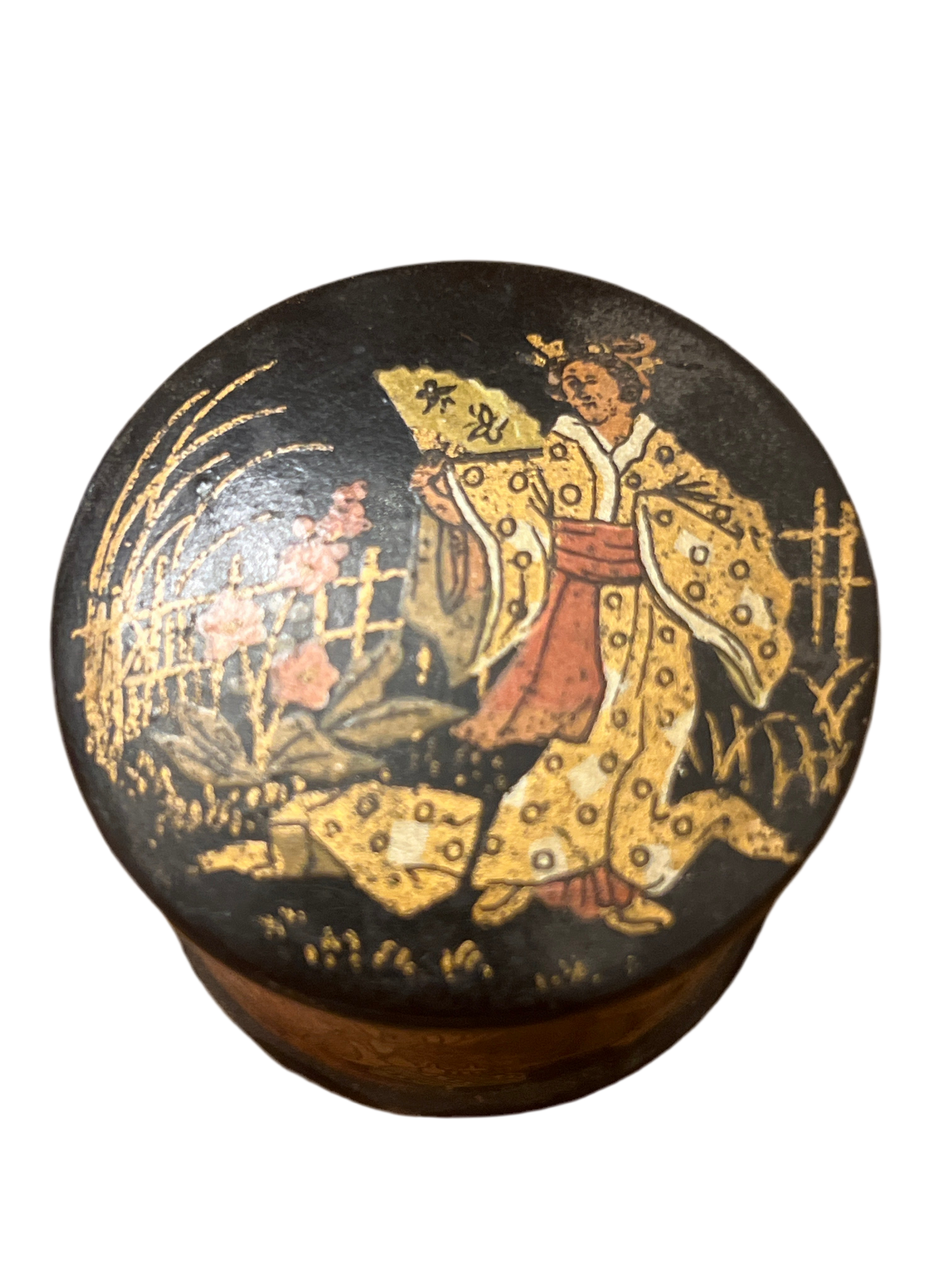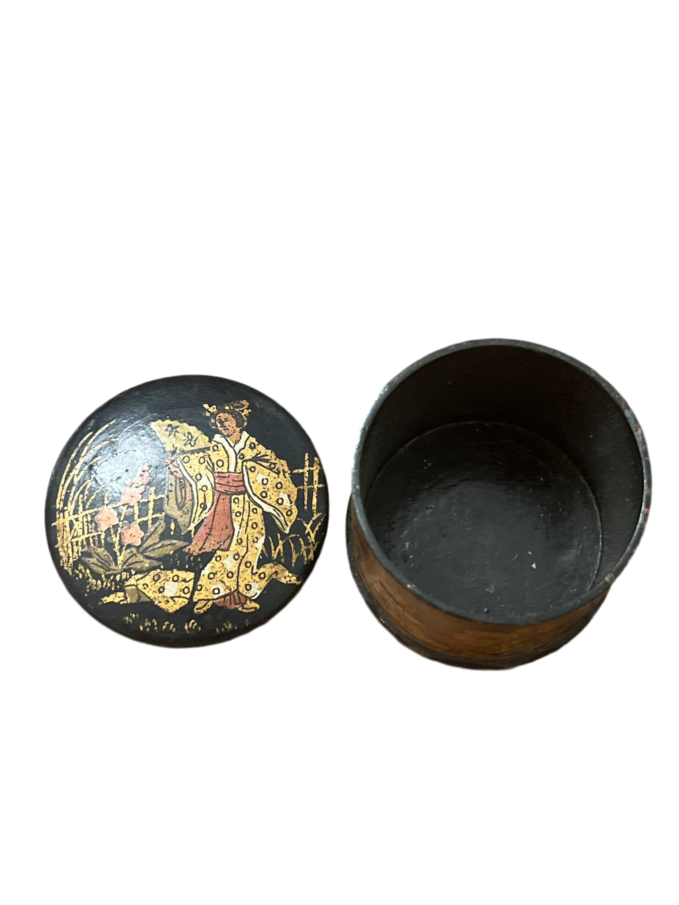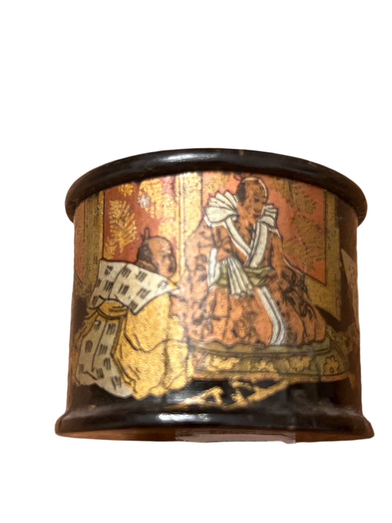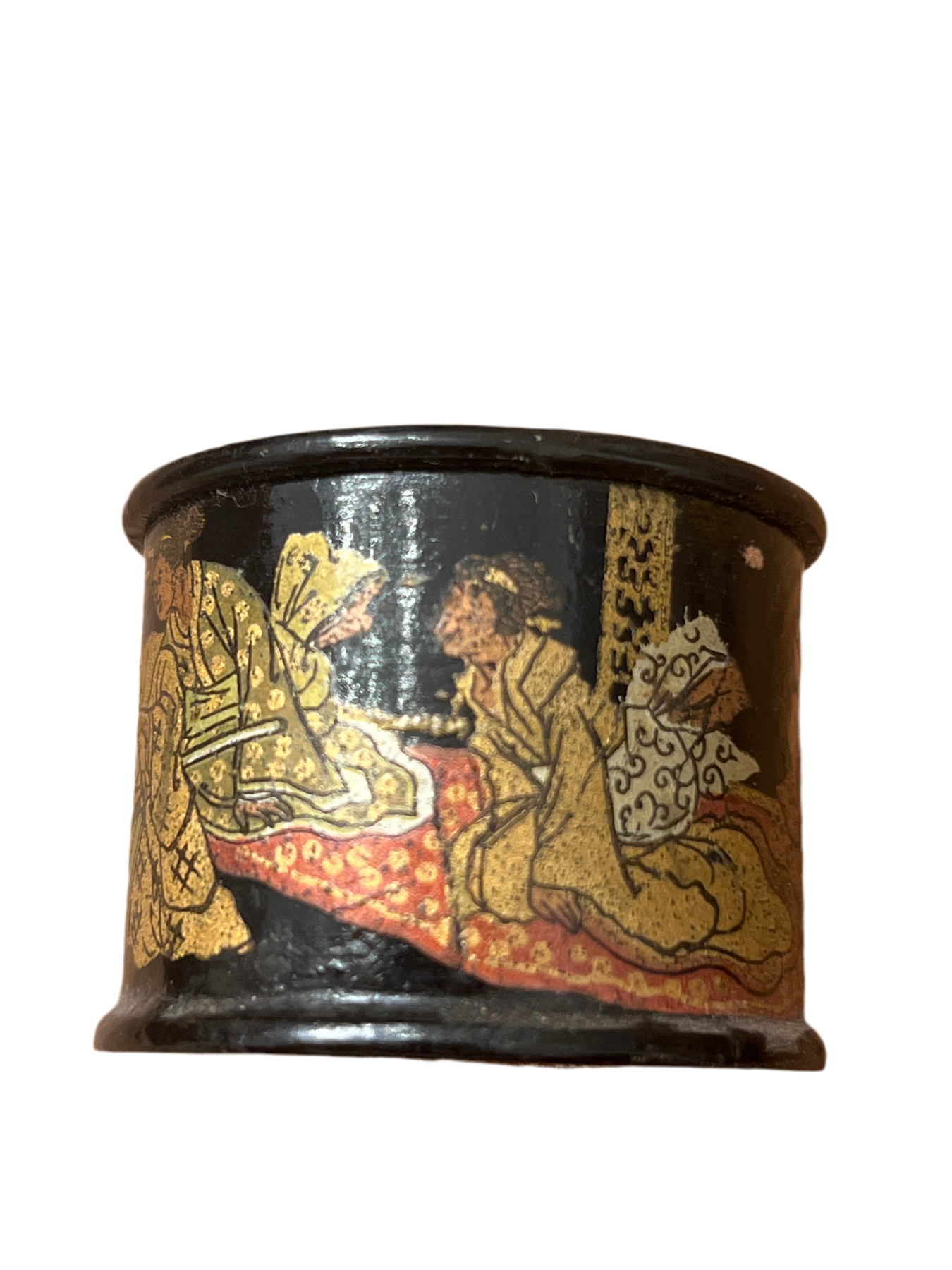 This Antique French Napoleon III Chinoiserie Lacquered Cylindrical Box from the 1800s showcases exquisite craftsmanship with intricate paintings, indicative of the period's artistic trends. Its excellent condition highlights the durability of lacquer finishes, making it a valuable addition for collectors of historical art and decorative objects. Measures 2” round.