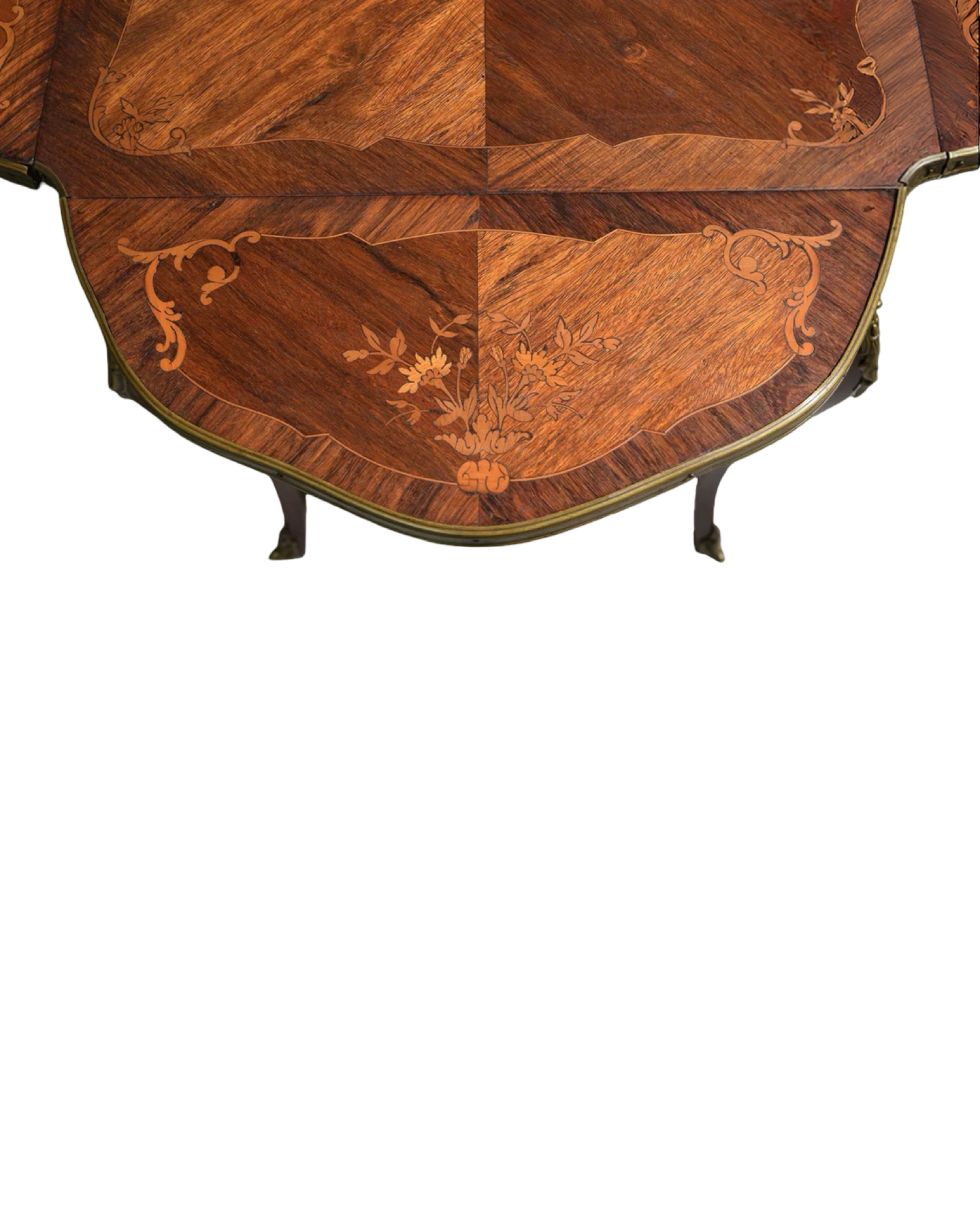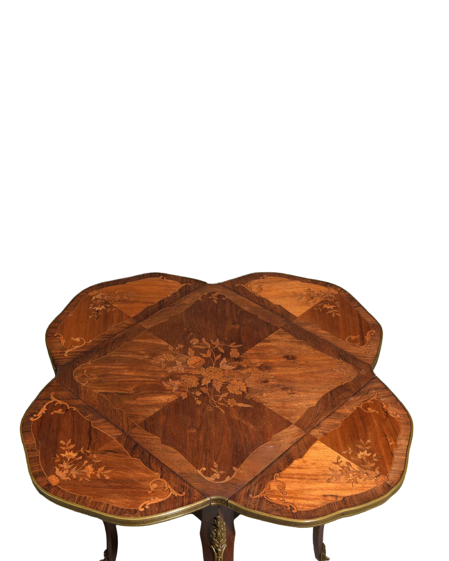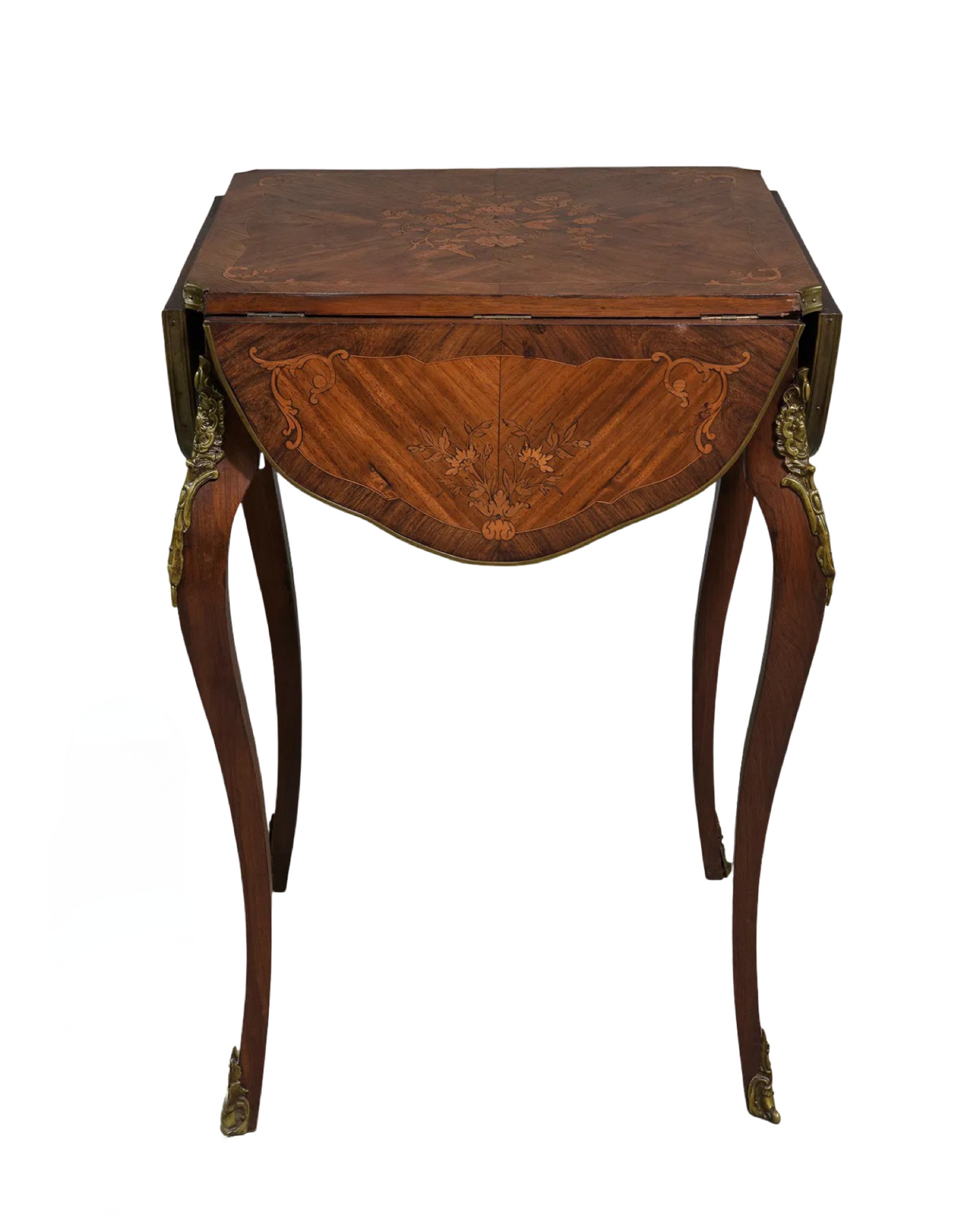 Elevate your living space with this exquisite French Marquetry Inlaid Walnut Drop Sided Table. Crafted with meticulous artistry, its intricate marquetry design showcases timeless elegance. The drop sides provide versatile functionality, allowing you to expand or save space with ease. Rich walnut wood ensures lasting durability while adding warm sophistication to any room. Perfect for both display and practical use, it brings a touch of vintage French charm and refined craftsmanship to your home. Measures: 29.25 in tall x 21.25 x 21.25, Leaves are 7.75 inches each - The surface or top of the table is 20 x 20 with the leaves down, c. 1910.