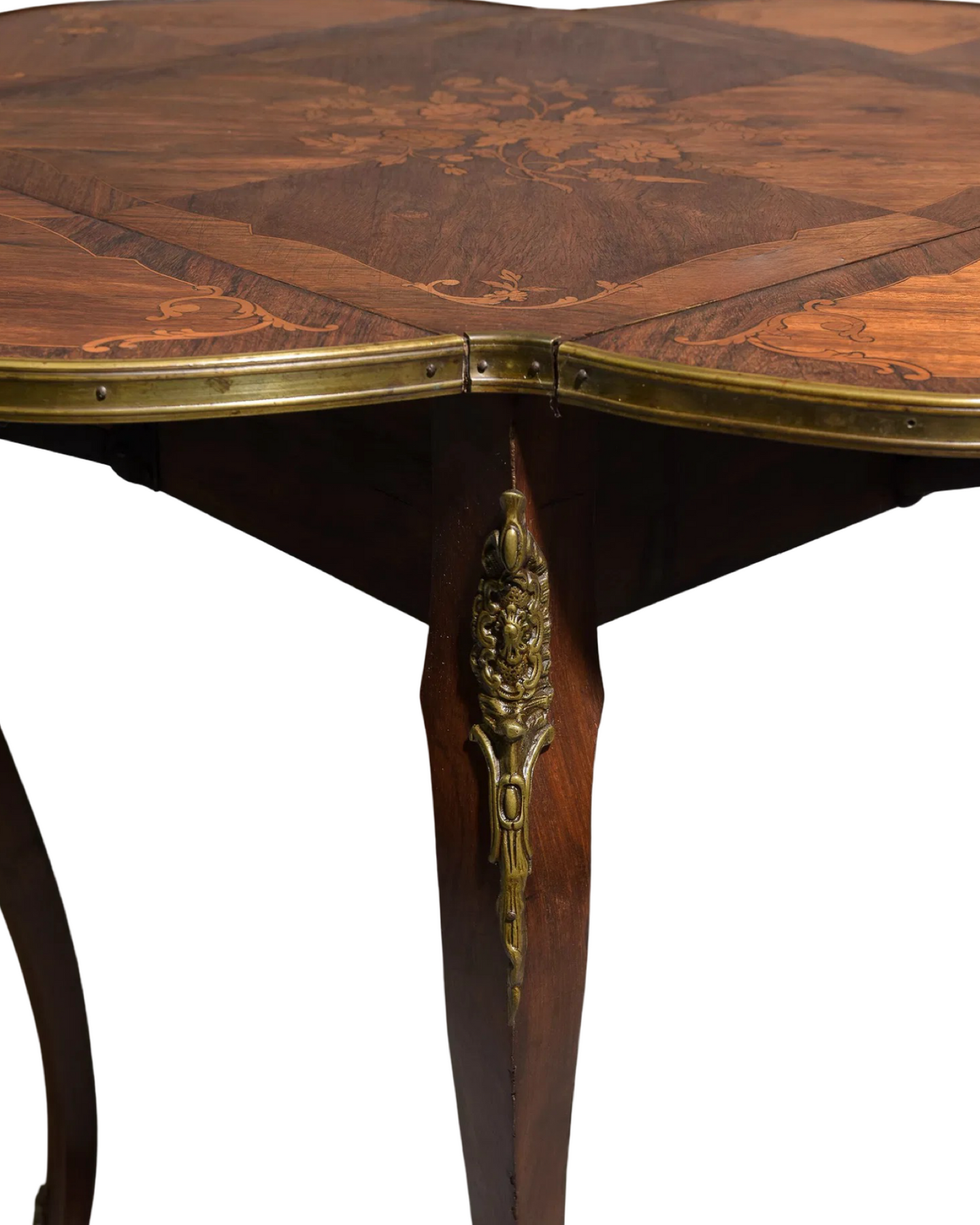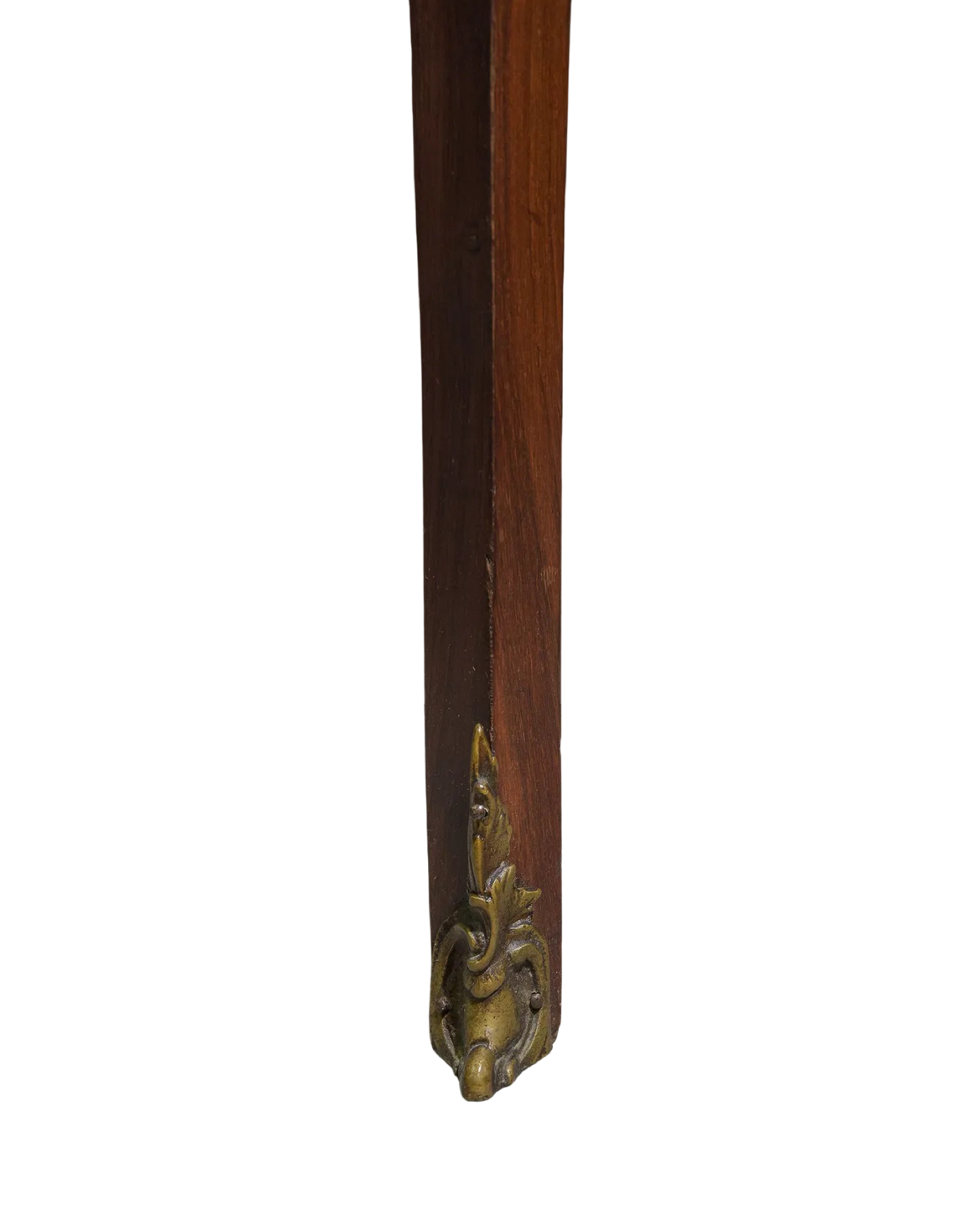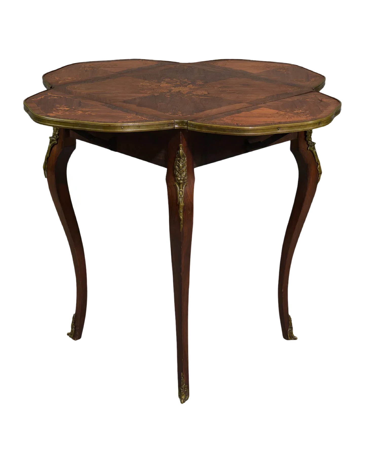 Elevate your living space with this exquisite French Marquetry Inlaid Walnut Drop Sided Table. Crafted with meticulous artistry, its intricate marquetry design showcases timeless elegance. The drop sides provide versatile functionality, allowing you to expand or save space with ease. Rich walnut wood ensures lasting durability while adding warm sophistication to any room. Perfect for both display and practical use, it brings a touch of vintage French charm and refined craftsmanship to your home. Measures: 29.25 in tall x 21.25 x 21.25, Leaves are 7.75 inches each - The surface or top of the table is 20 x 20 with the leaves down, c. 1910.
