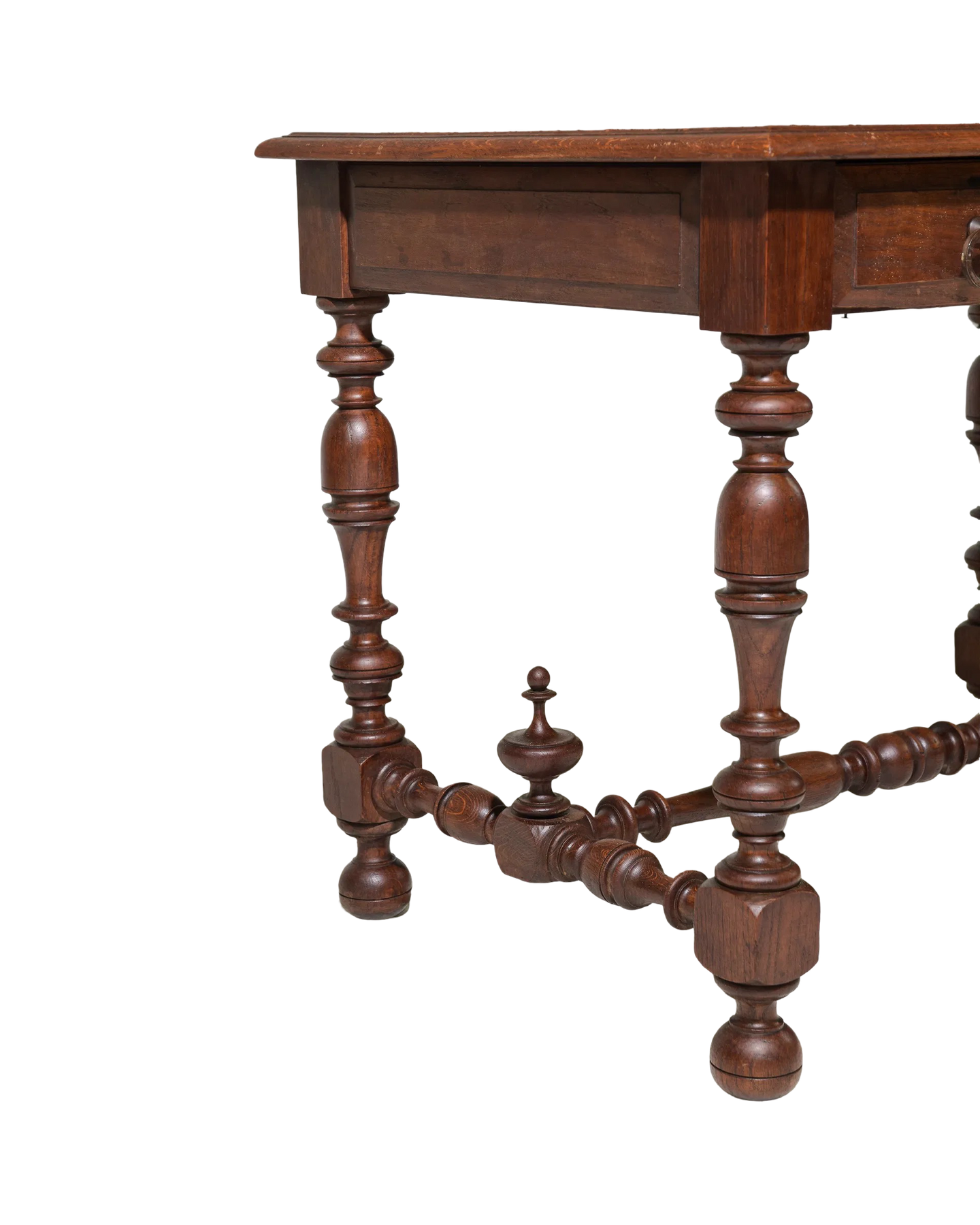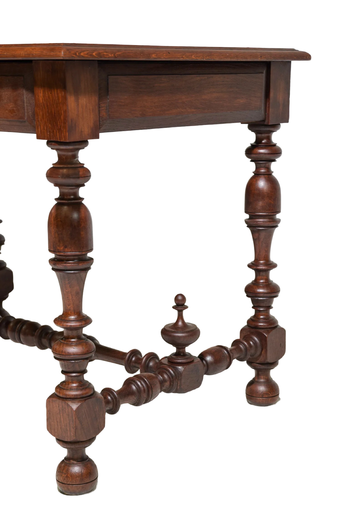 Step back in time with this charming Antique Henri II Needlepoint Top Writing Table from circa 1890. Its delicately crafted needlepoint surface invites your creativity while offering a stylish spot to pen your thoughts or conquer your to-do list. Perfect for adding a touch of vintage whimsy to any room, this delightful piece blends history and function with flair.  Measures: 28.5 in tall x 39.5 x 25.5, Floor to under is 23.5 inches and the space between the legs is 32.25 inches.