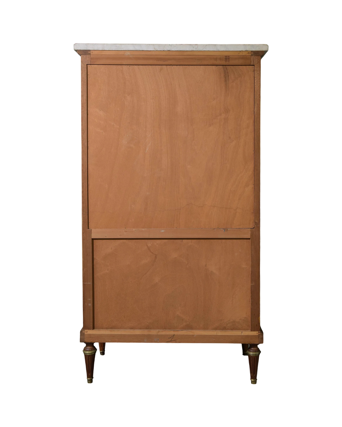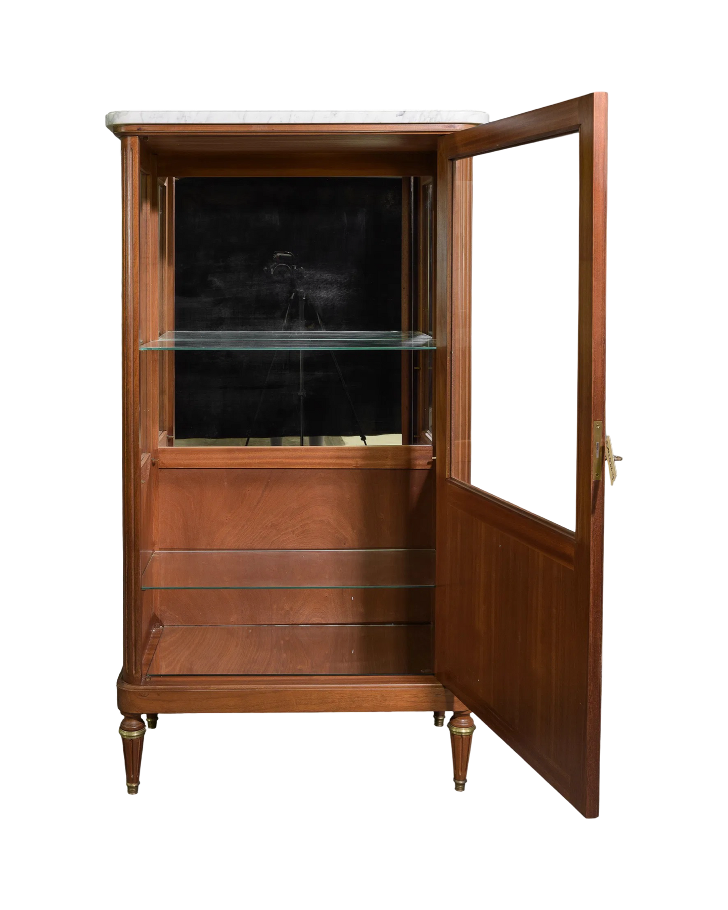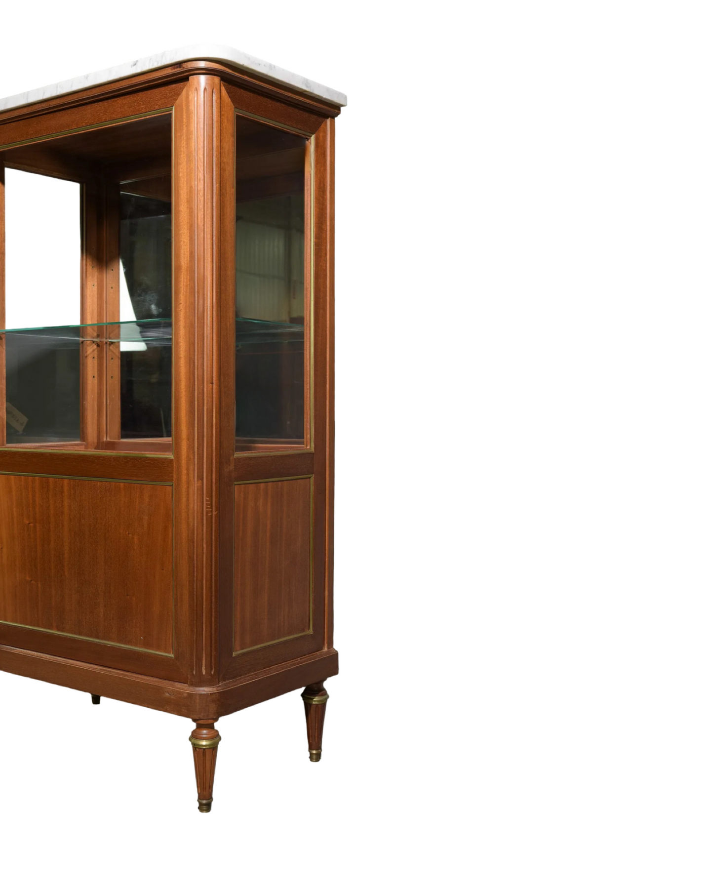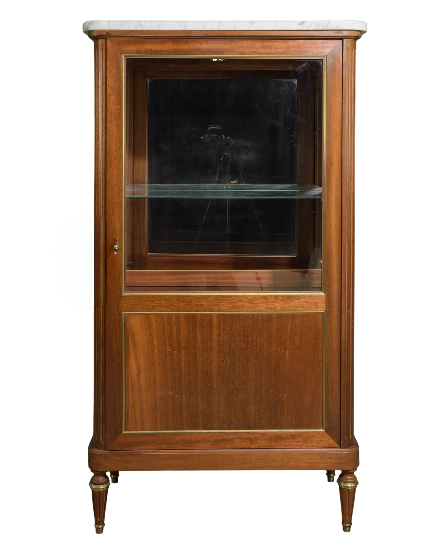 Step back in time with this charming Antique Louis XVI Style Vitrine, featuring a sleek white marble top that adds a touch of classic elegance to any room. Its graceful lines and refined design make it the perfect showcase for your treasured collectibles or favorite curios. Whether in a cozy living room or a stylish hallway, this cabinet brings a dash of history with a playful flair to your décor. Measures: 61 in tall x 34 x 19, c. 1920.