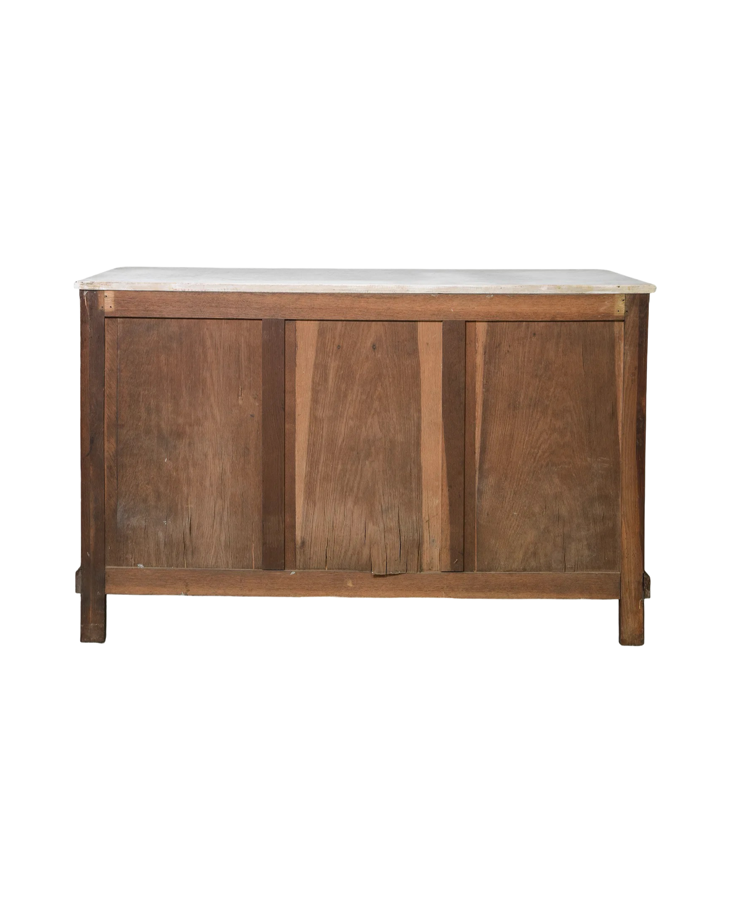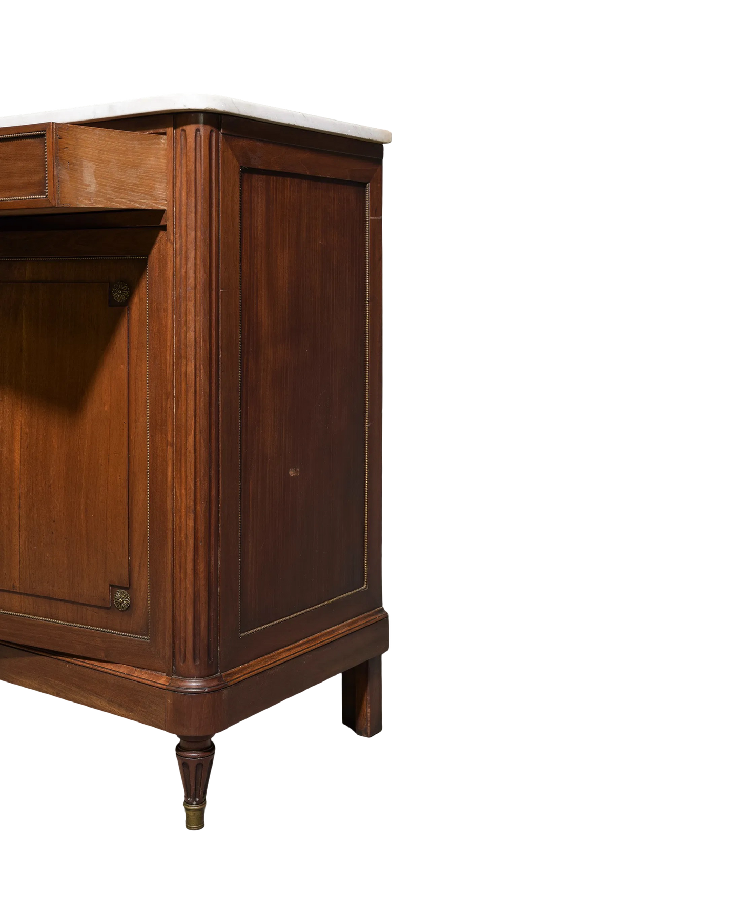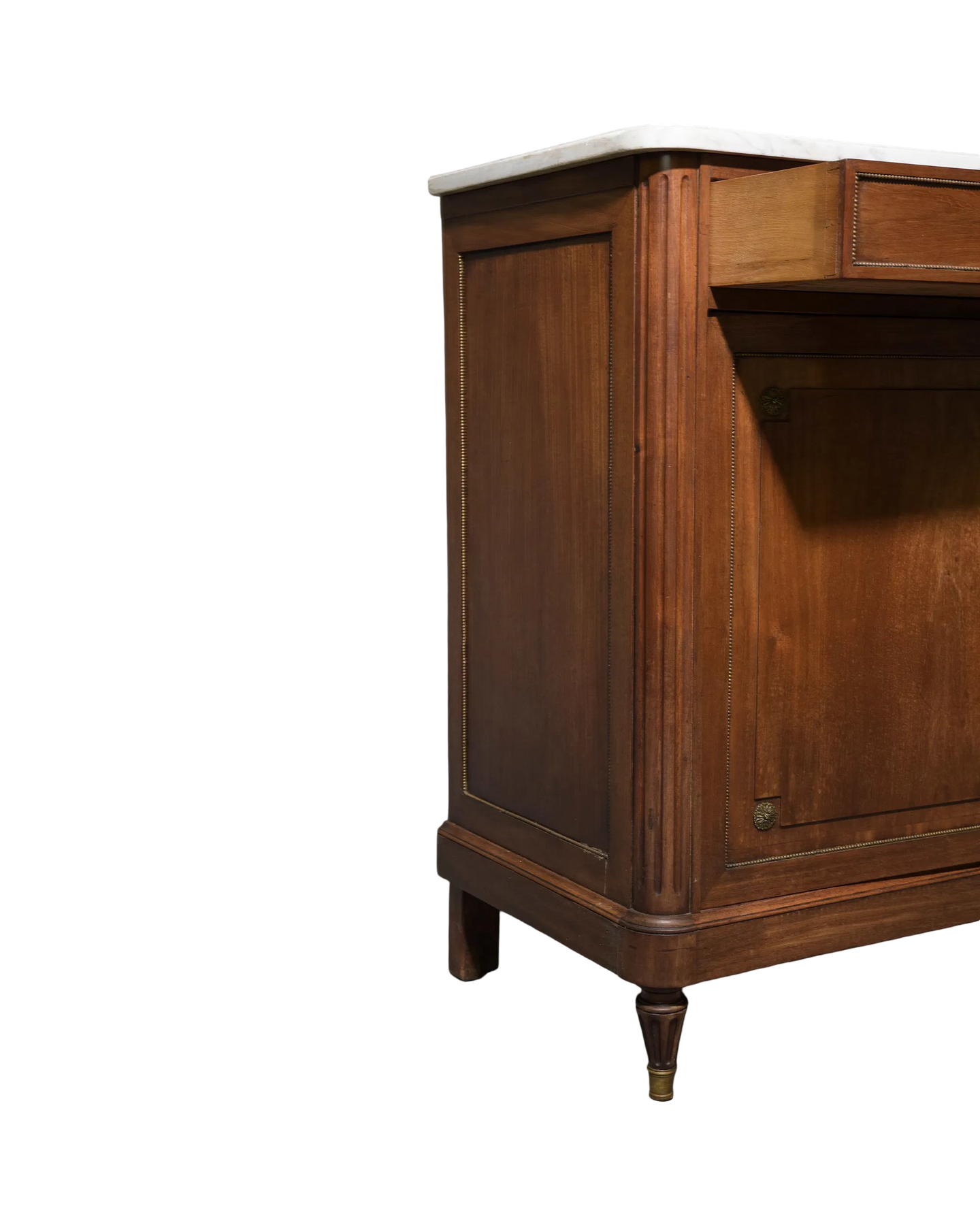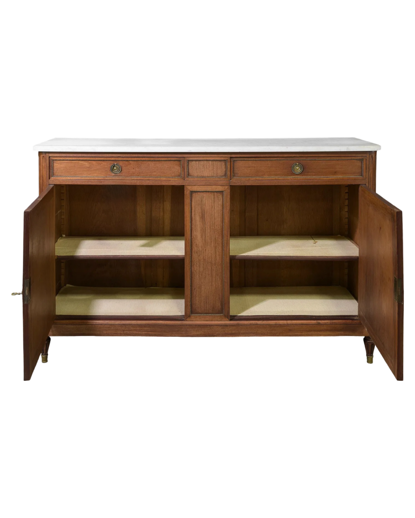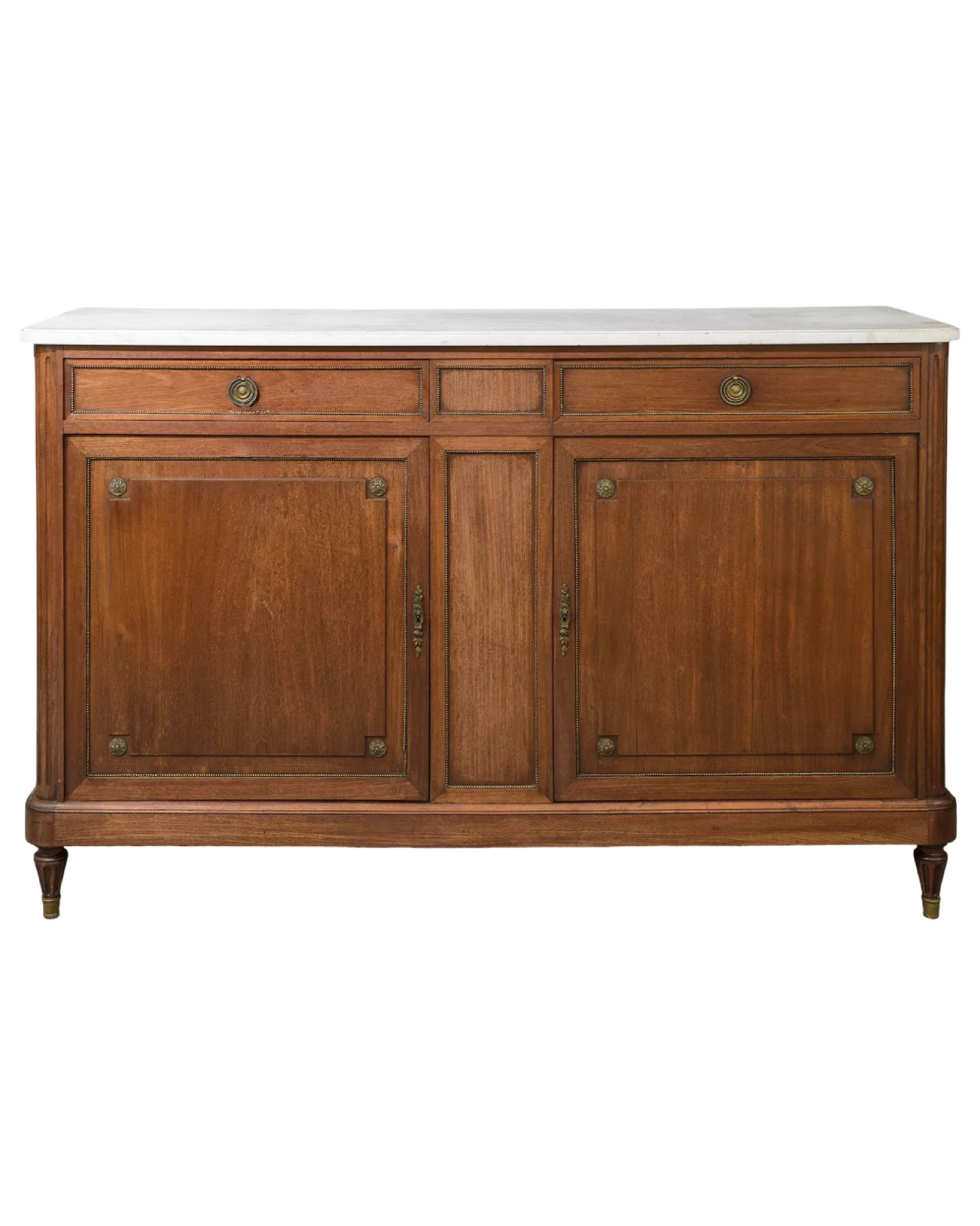 Elevate your living space with this Antique Louis XVI Buffet featuring an elegant white marble top. Crafted to embody timeless sophistication, it offers both exquisite style and functional storage. The marble surface provides a durable, easy-to-clean area perfect for serving or display, while the classic Louis XVI design adds a refined touch to any room. This piece is ideal for those seeking to blend history with everyday elegance in their home. Measures: 39 in tall x 61 x 19