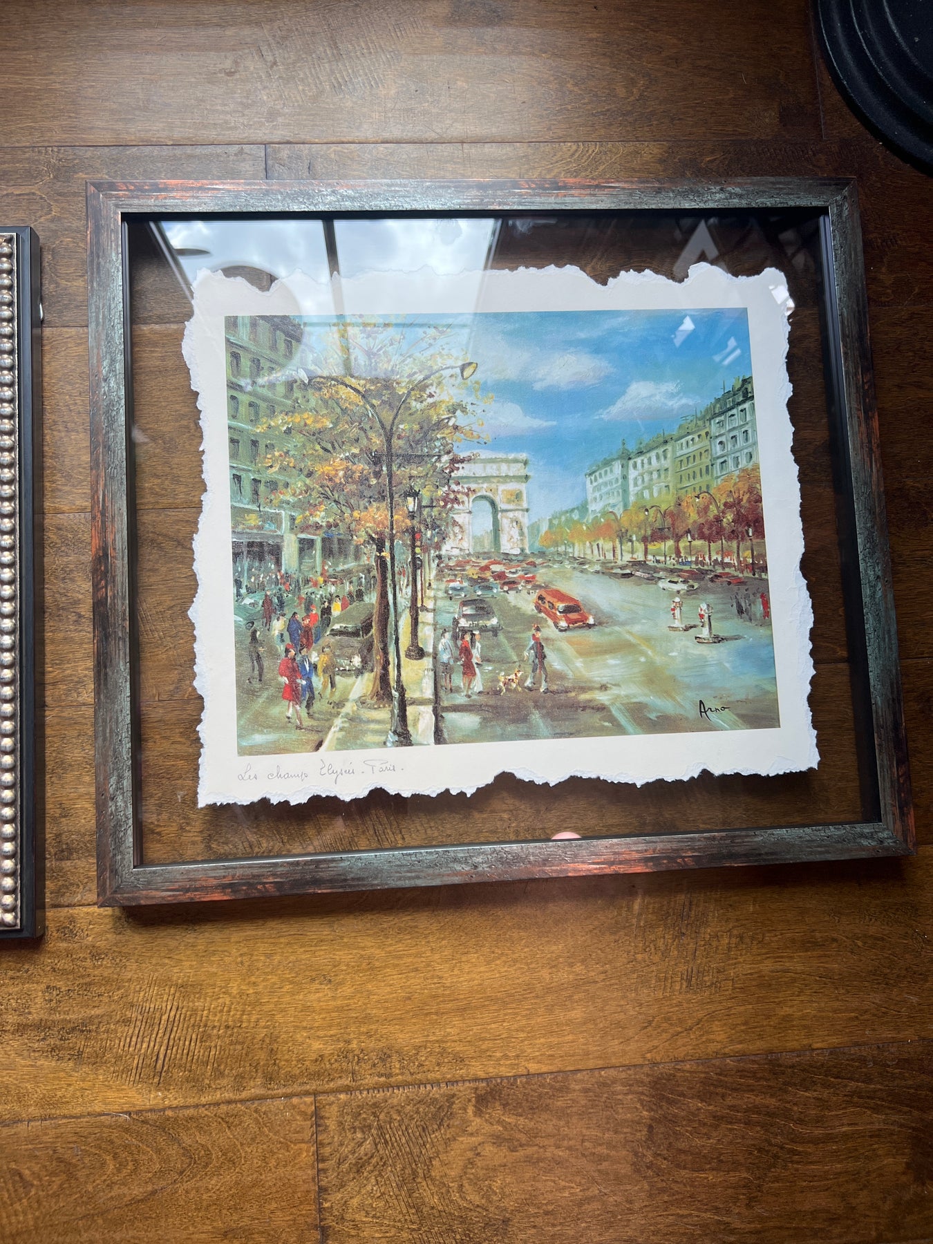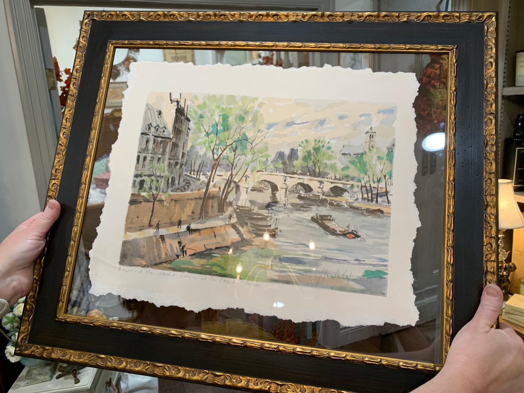 These antique hand-colored watercolor lithographs depict beautiful Parisian scenes. Each piece has been custom framed in a floating glass wooden frame. Measuring approximately 23" wide x 18” tall x 1.125” deep. Choose from 3 different scenes of Paris Notre Dame et les Bouquinistes (antiquarian booksellers) , Tour Eiffel Pon de Alexandere III, and Paris - Place du Tetre.