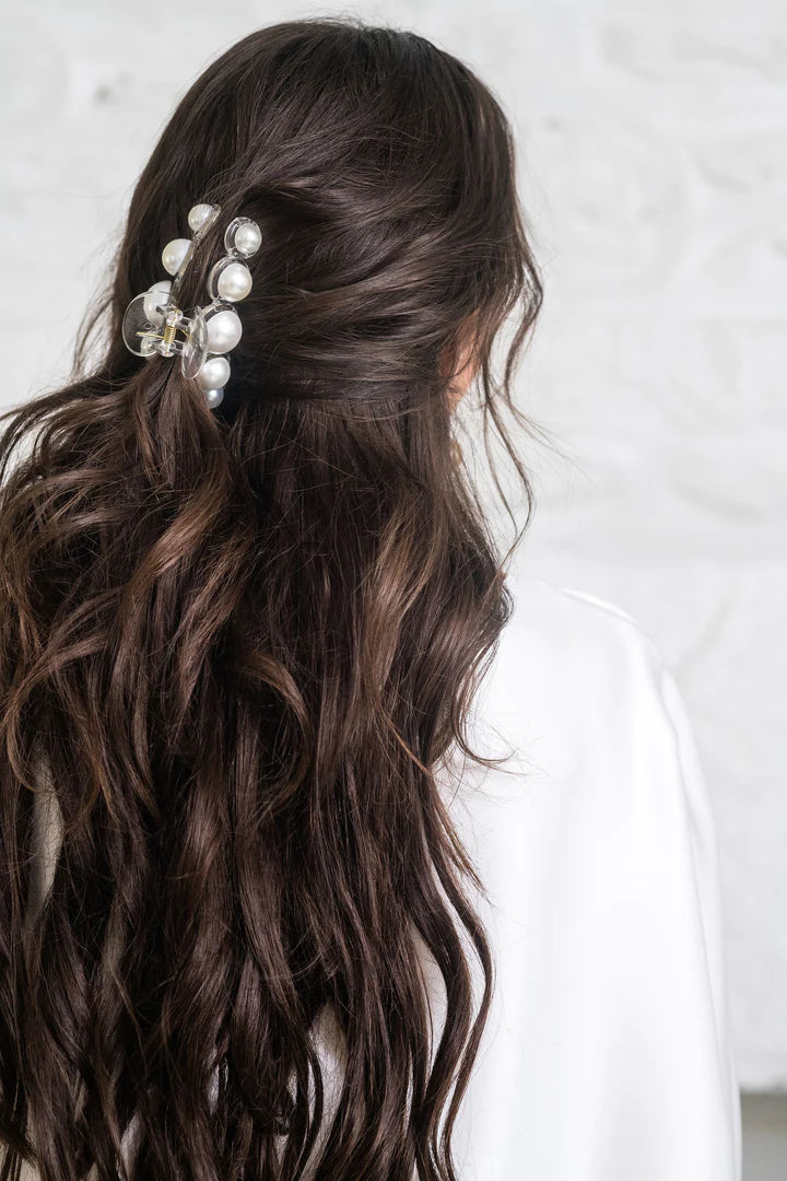 Add a little something extra to a casual up 'do with this translucent claw clip featuring oversized pearls.