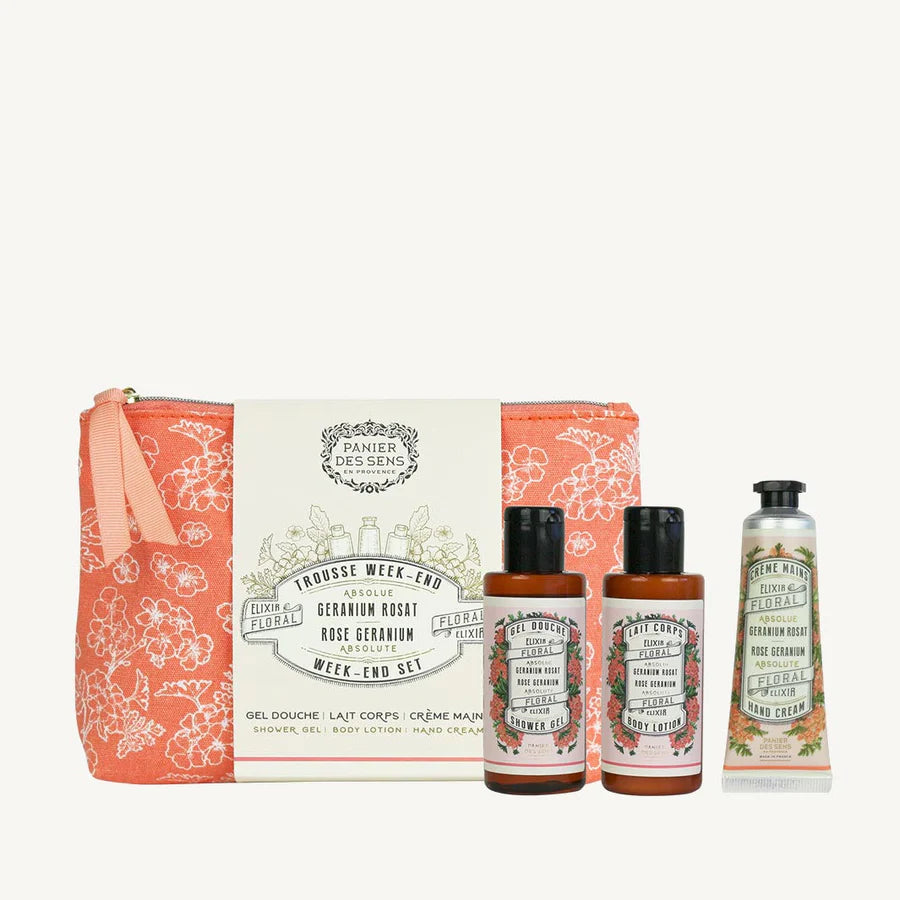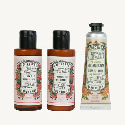Shower gel 70ml, Body milk 70ml (2 x 2,5 FL.OZ.), Hand cream 30ml (1 FL.OZ.)