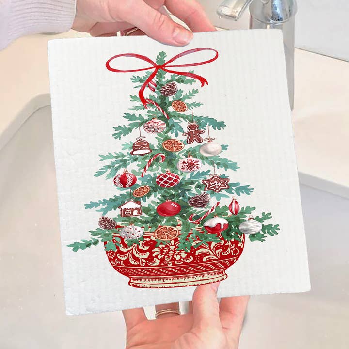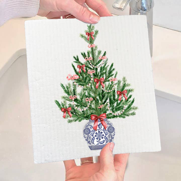 Bring festive flair to your kitchen with this charming Swedish dishcloth featuring an elegant chinoiserie Christmas tree design. Perfect for the holidays, this absorbent, durable cloth tackles dishes and spills with style. The whimsical blend of Asian-inspired artistry and yuletide cheer makes it a delightful addition to your seasonal décor—or a thoughtful gift for the design-loving cook in your life. Reusable and eco-friendly, it's the festive essential that keeps on giving.
