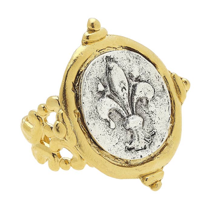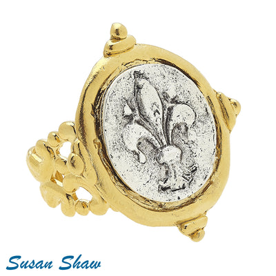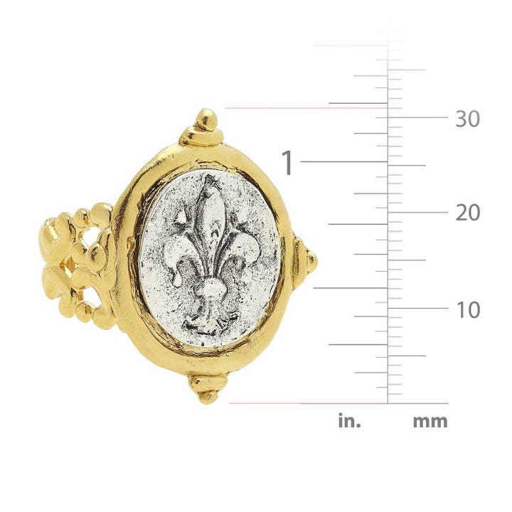 Silver Fleur de Lis intaglio on a gold filigree band.