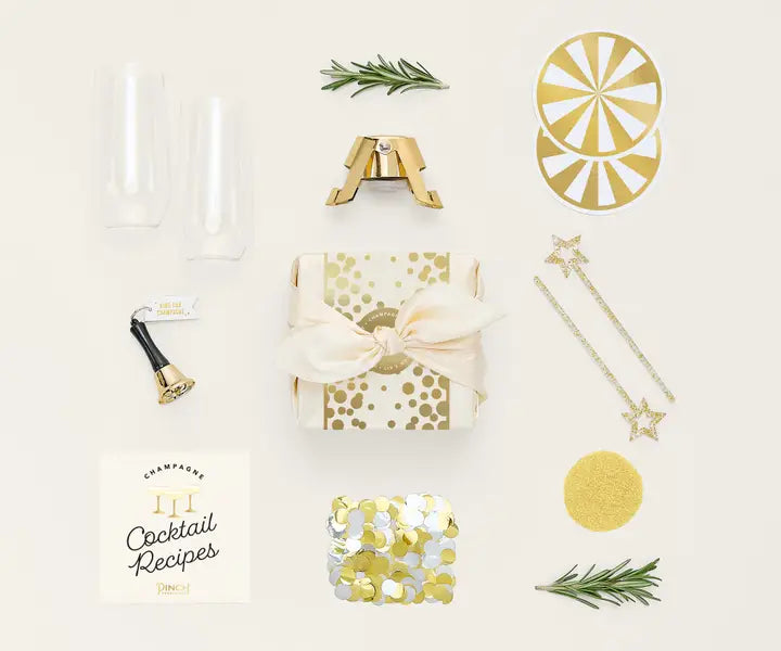 You'll be raising a glass to these 11 must-haves, including 2 mini stemless champagne glasses, a bottle stopper, confetti, coasters (2), swizzle sticks (2), edible gold glitter, a champagne cocktail recipe booklet, and a "ring for champagne" bell.