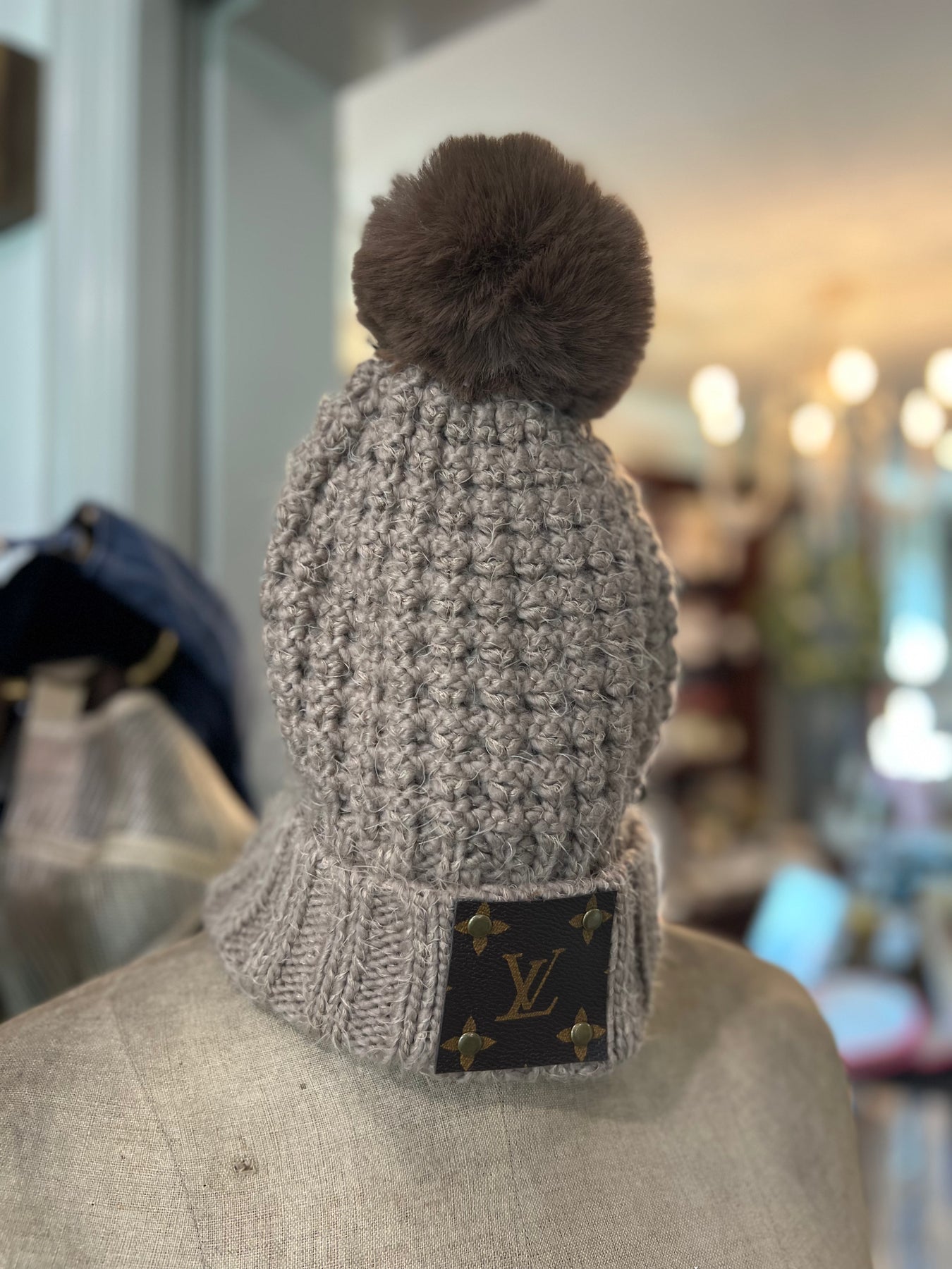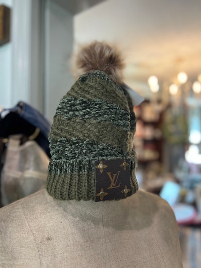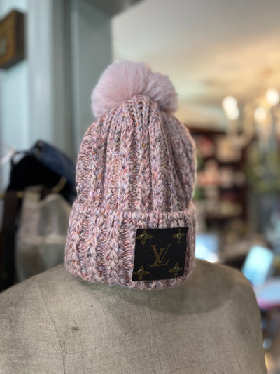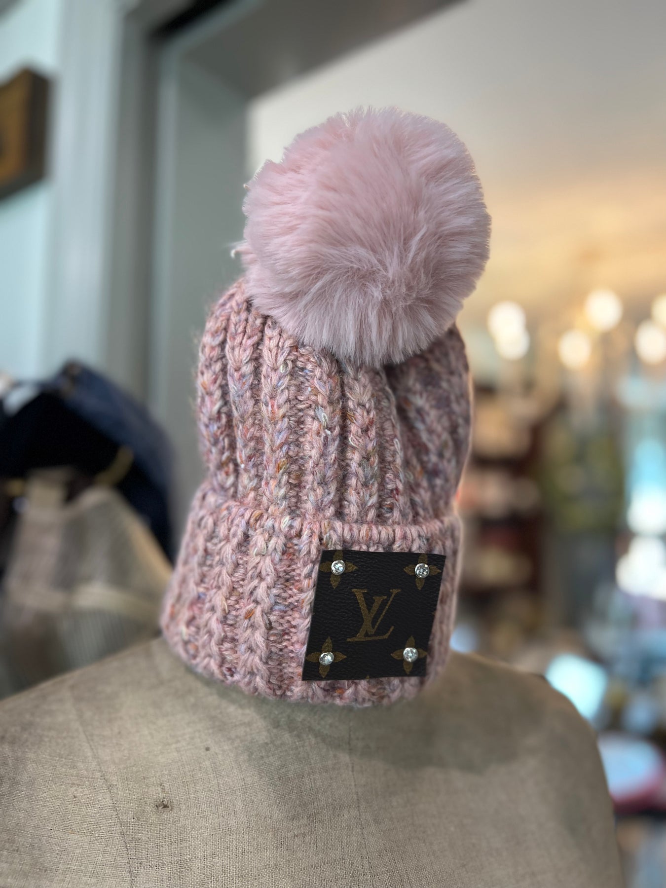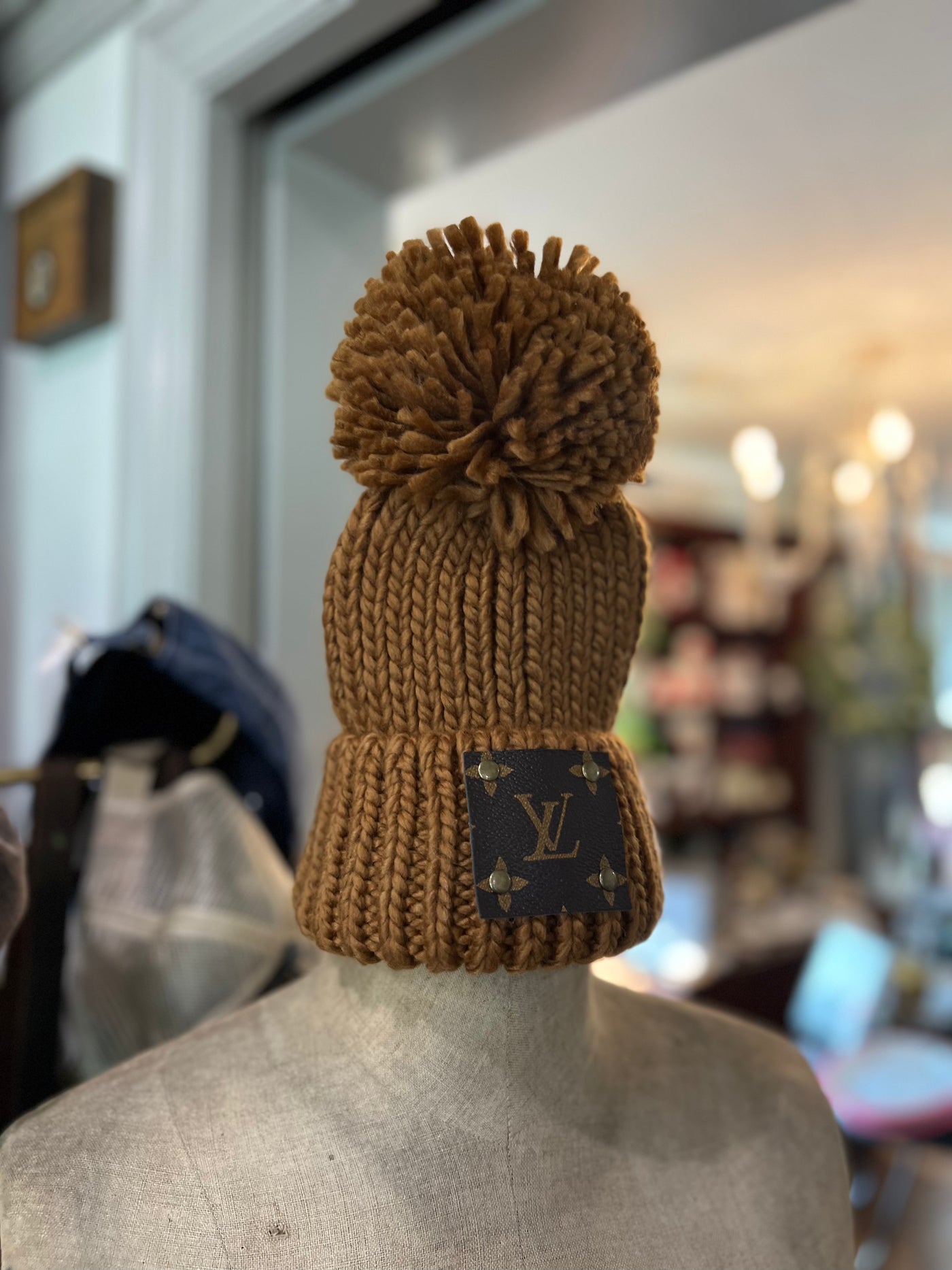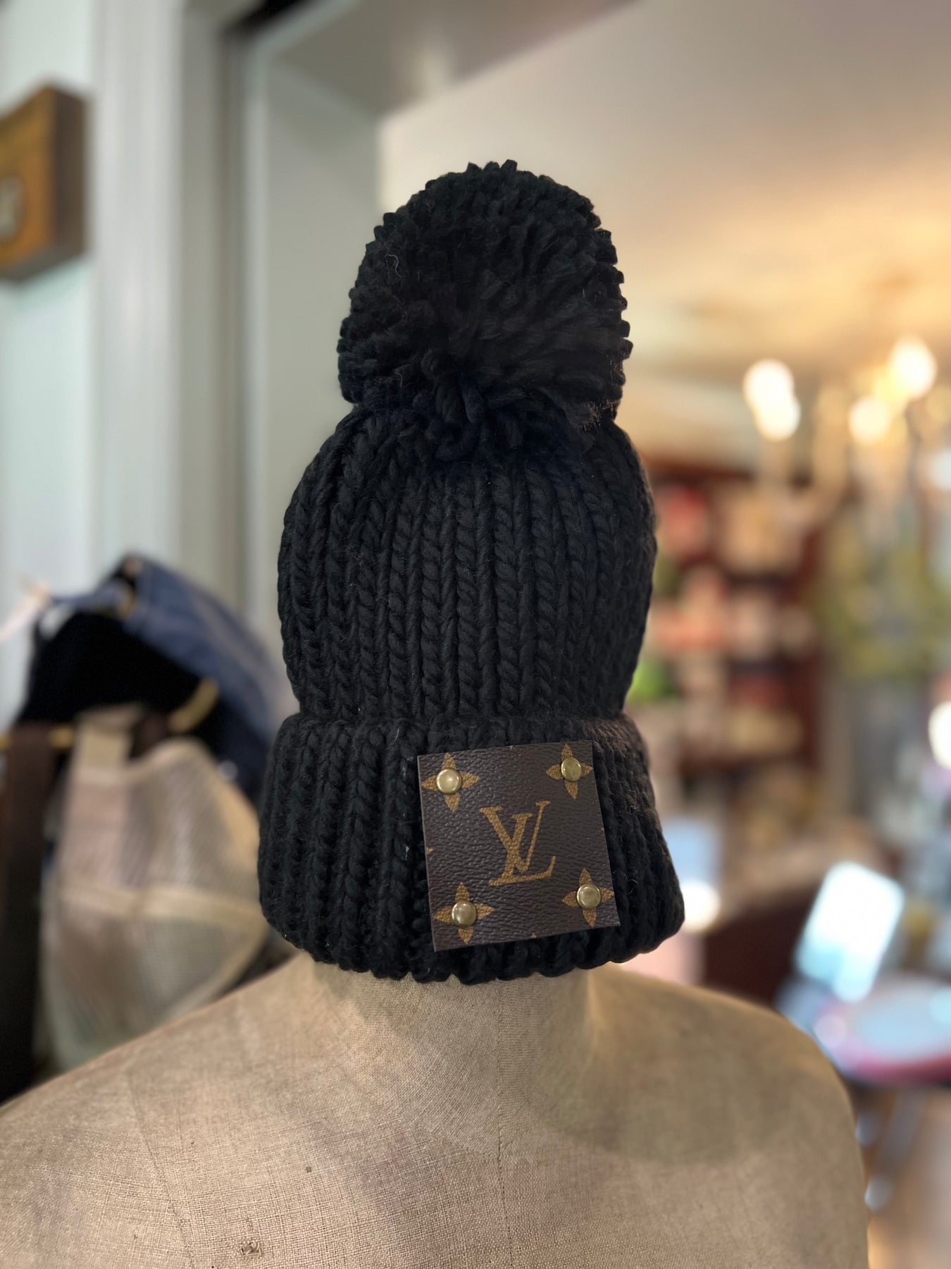 These upcycled fashion pom pom beanies feature LV patches in different color combinations to choose from.