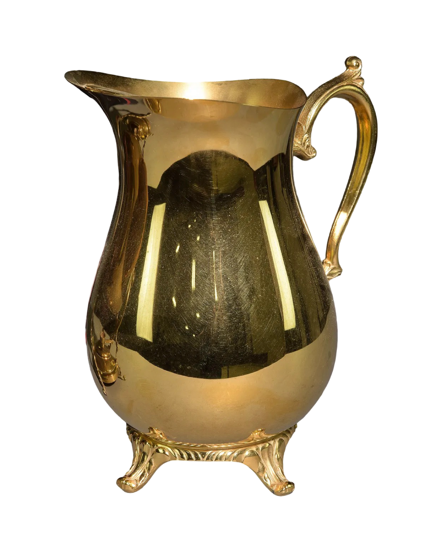 Elevate your serving experience with this exquisite Vintage 24k gold electroplated silver pitcher and coffee pot hand-selected in England. Combining timeless elegance with durable craftsmanship, it adds a luxurious touch to any table setting. Perfect for impressing guests or enhancing your daily ritual, this piece blends classic style with practical use, making every pour a statement of sophistication.  Measures approximately 13 in tall x 9 x 10.  Sold Individually.