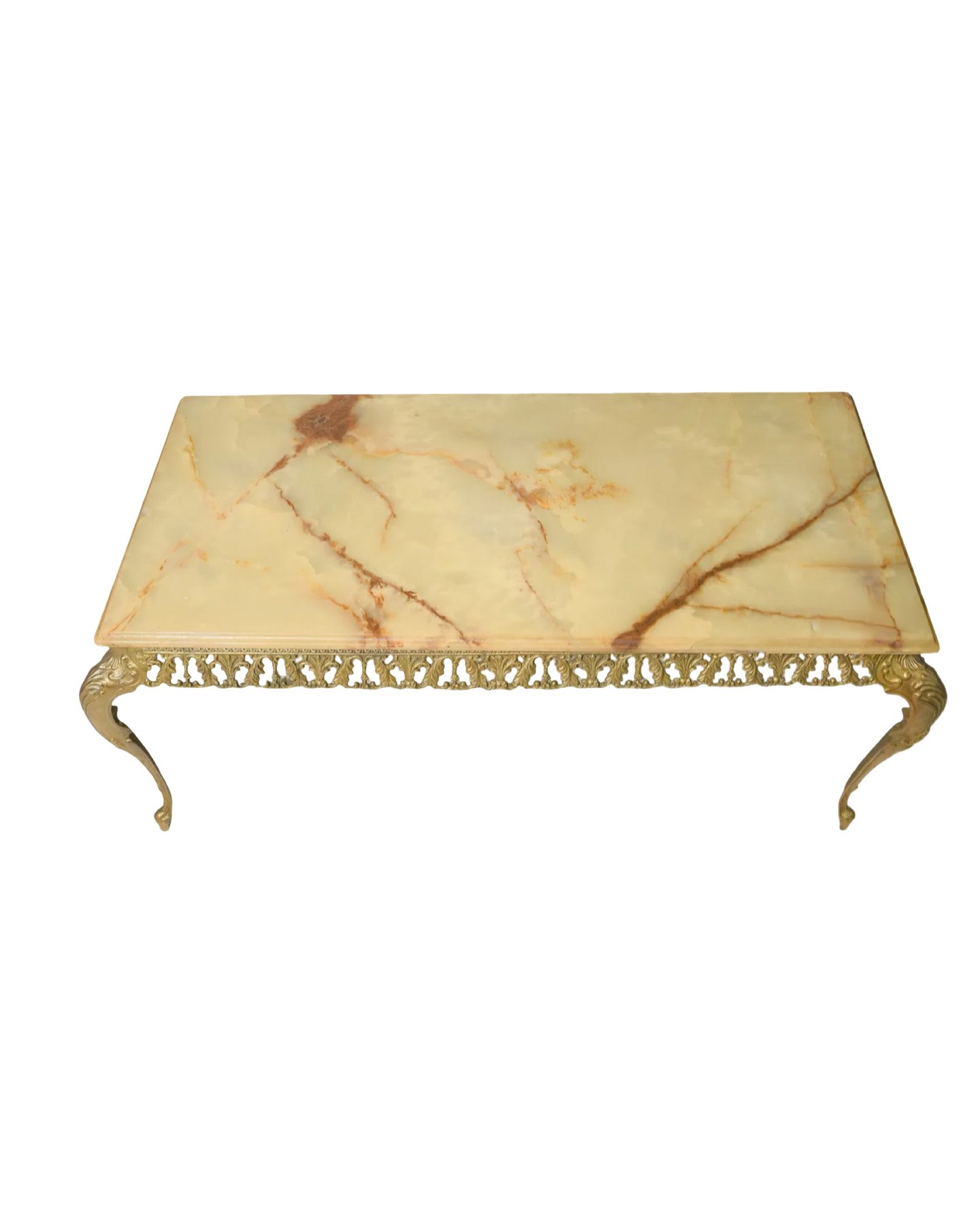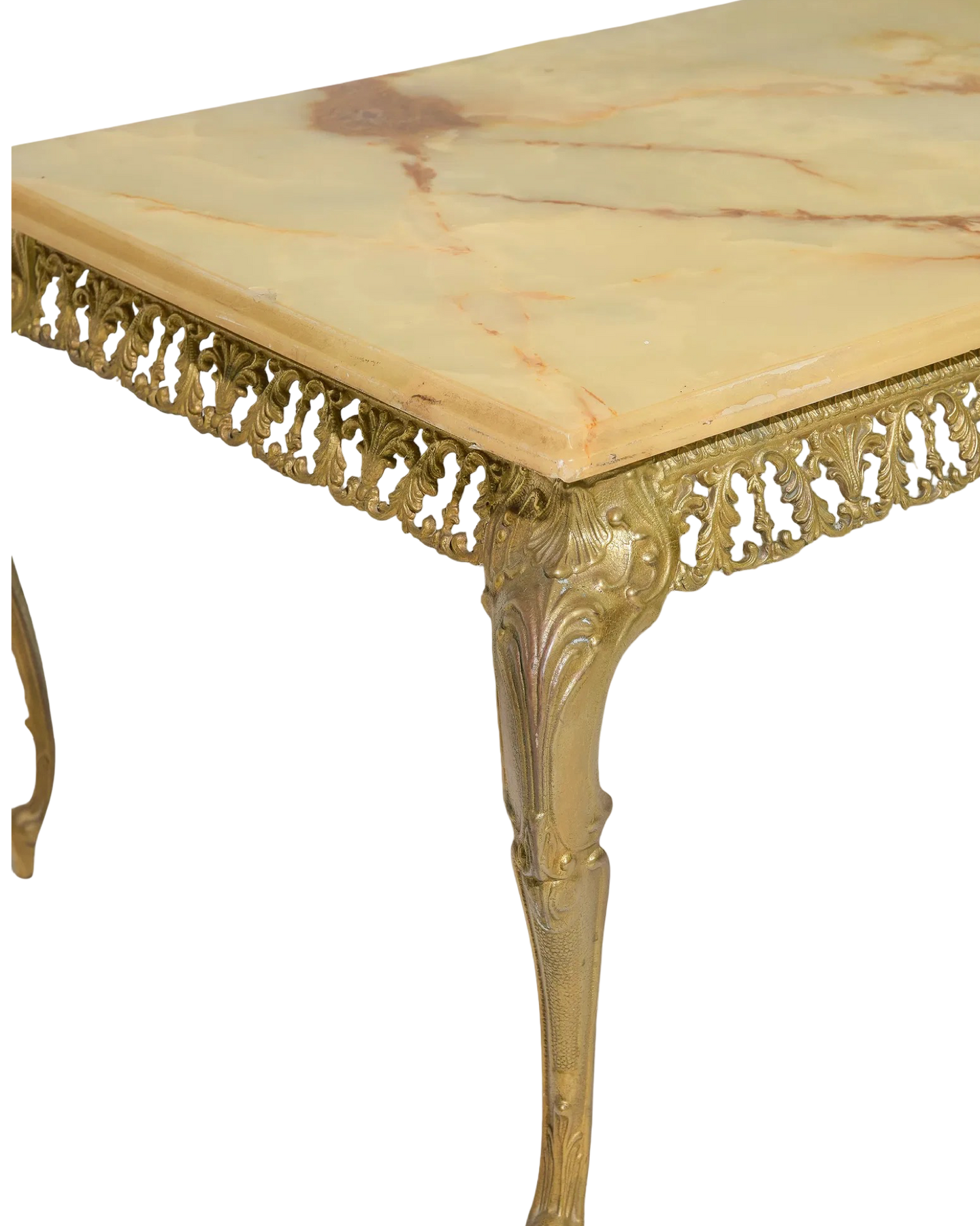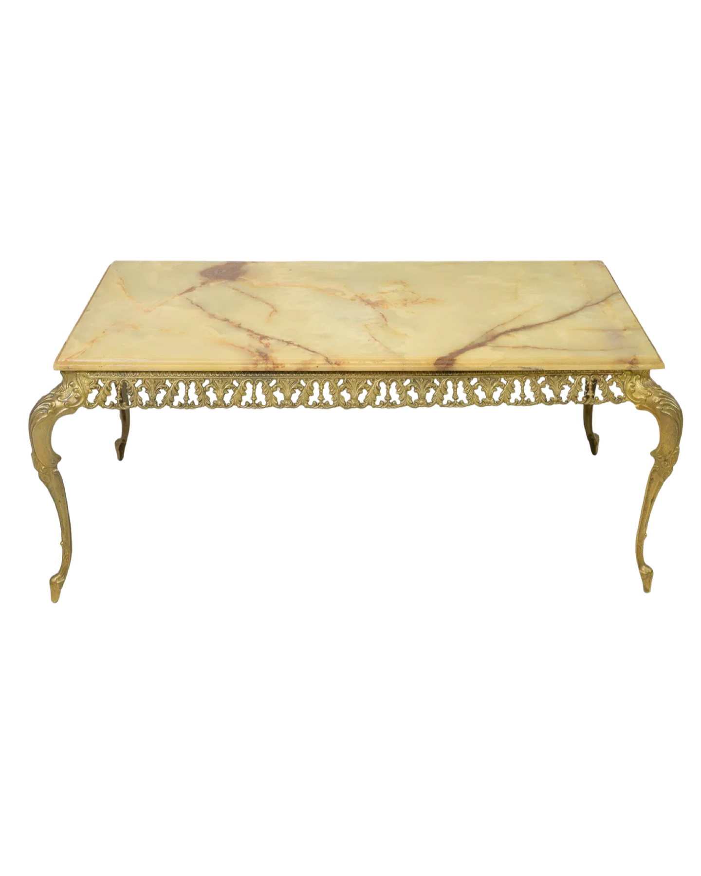 Elevate your living space with this Vintage French Brass Coffee Table, featuring a luxurious Italian Onyx top. The warm brass frame pairs beautifully with the rich onyx surface, offering timeless elegance and a unique centerpiece for any room. Its sturdy construction ensures lasting quality, while the exquisite materials bring an air of refined sophistication to your décor. Perfect for adding a touch of vintage charm and vibrant style to your home. Measures: 17 in tall x 41 x 21.