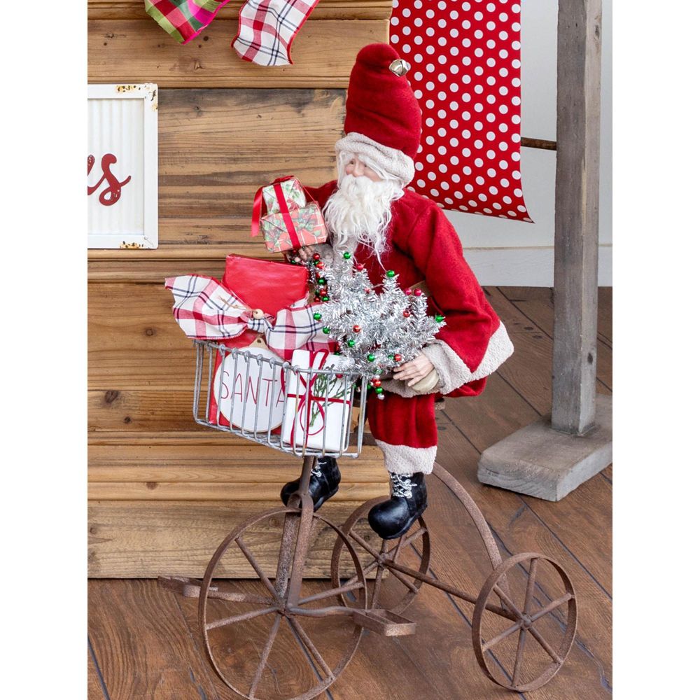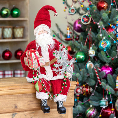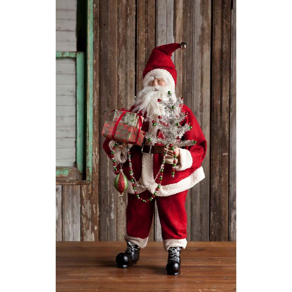 With flexible legs that bend, this vintage Santa adds holiday cheer wherever he sits or stands. Featuring beautiful details, this Santa holds a tinsel tree, packages, beaded garland, and an ornament.